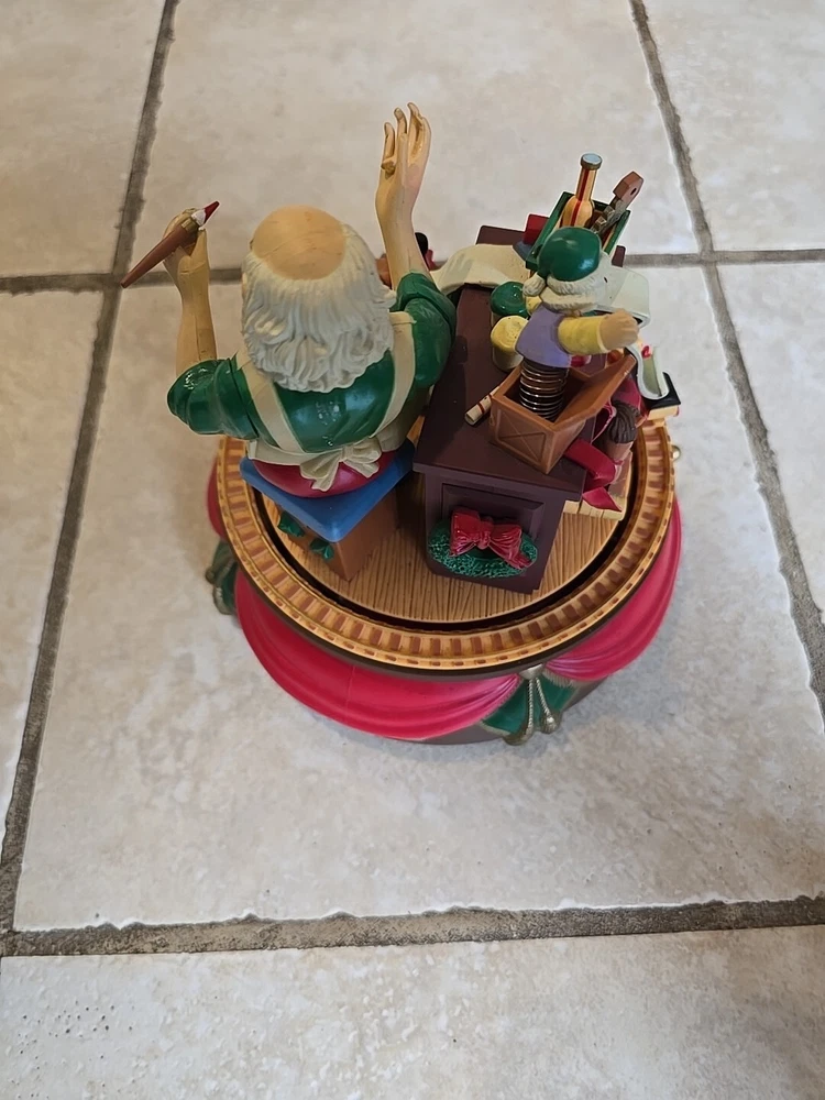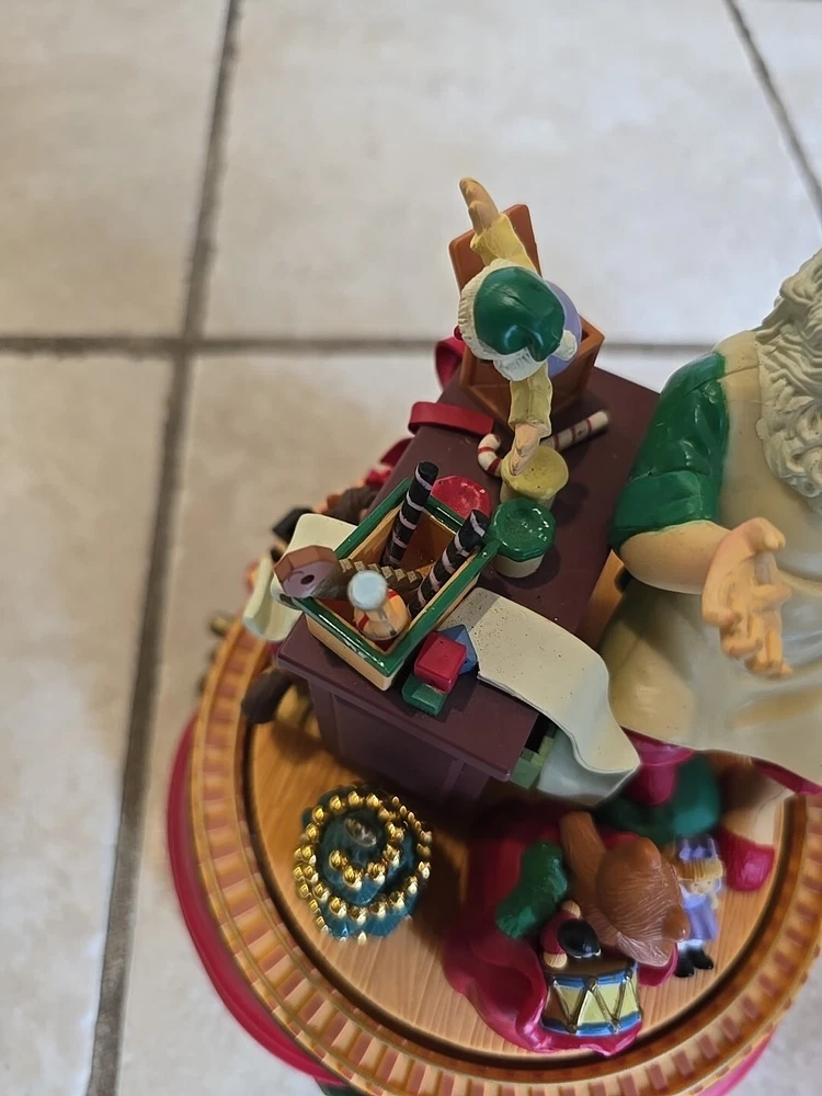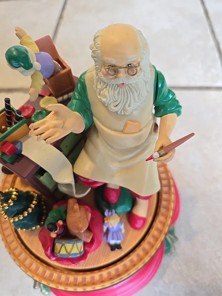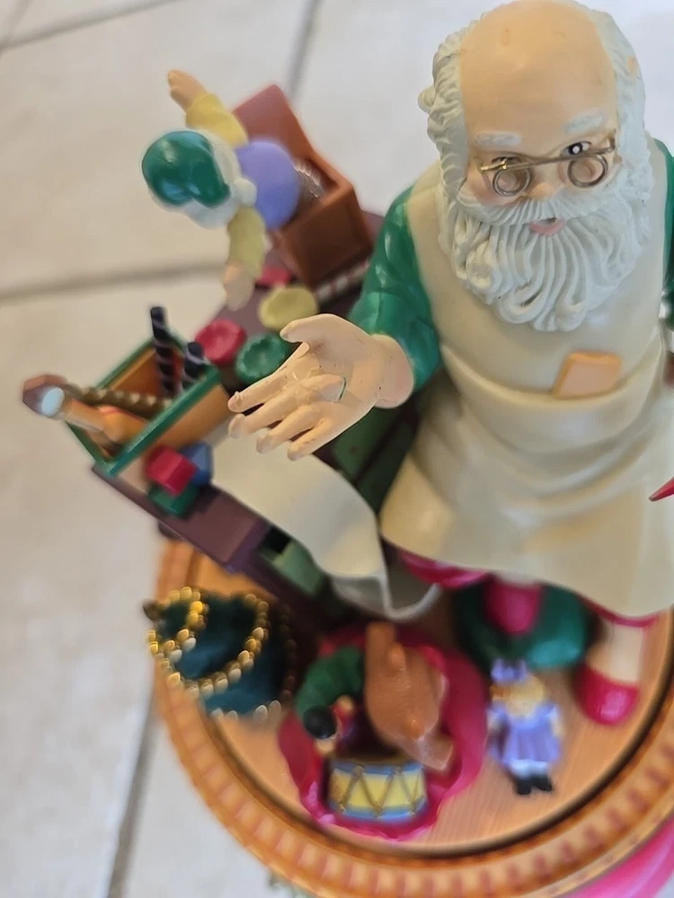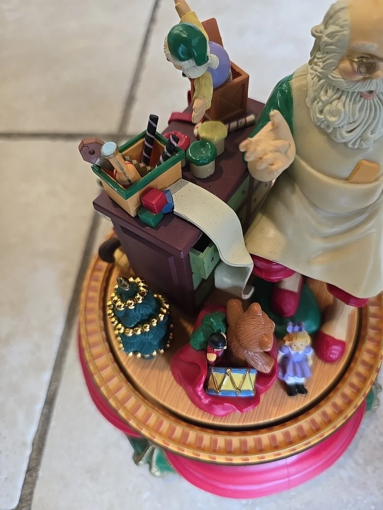 Vintage 1992 Santa's Best Animated Music Box Christmas Santa Claus Wind Up. Tested and in great working condition. The whole thing spins. The Christmas tree also spins independently. Santas painting hand goes up and down. The clown goes in and out of the box. Everything works on it as it should. Unfortunately, Santa is missing the little bird house in his hand. Otherwise, everything appears to be in good cosmetic condition. Please see the pictures for the condition. Shipped with USPS. Thanks for looking.