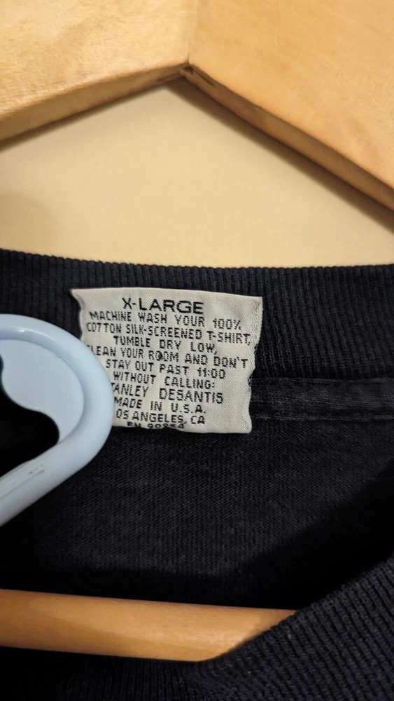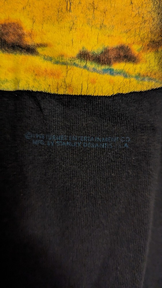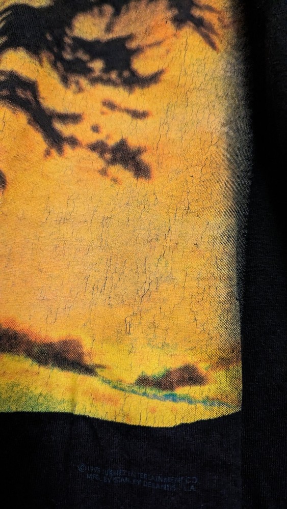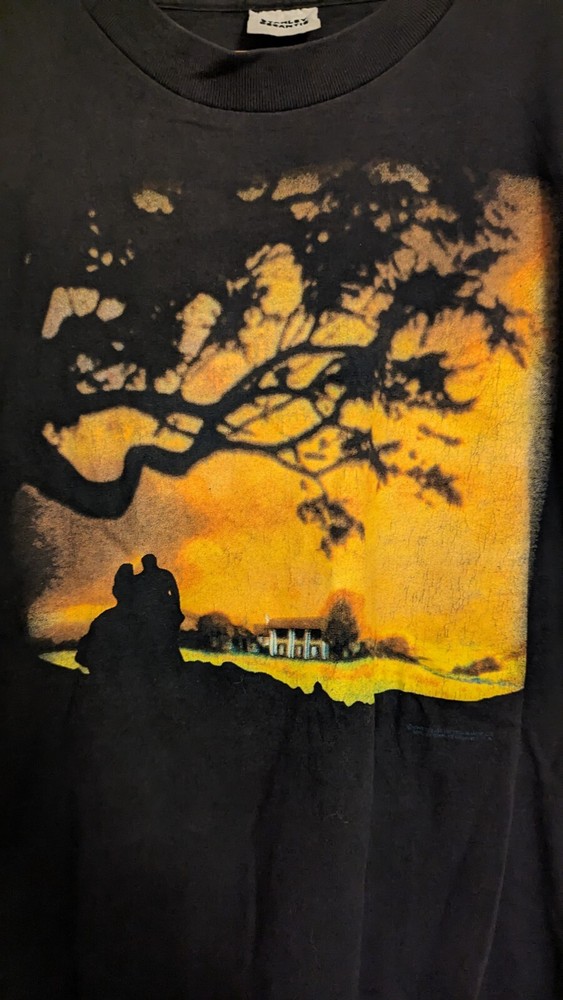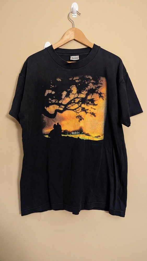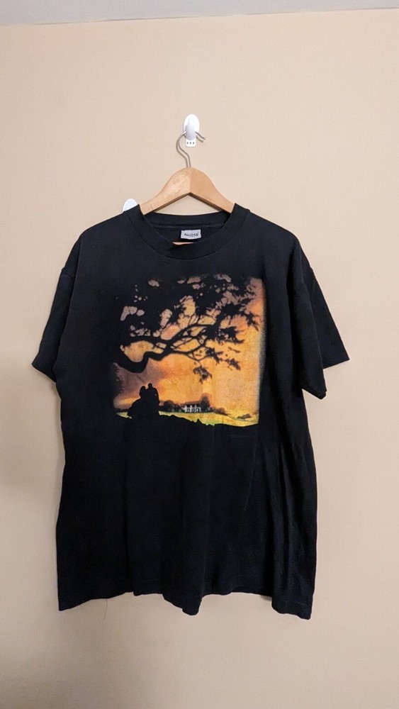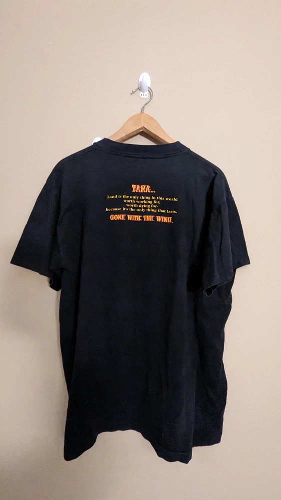 This vintage t-shirt is a rare find for any fan of the classic 90s movie, Gone with the Wind. The shirt features the iconic logo of the movie on a solid black cotton fabric, with a crew neck and short sleeves. It is a size XL and was manufactured in the United States in the 1990s by Stanley Desantis. The shirt is a great addition to any collection, and perfect for casual wear in any season. It has a regular fit and is machine washable for easy care. Don't miss your chance to own this piece of movie memorabilia. 24x30
