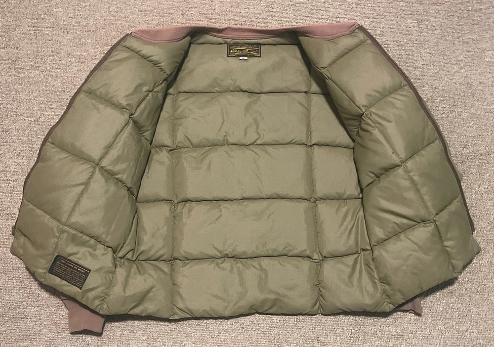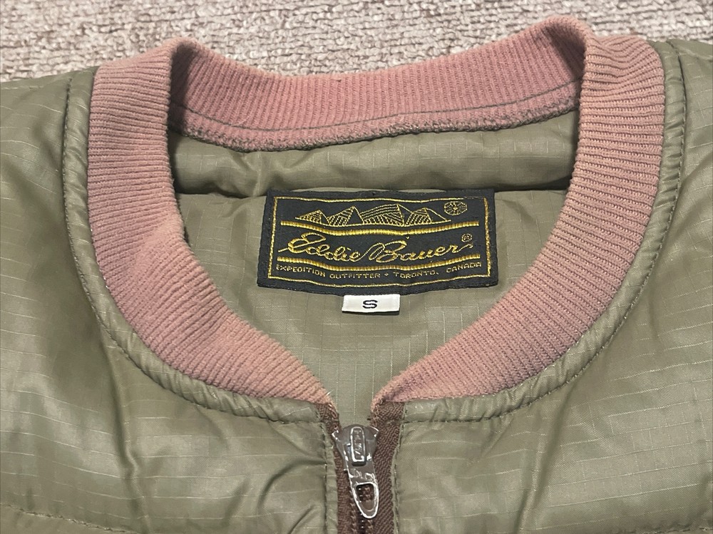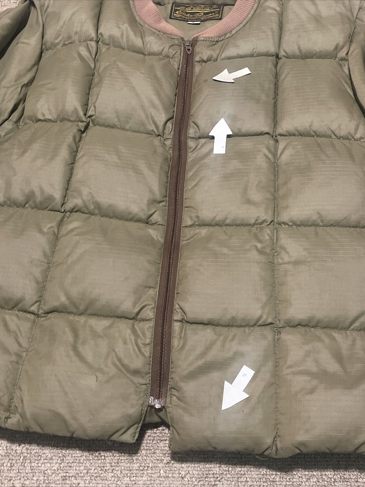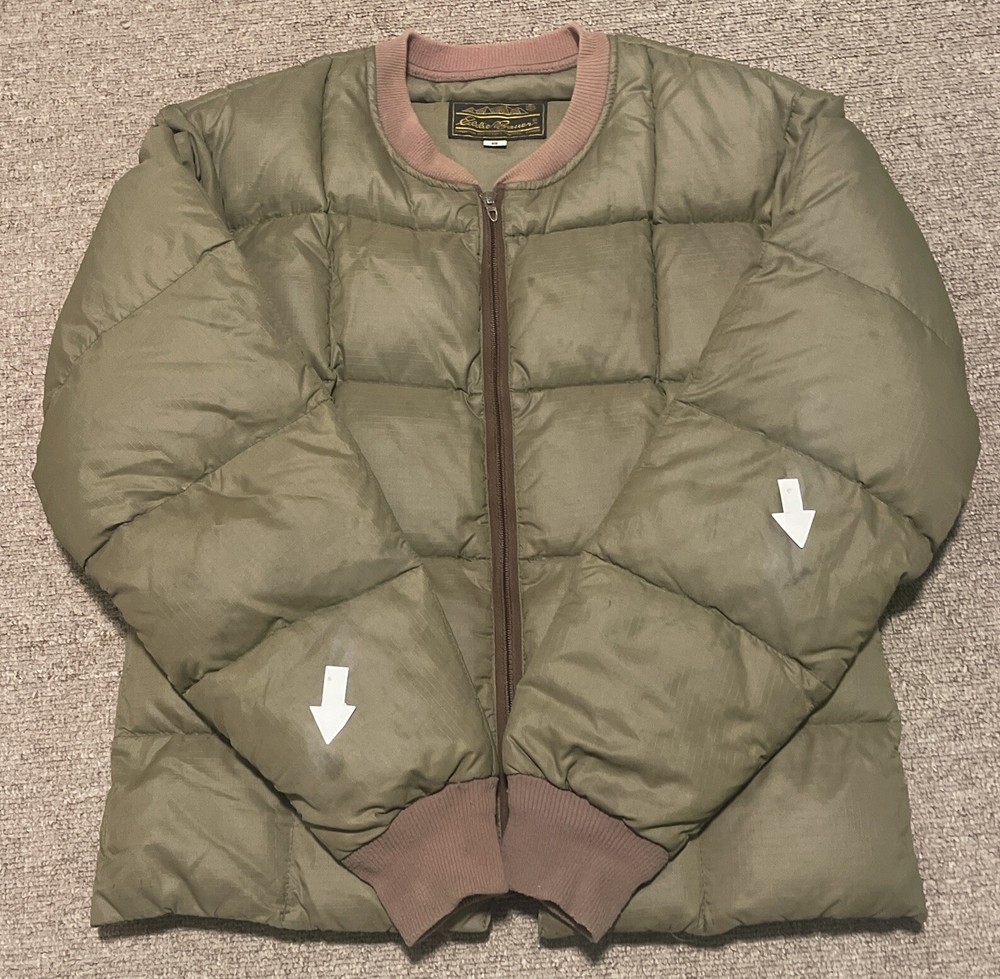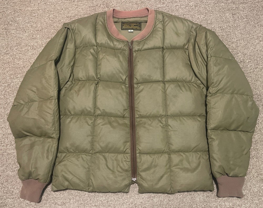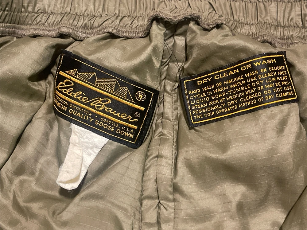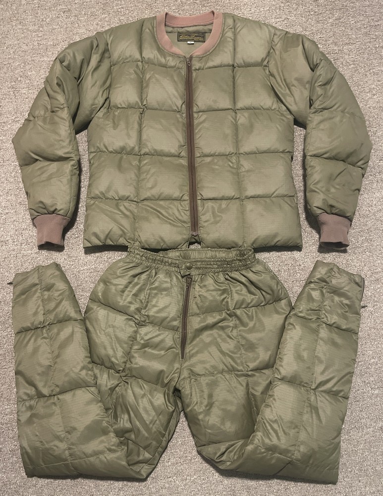 Embrace the vintage charm of this Eddie Bauer jacket and pants suit, made from premium goose down with a quilted design. The mid-length coat features a solid green color with accents that add a touch of character, while the zip and button closure provide a secure fit. This jacket is perfect for all seasons, thanks to its windproof and wind-resistant properties, and it is also water-resistant for added protection. The hunting, outdoor, 70s and 80s military theme is perfect for those who love a touch of nostalgia. The jacket is lightweight and packable, making it easy to take on outdoor adventures. The S size and regular fit are suitable for men, and the jacket is made in the United States with high-quality materials.