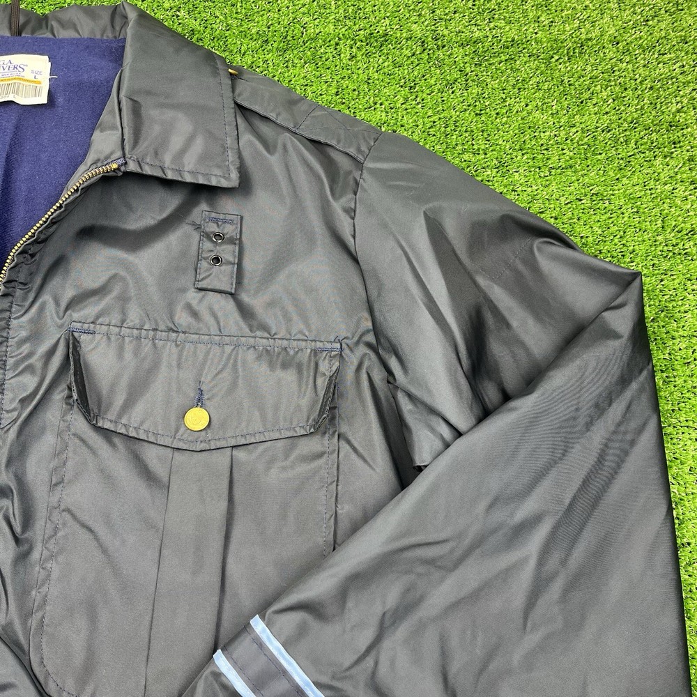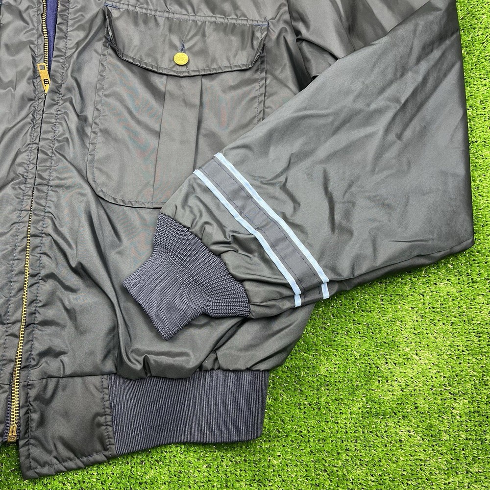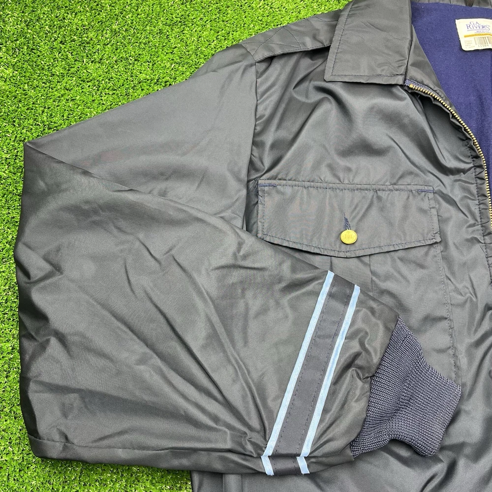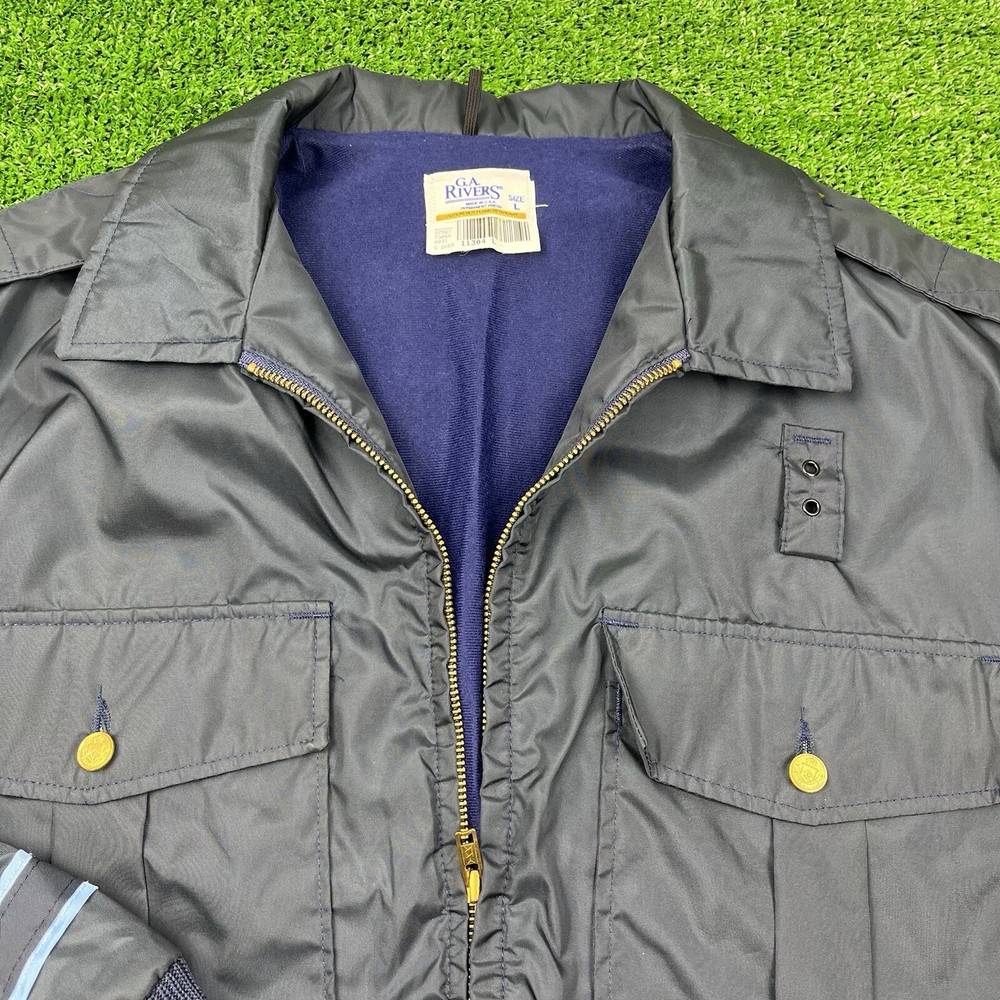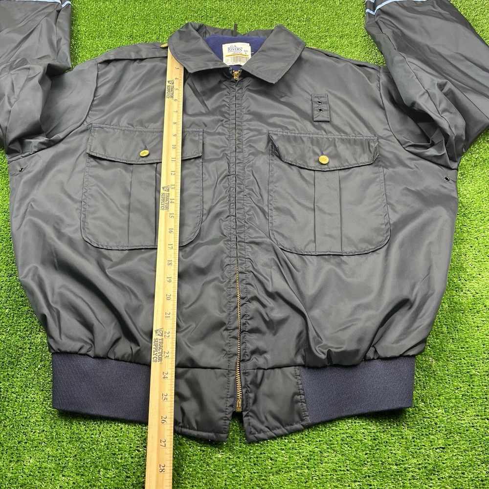 This vintage GA Rivers post office bomber jacket is a must-have for any fashion-savvy man. Made in the USA, this jacket features a navy blue solid pattern with button accents and a spread collar. The jacket is lined with cotton and insulated with polyester, making it perfect for all seasons. With a mid-length and a chest size of 54 inches, this jacket is suitable for travel, casual wear, and workwear. The full zip closure and wind-resistant and water-resistant features make it perfect for outdoor activities. This jacket is a classic piece that will never go out of style, and it comes in a size L.