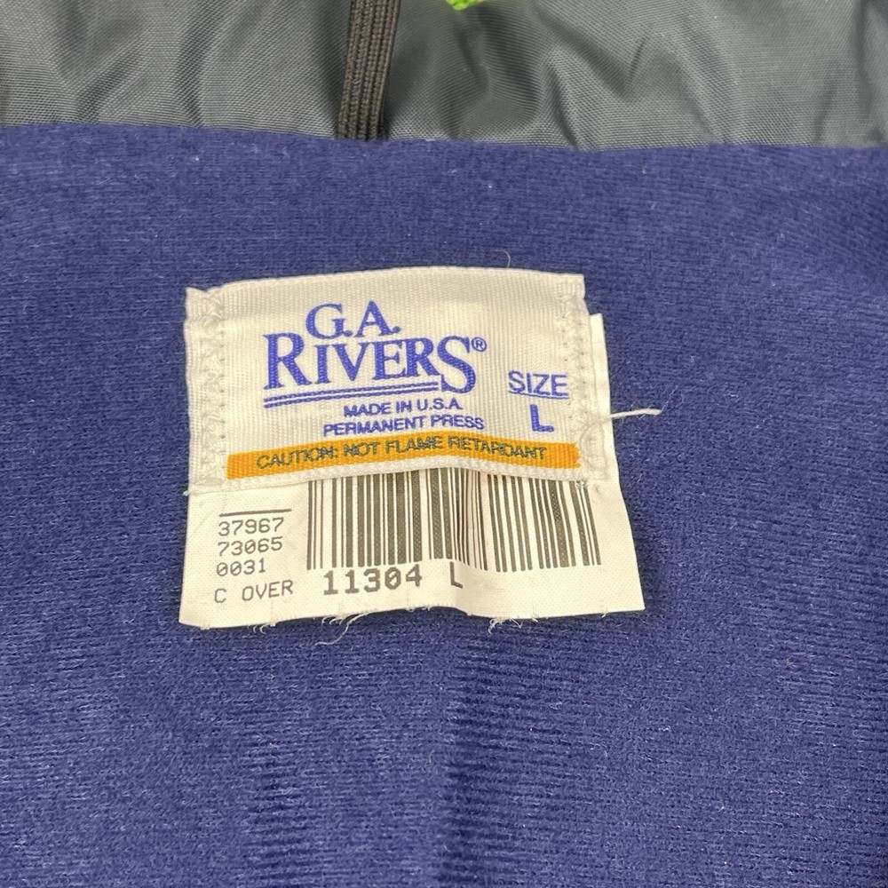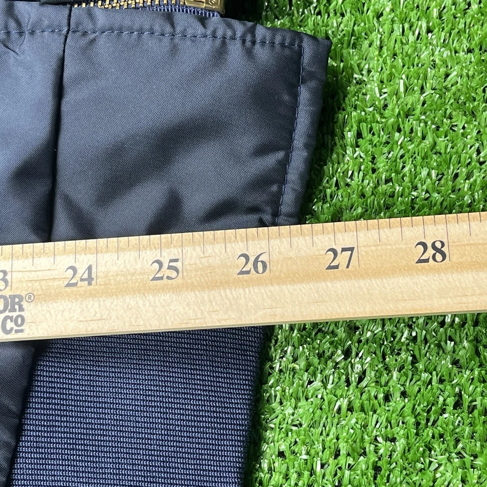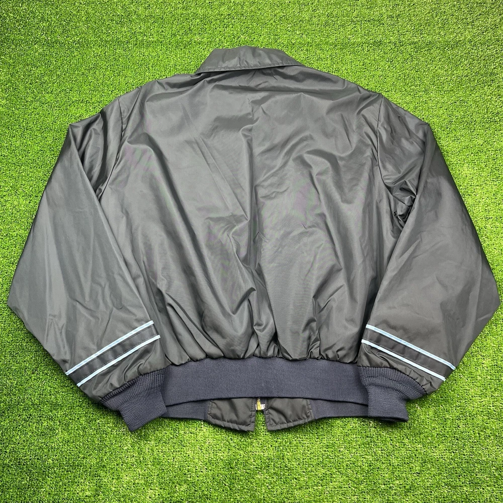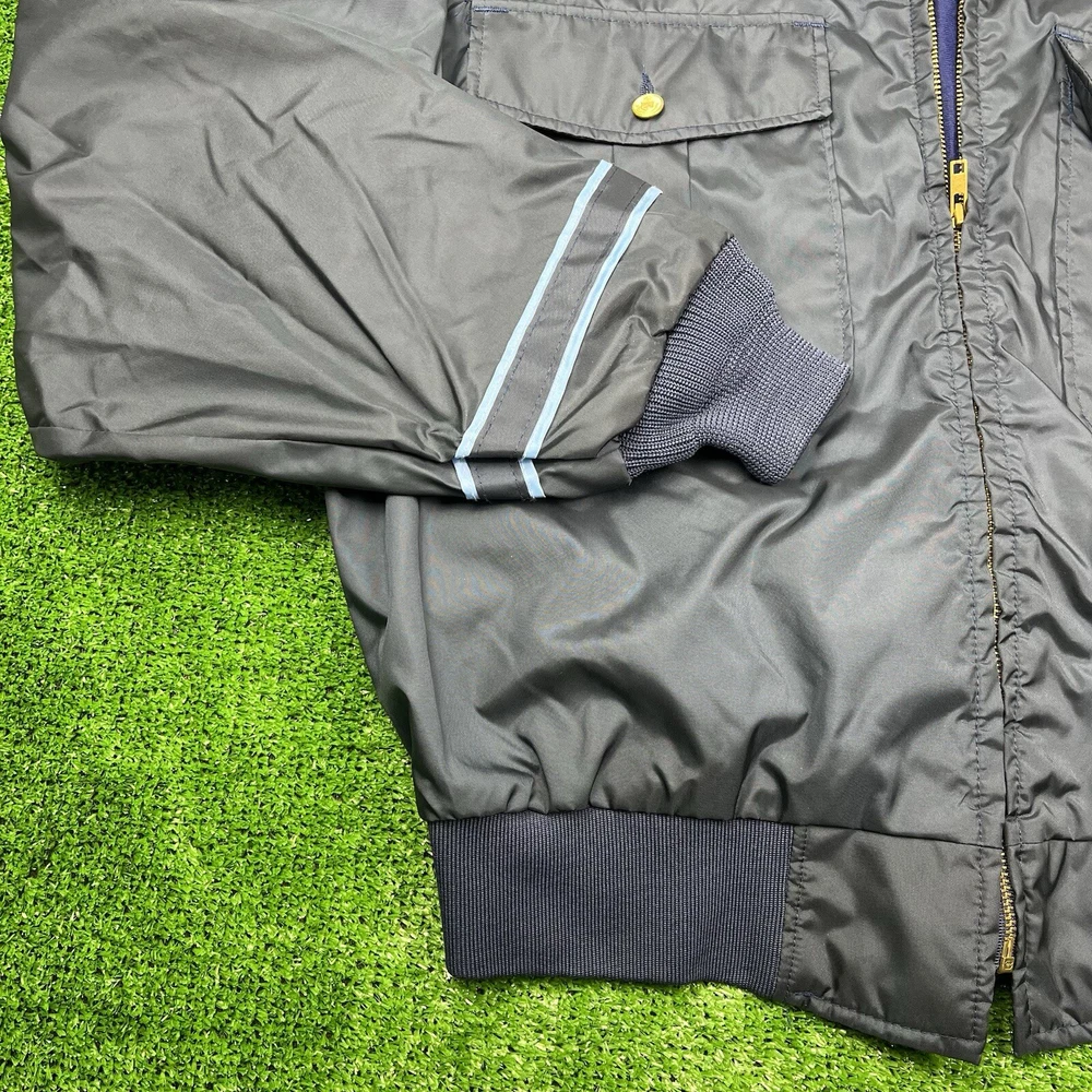This vintage GA Rivers post office bomber jacket is a must-have for any fashion-savvy man. Made in the USA, this jacket features a navy blue solid pattern with button accents and a spread collar. The jacket is lined with cotton and insulated with polyester, making it perfect for all seasons. With a mid-length and a chest size of 54 inches, this jacket is suitable for travel, casual wear, and workwear. The full zip closure and wind-resistant and water-resistant features make it perfect for outdoor activities. This jacket is a classic piece that will never go out of style, and it comes in a size L.