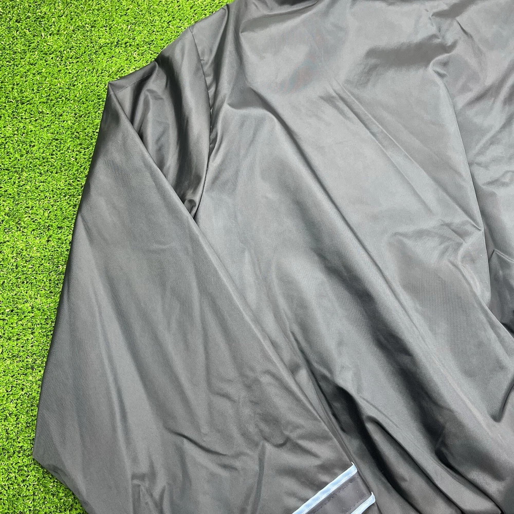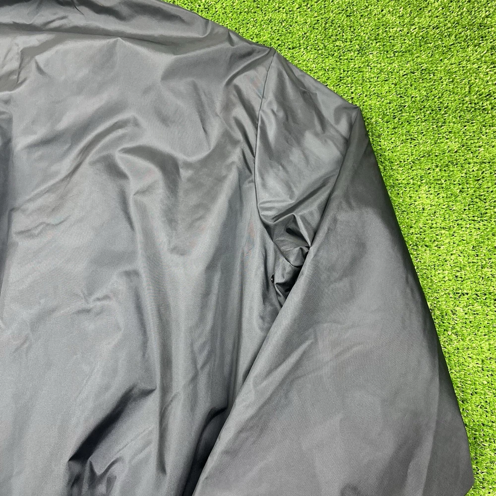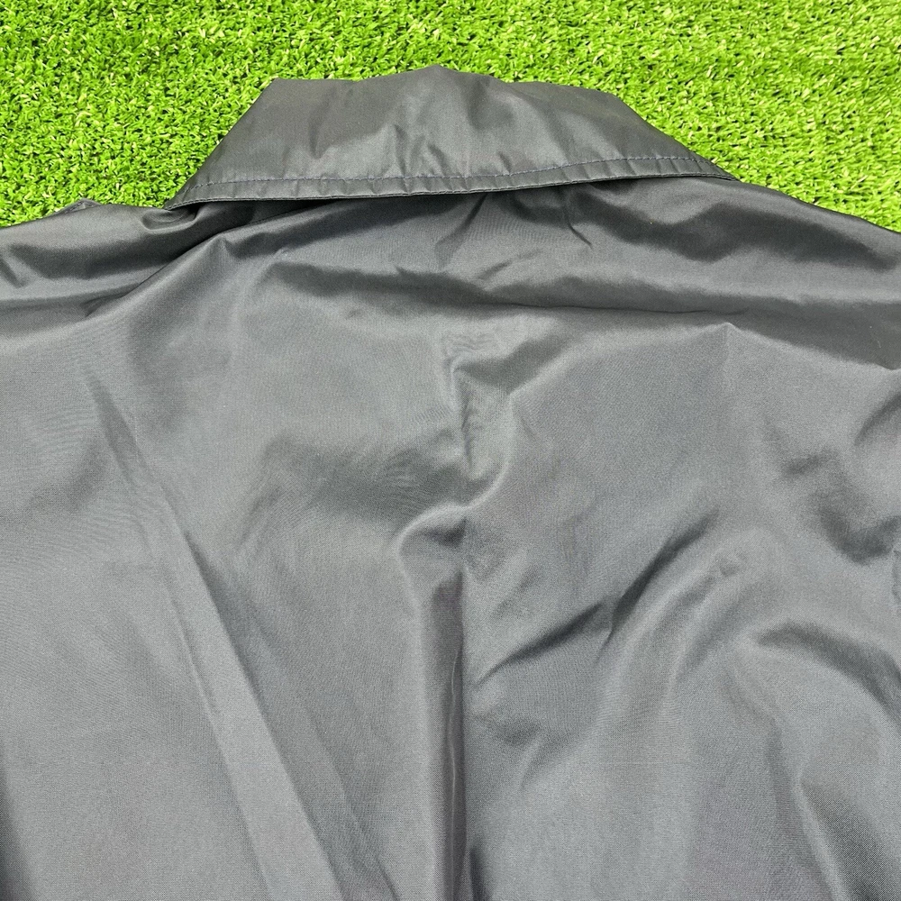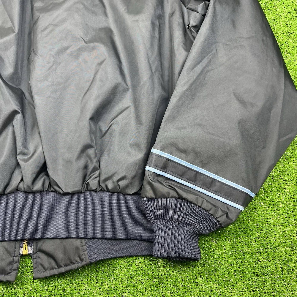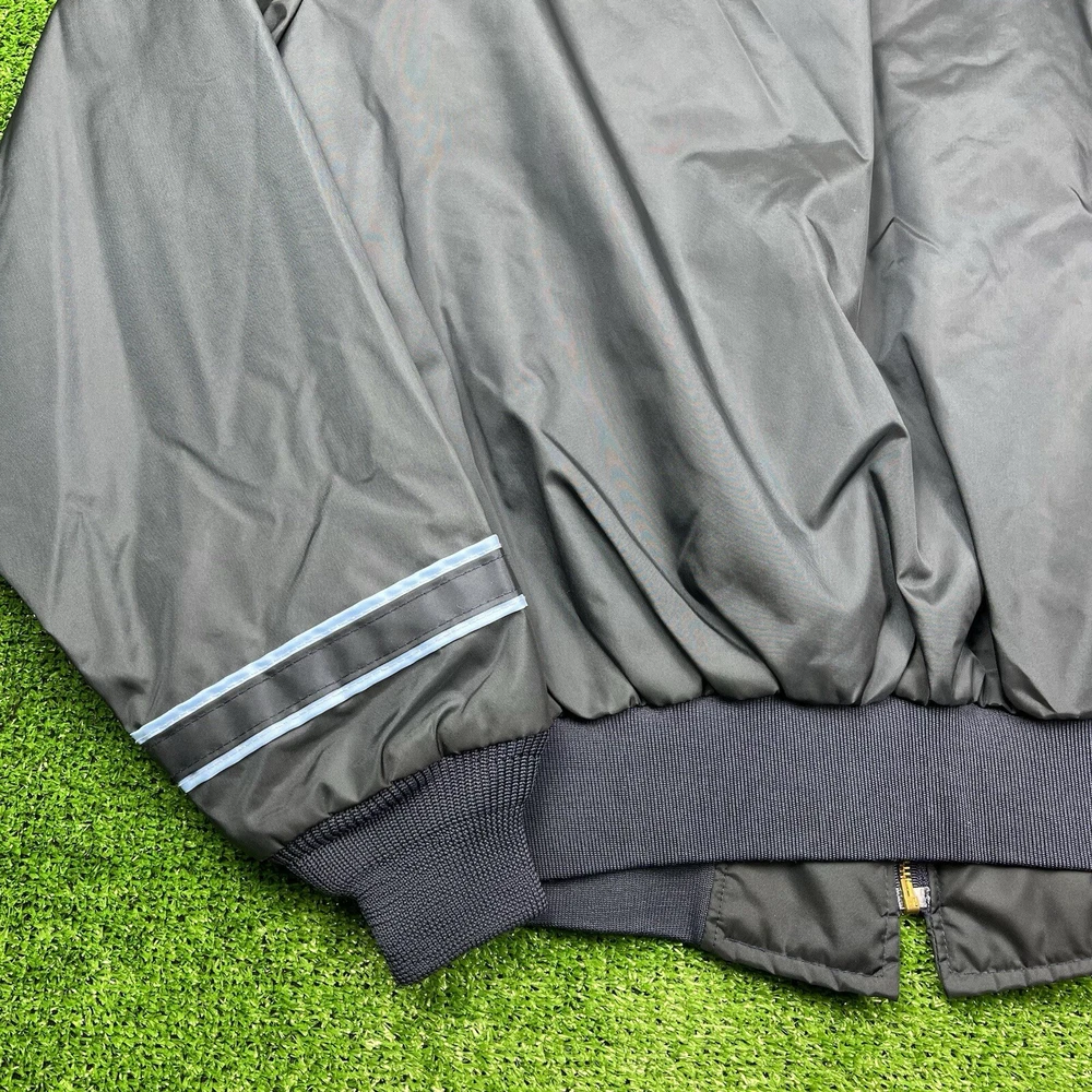 This vintage GA Rivers post office bomber jacket is a must-have for any fashion-savvy man. Made in the USA, this jacket features a navy blue solid pattern with button accents and a spread collar. The jacket is lined with cotton and insulated with polyester, making it perfect for all seasons. With a mid-length and a chest size of 54 inches, this jacket is suitable for travel, casual wear, and workwear. The full zip closure and wind-resistant and water-resistant features make it perfect for outdoor activities. This jacket is a classic piece that will never go out of style, and it comes in a size L.