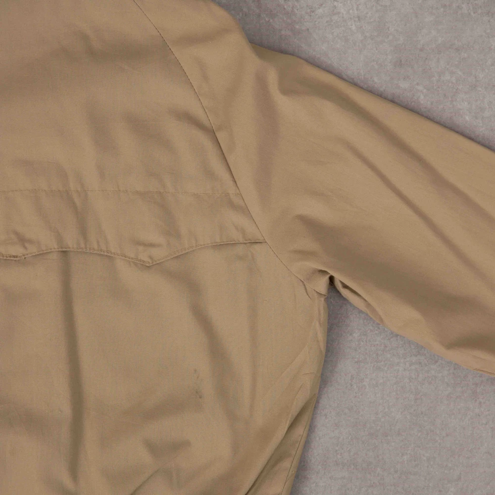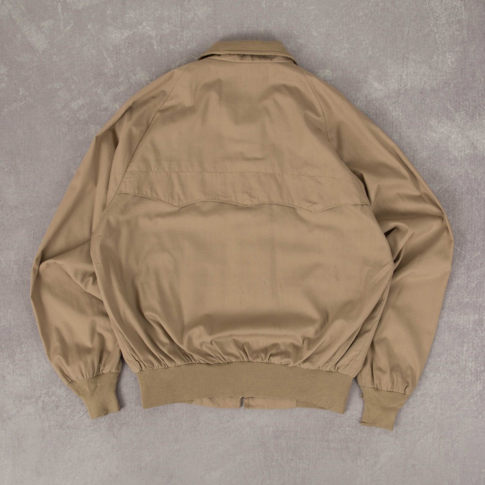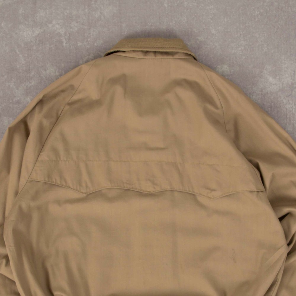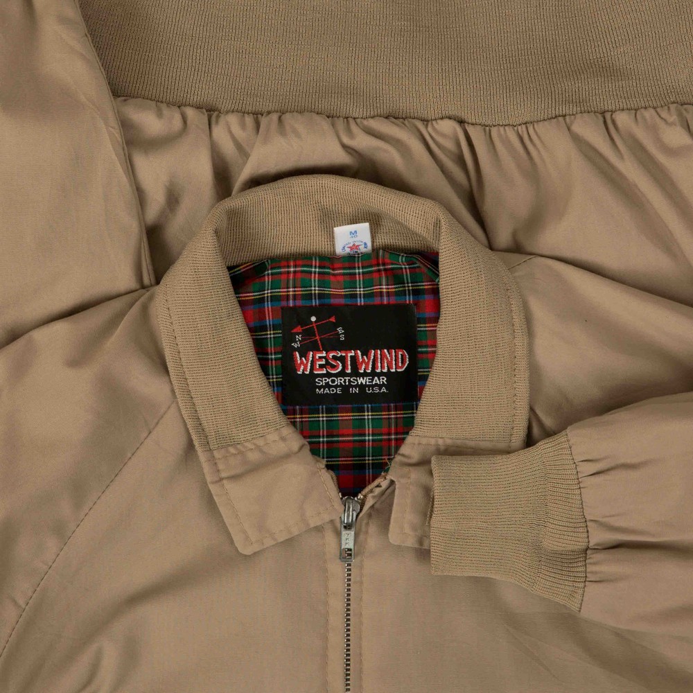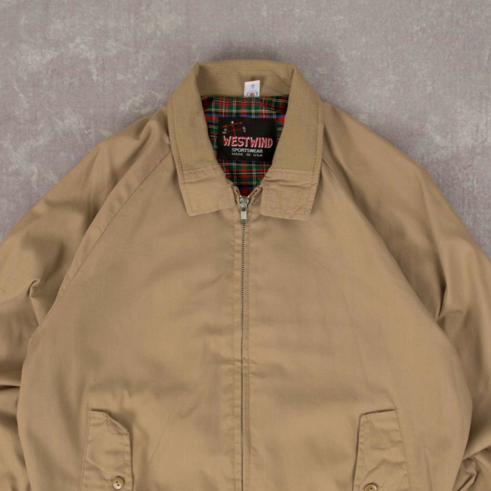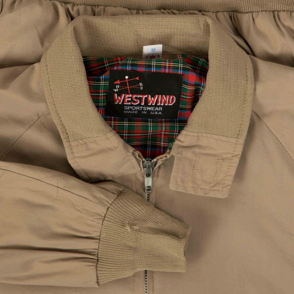 Men's Vintage 1980s Harrington Jacket + Damage: Loose Threads To Sleeve Cuff, Mark To Back + Tag: West Wind + Made In USA + Outer Material: Nylon / Lining Material: Polyester + Colour: Beige + Size Label States: Medium + Recommended Size: Small + Measurements (Inches): Pit To Pit = 23, Body Length = 23 Please note that all vintage items have been previously worn, and may show some signs of previous wear. However, any significant damage will be photographed and/or stated in the items listing. Please note that damage to the inside may not always be photographed or listed.