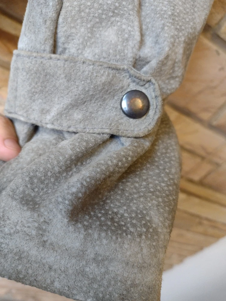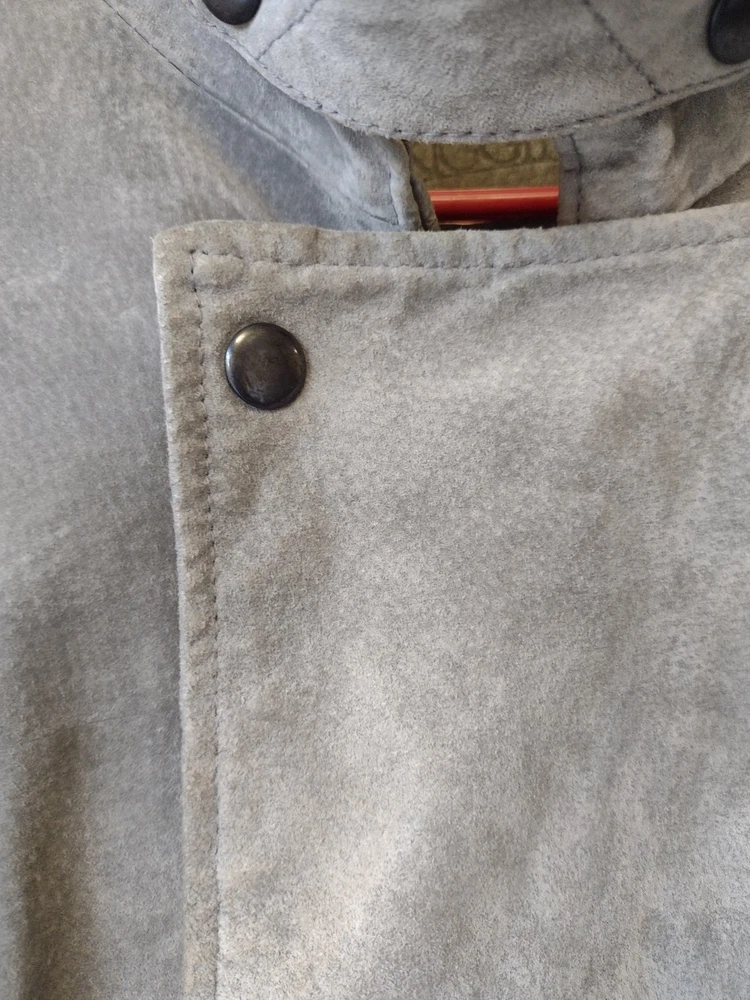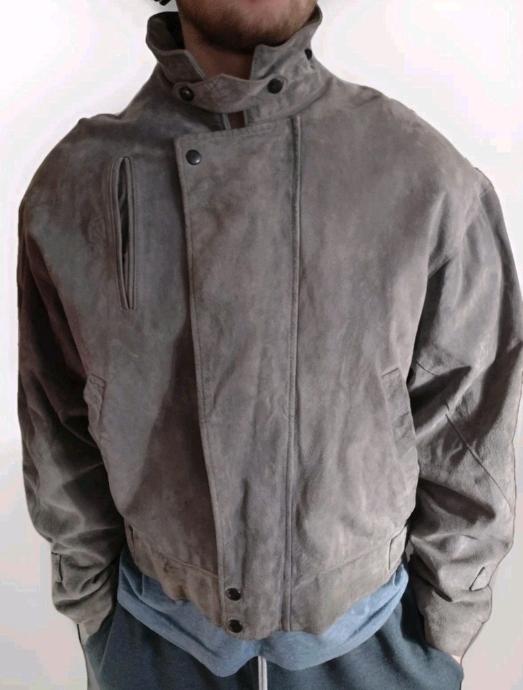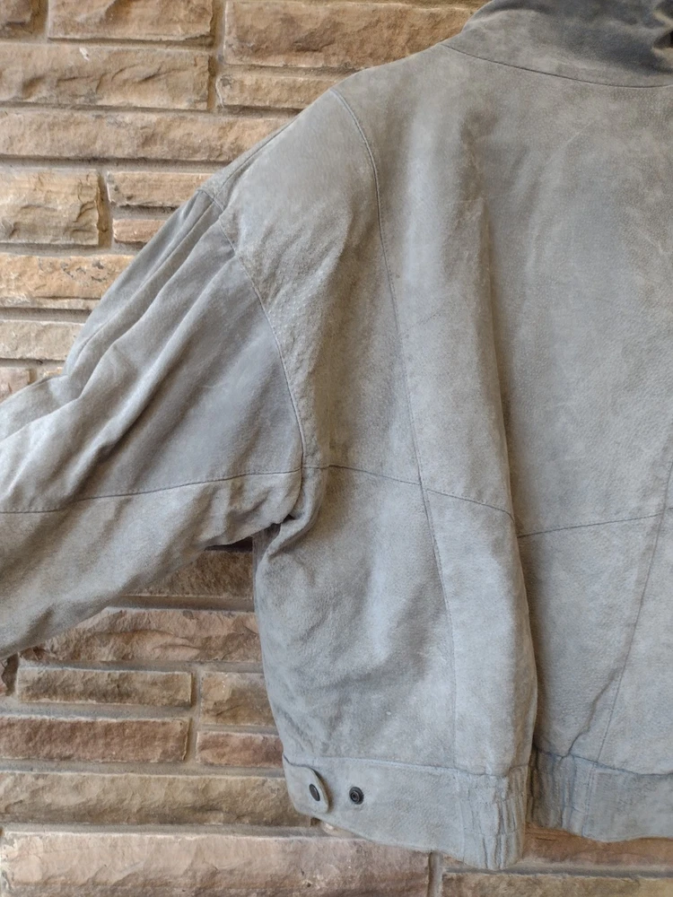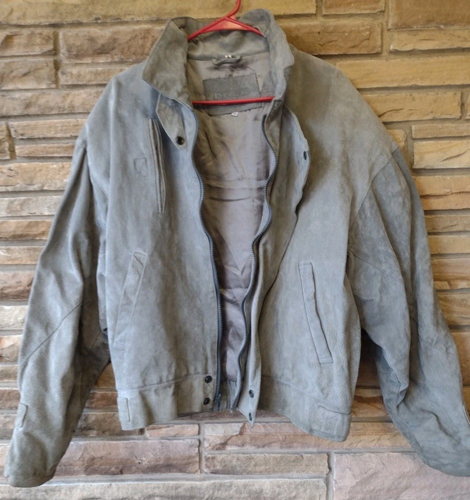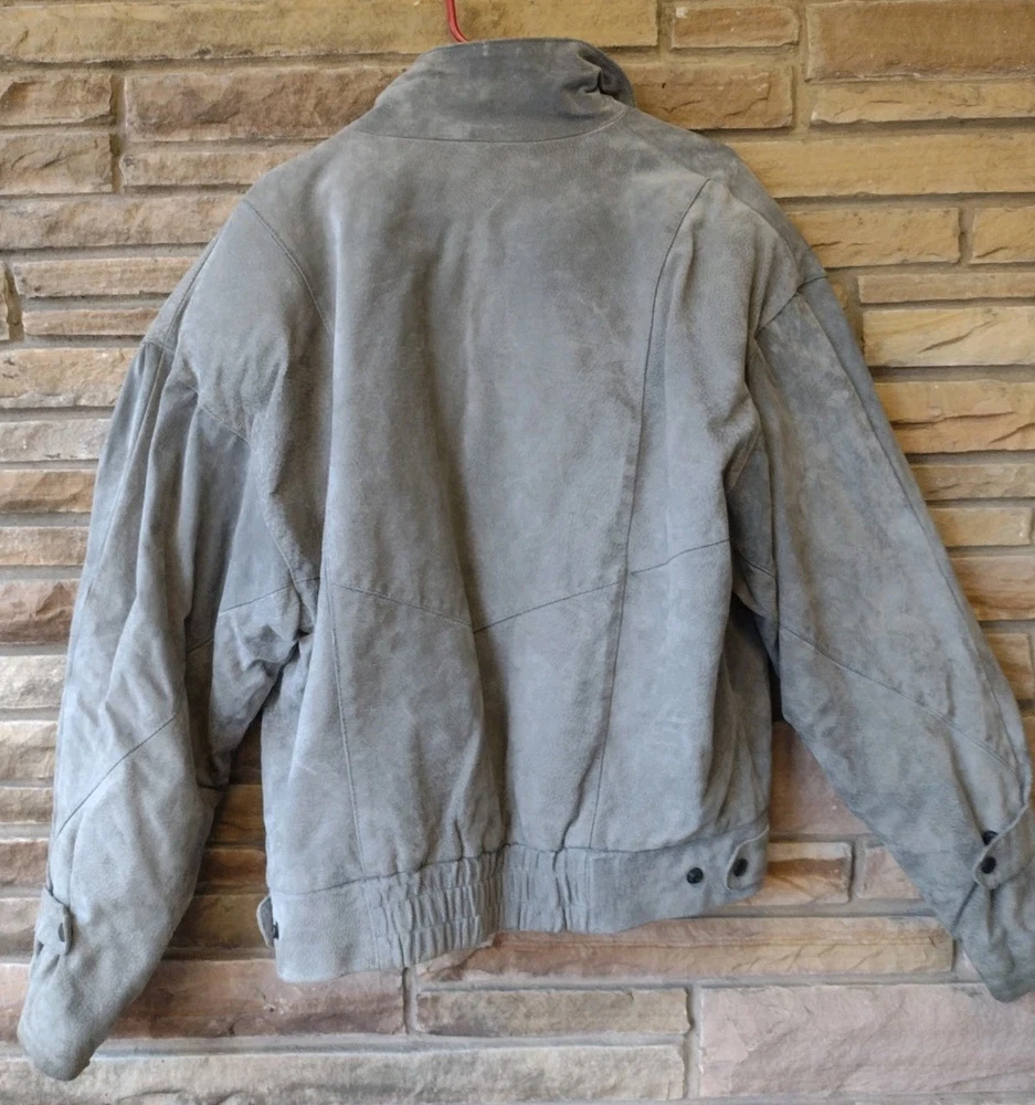 Up for sale is a stylish and authentic 80's J. Riggings genuine suede motorcycle jacket in a classic gray color. This vintage jacket features a spread collar, snap and zip closures, and a chest size of 44 inches. The jacket is lined with acetate, has elastic waist, full zip, shoulder pads, pockets and is wind-resistant. The jacket is in very good condition and has no rips tears or holes. It does have some dark areas especially at the sleeve cuffs as shown in the photos. It has two waist pockets one velcro chest pocket one interior chest pocket. Please see photos for condition details. Measurements: Sleeve length from dropped seam measures 24 in. Total length measures 26 in