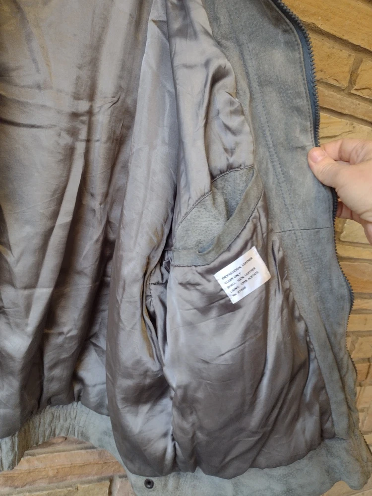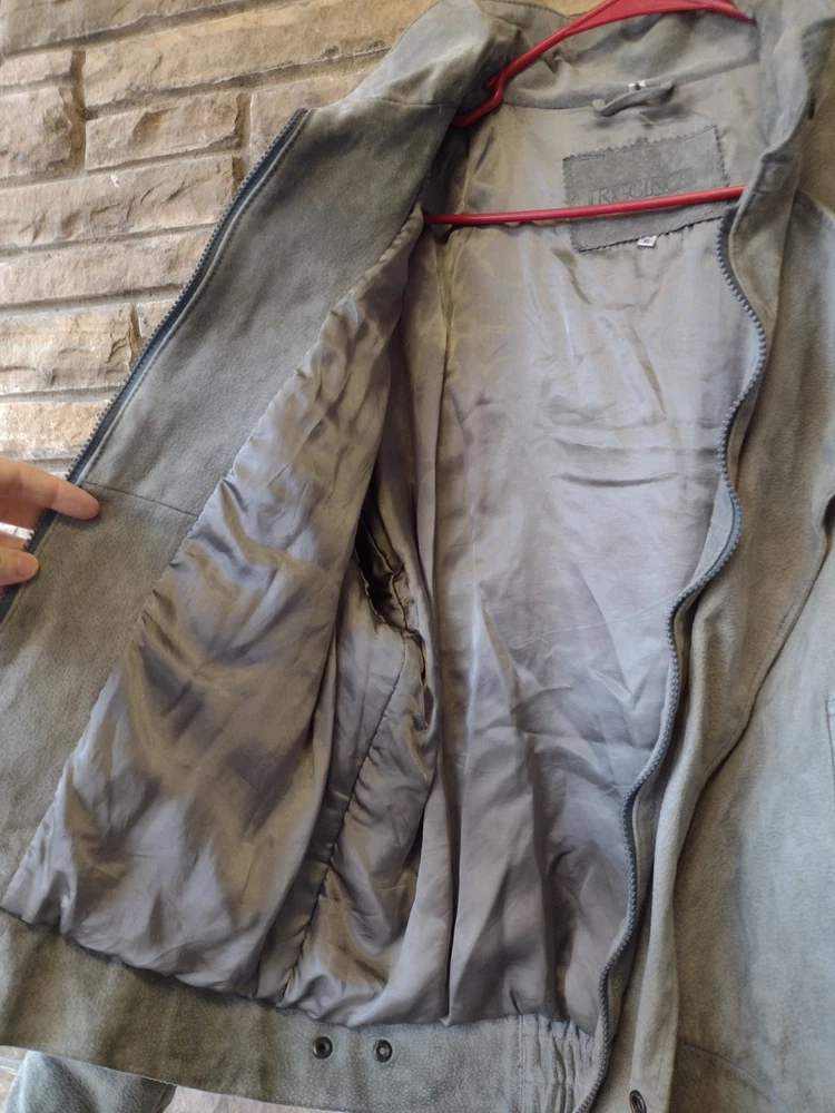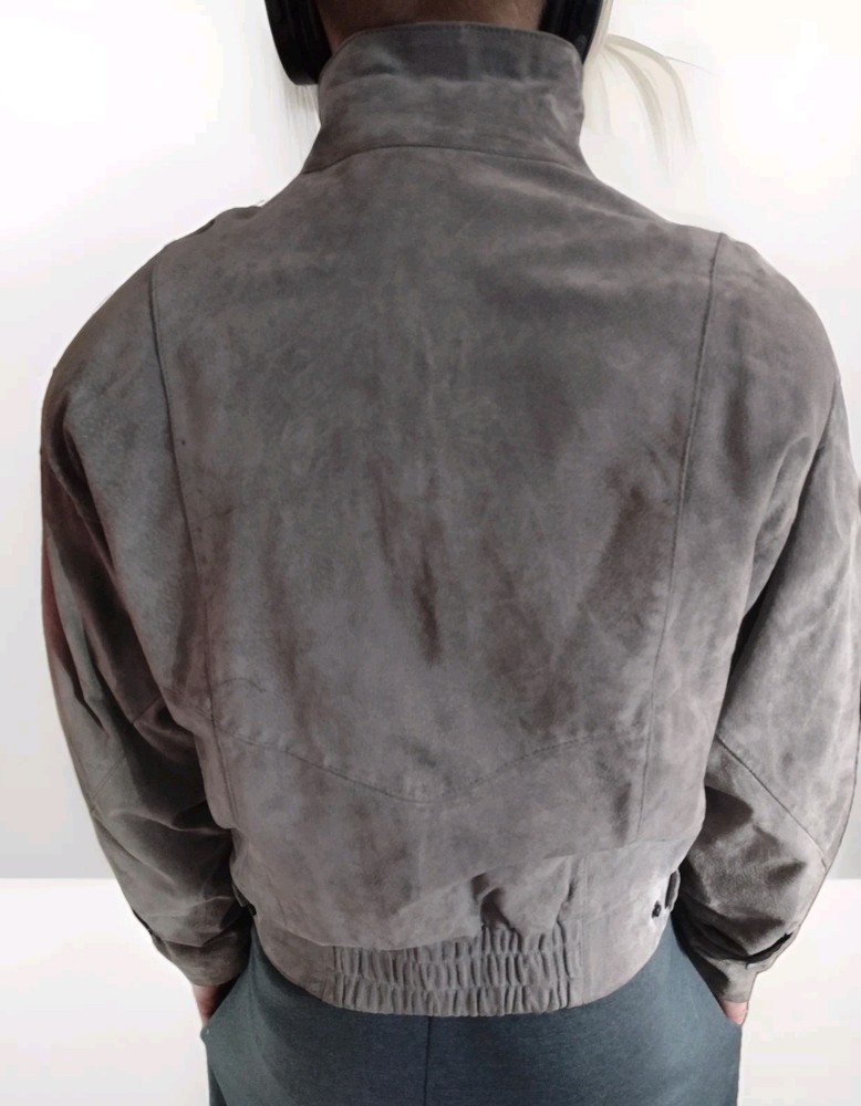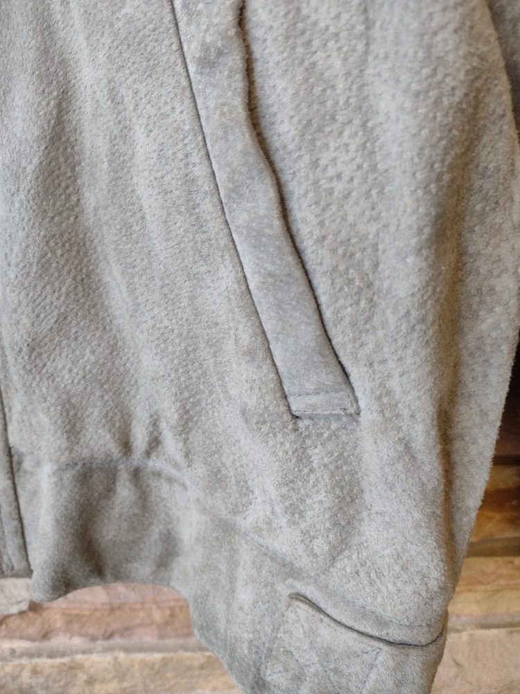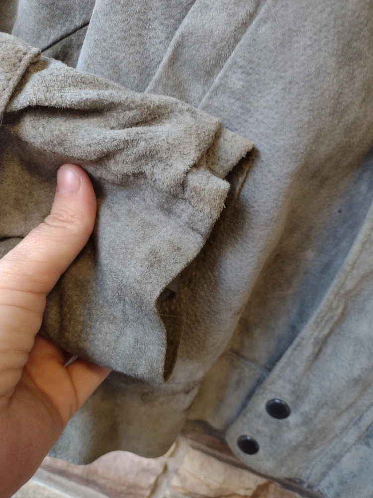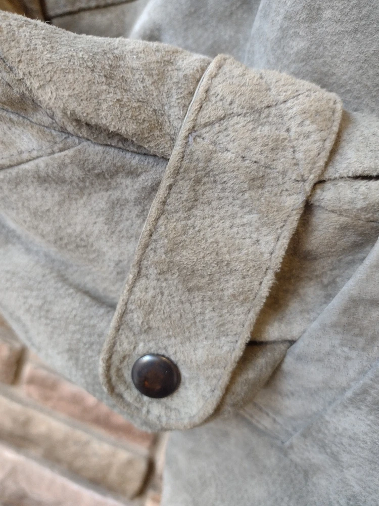 Up for sale is a stylish and authentic 80's J. Riggings genuine suede motorcycle jacket in a classic gray color. This vintage jacket features a spread collar, snap and zip closures, and a chest size of 44 inches. The jacket is lined with acetate, has elastic waist, full zip, shoulder pads, pockets and is wind-resistant. The jacket is in very good condition and has no rips tears or holes. It does have some dark areas especially at the sleeve cuffs as shown in the photos. It has two waist pockets one velcro chest pocket one interior chest pocket. Please see photos for condition details. Measurements: Sleeve length from dropped seam measures 24 in. Total length measures 26 in