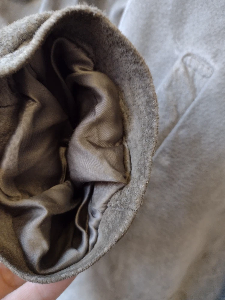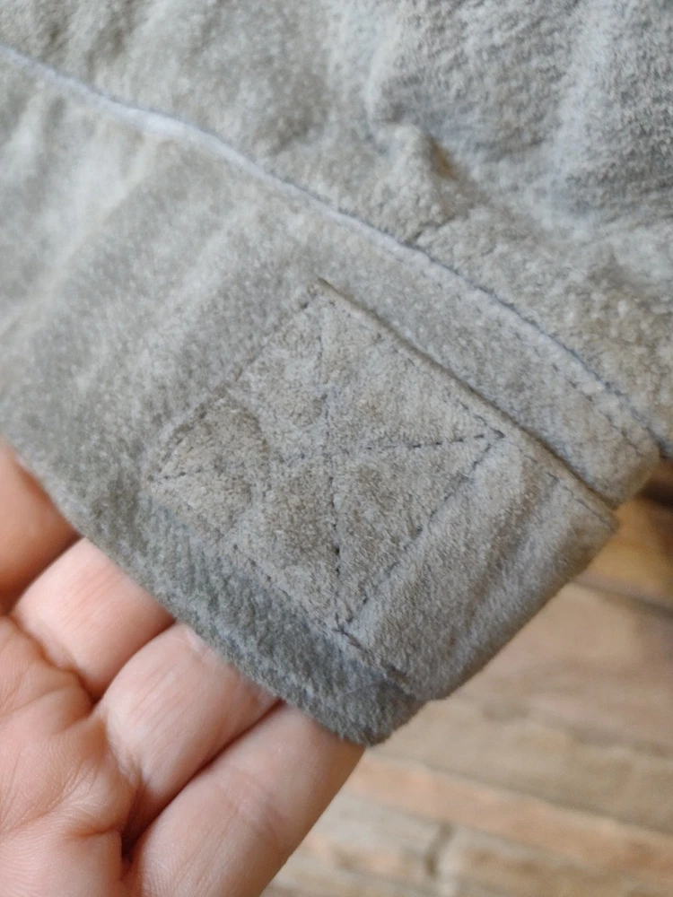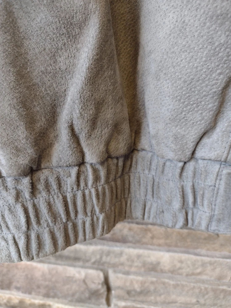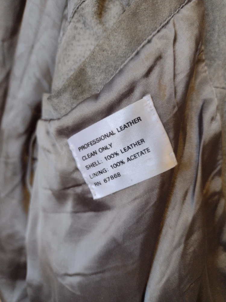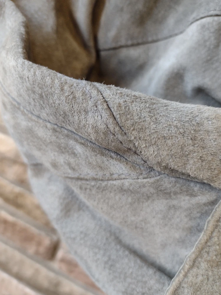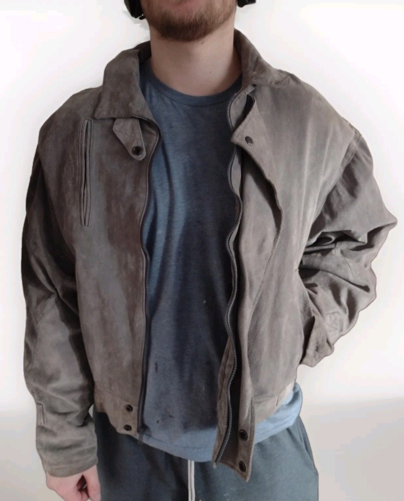 Up for sale is a stylish and authentic 80's J. Riggings genuine suede motorcycle jacket in a classic gray color. This vintage jacket features a spread collar, snap and zip closures, and a chest size of 44 inches. The jacket is lined with acetate, has elastic waist, full zip, shoulder pads, pockets and is wind-resistant. The jacket is in very good condition and has no rips tears or holes. It does have some dark areas especially at the sleeve cuffs as shown in the photos. It has two waist pockets one velcro chest pocket one interior chest pocket. Please see photos for condition details. Measurements: Sleeve length from dropped seam measures 24 in. Total length measures 26 in