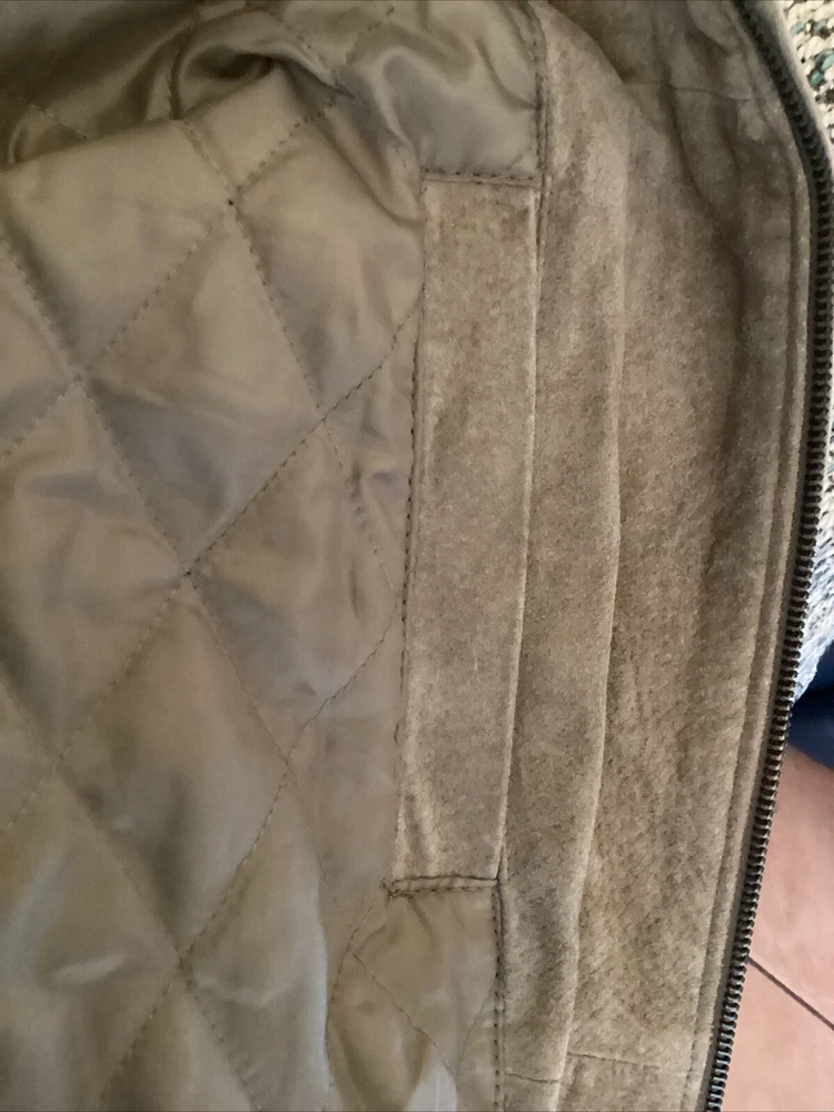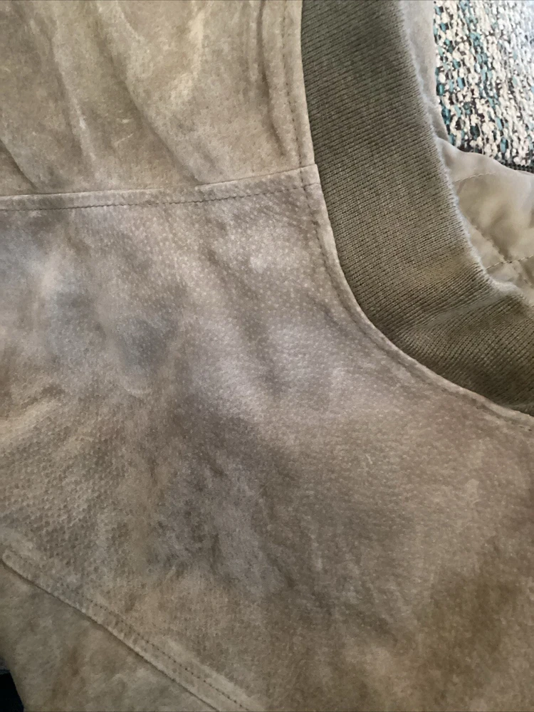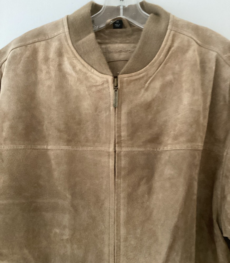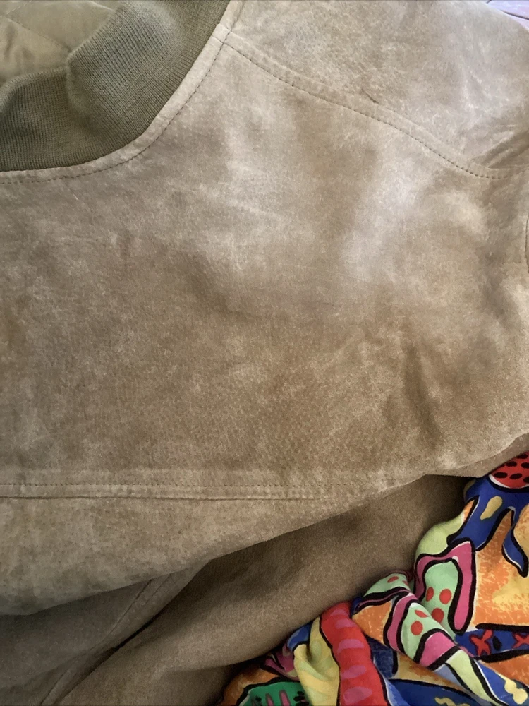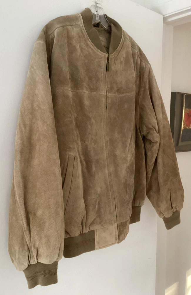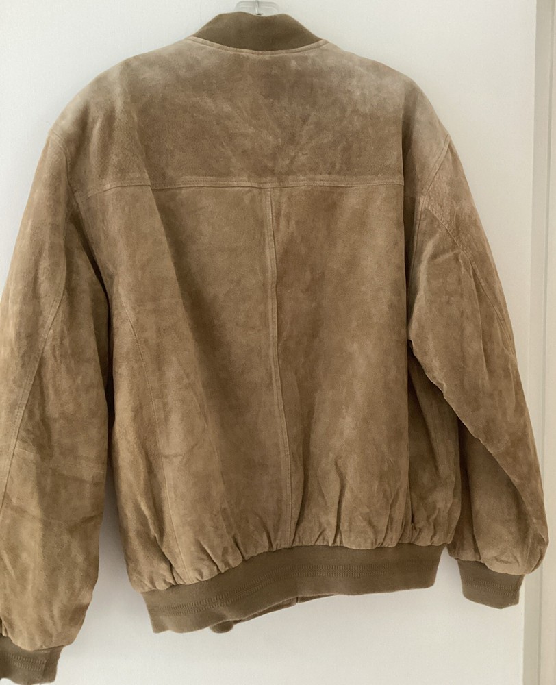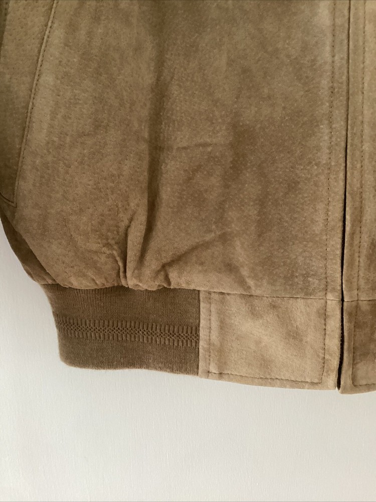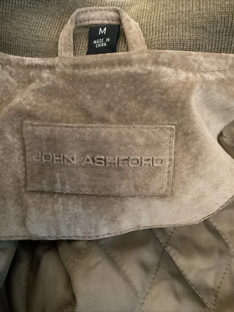 This beautiful vintage John Ashford bomber type jacket is a must-have for any fashion-forward man. The tan suede leather jacket features a stand-up collar, full zip closure, and a mid-length cut that makes it perfect for any occasion, whether it's a casual day out or a formal event. The jacket is lined with soft leather and has a breathable, wind-resistant soft shell fabric type that makes it suitable for all seasons. The jacket has 2 outside pockets and two large inside pockets. The jacket is a size medium and is dry clean only. Add this classic piece to your wardrobe today and stand out from the crowd. The jacket is in great shape. There is a slight light change in the suede where it was hanging on a hanger. See picture. Sleeve length about 24 inches from shoulder seam to bottom of cuff. Underarm to underarm in front about 24 inches Bottom of collar to bottom in back 26 inches