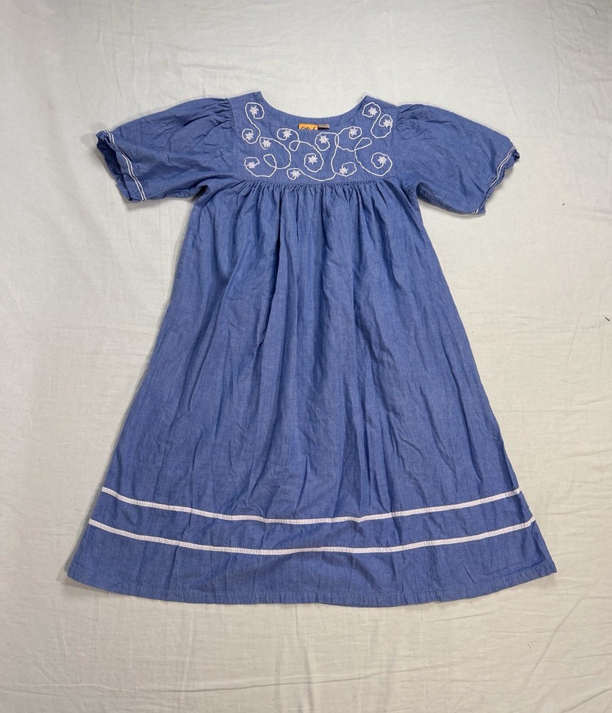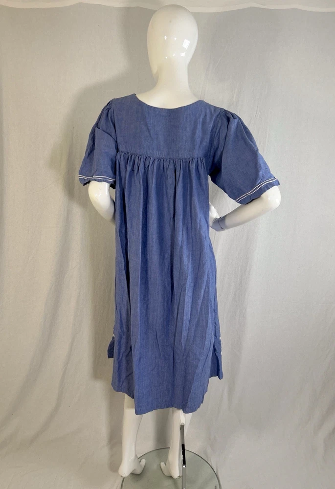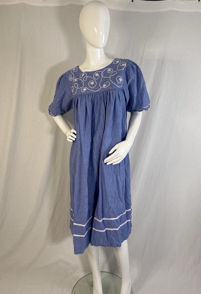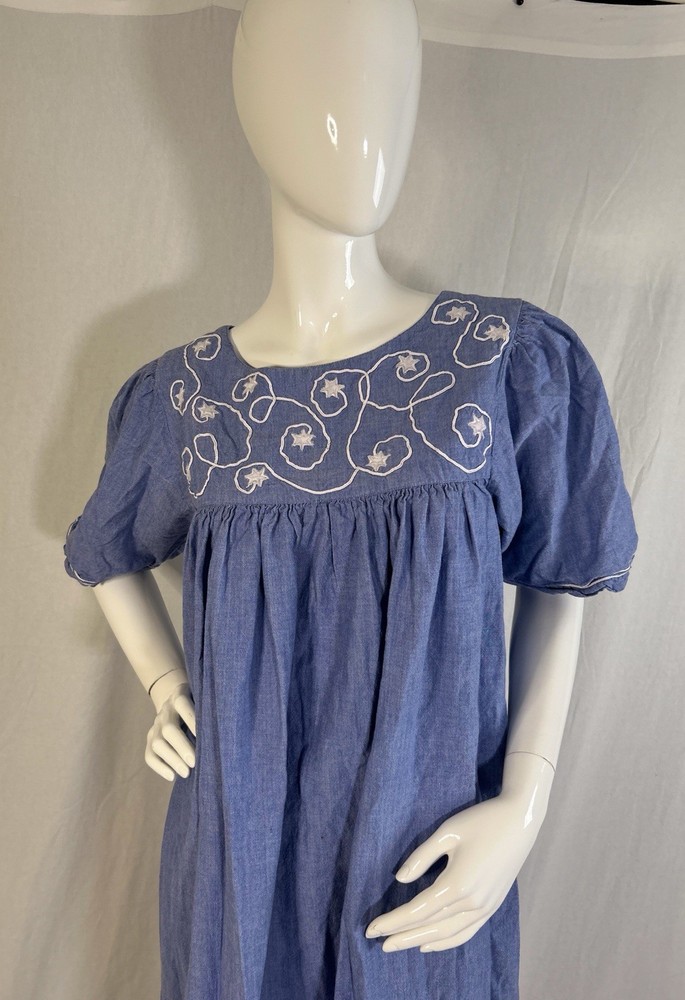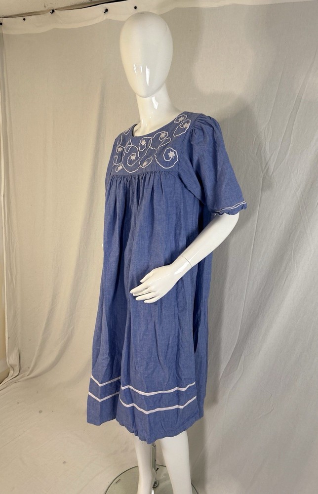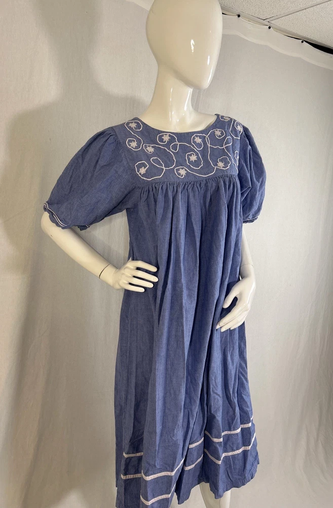 This item is in GOOD Condition!!! (This item has some distressing/loose strings here and there, as well as staining on one of the shoulders, and on one of the sides (they can be hard to see, but it’s a bunch of brown dots due to it being stored improperly). Other than that, this item is in GREAT condition! See pictures | MEASUREMENTS IN PHOTOS.) This vintage women's dress from Sea Wind is perfect for any occasion. With a round neckline and short sleeves, it's a flowing maxi dress that's easy to wear and care for. The dress features pleated accents, nature-inspired elements, and floral embroidery, making it a great addition to any wardrobe. Made from cotton and chambray fabric, this dress is perfect for all seasons, whether you're going to a wedding, holy communion, party, or even workwear. The dress is available in size S and is suitable for regular size types. The dress is machine washable and has a pullover closure. It's a great dress for those who love quality, flowing, and cozy clothes.