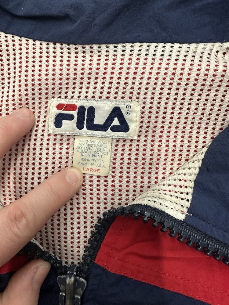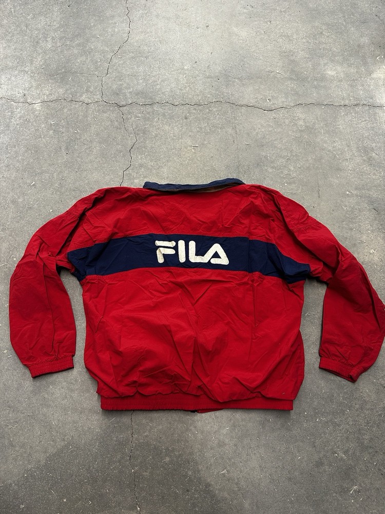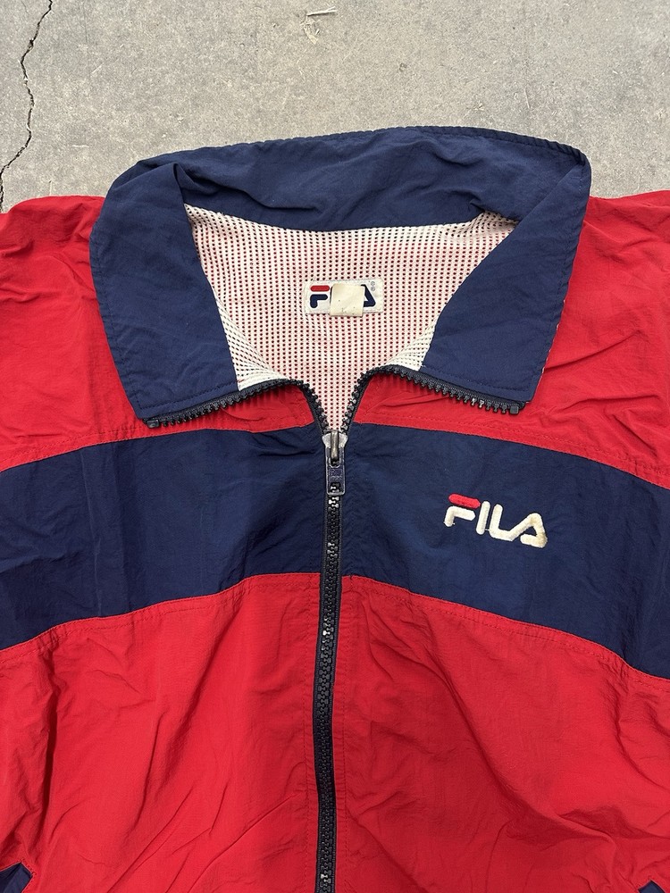 Embrace the retro vibe with this vintage 80s-90s FILA blue and red tracksuit jacket. A classic staple for any wardrobe, this windbreaker features a timeless design with a bold logo accent that adds an authentic touch of the era. Ideal for a range of occasions, from casual outings to travel, or even a cocktail party, its versatile style ensures it fits seamlessly into your lifestyle. Crafted in the United States, the jacket boasts a durable nylon outer shell with a solid pattern that's easy to pair. The full zip closure, combined with a lightweight, lined interior, makes it a practical choice for all seasons. Pockets provide convenience, while the jacket's wind-resistant feature ensures you stay protected on breezy days. This size L windbreaker is a testament to the sporty charm of the 80s and 90s.