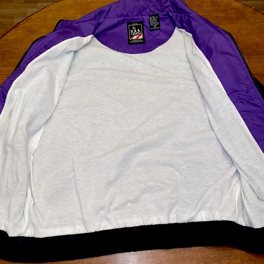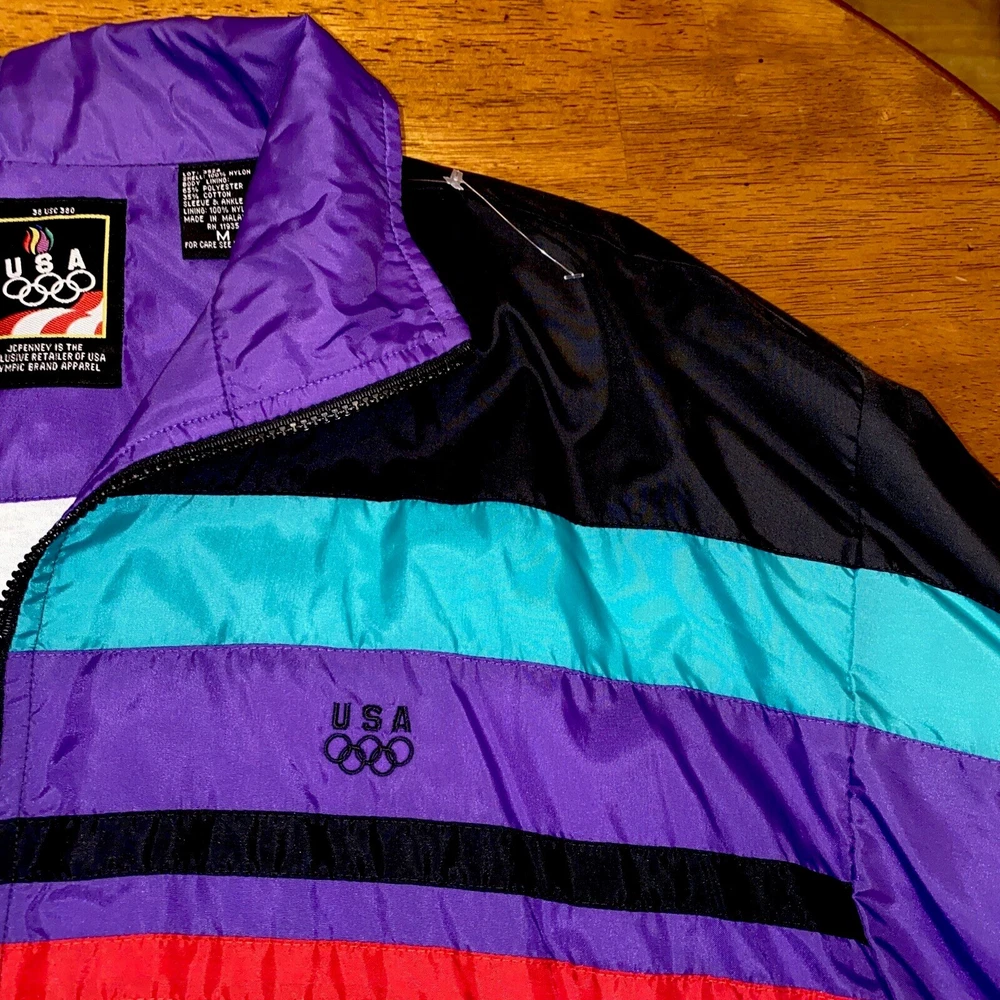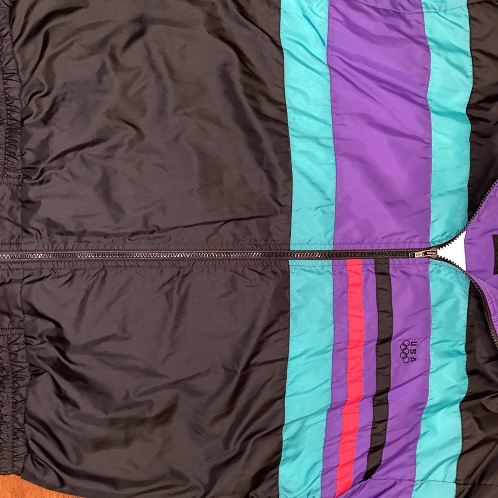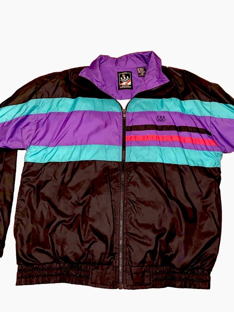 This vintage windbreaker is a must-have for any fan of the USA Olympics. The black, teal, purple, and red colors make it a bold statement piece. The jacket is made of durable nylon material and is perfect for any outdoor activity. The jacket is a size XL and is designed for men. It features a classic 90s style and is perfect for any collector or enthusiast. The Olympic brand adds to the jacket's value and makes it a unique addition to any wardrobe. Don't miss out on this piece of Olympic history.