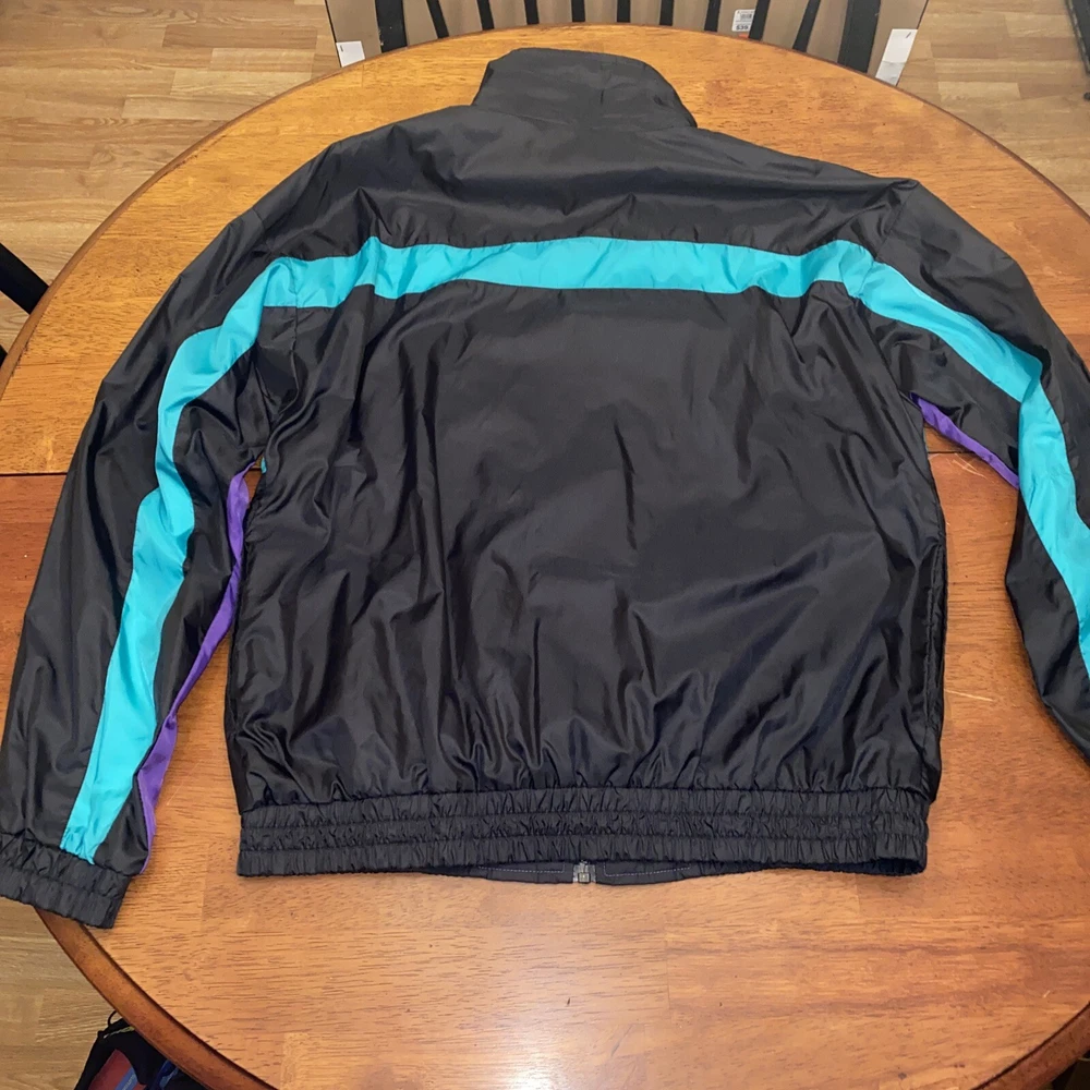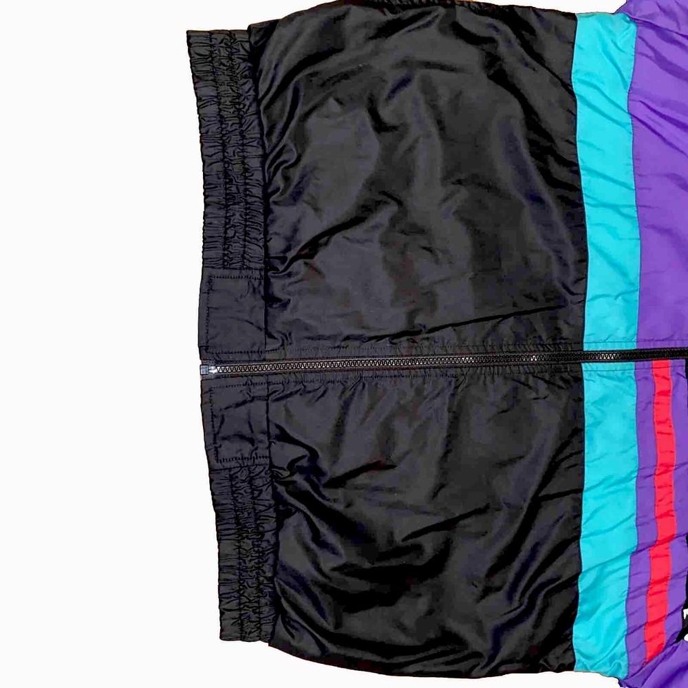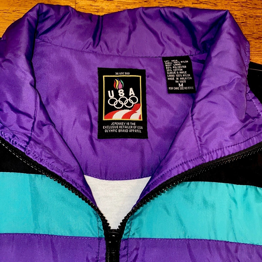 This vintage windbreaker is a must-have for any fan of the USA Olympics. The black, teal, purple, and red colors make it a bold statement piece. The jacket is made of durable nylon material and is perfect for any outdoor activity. The jacket is a size XL and is designed for men. It features a classic 90s style and is perfect for any collector or enthusiast. The Olympic brand adds to the jacket's value and makes it a unique addition to any wardrobe. Don't miss out on this piece of Olympic history.