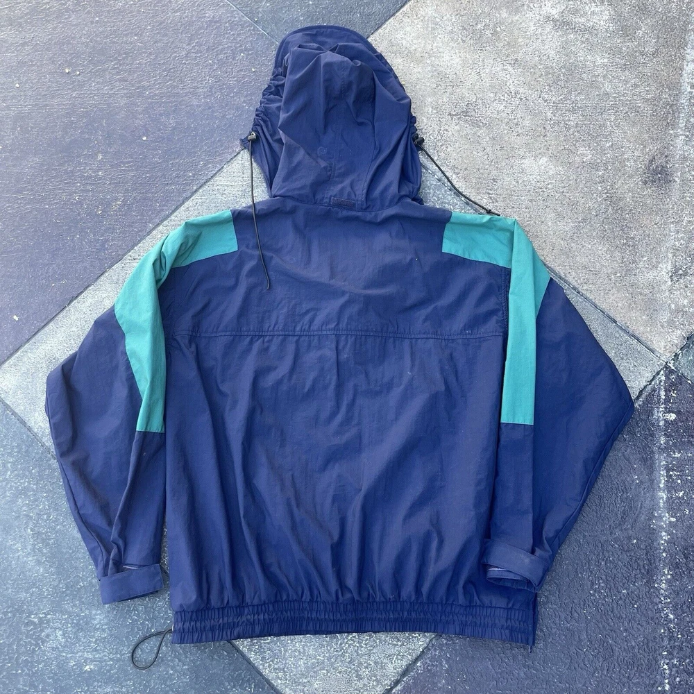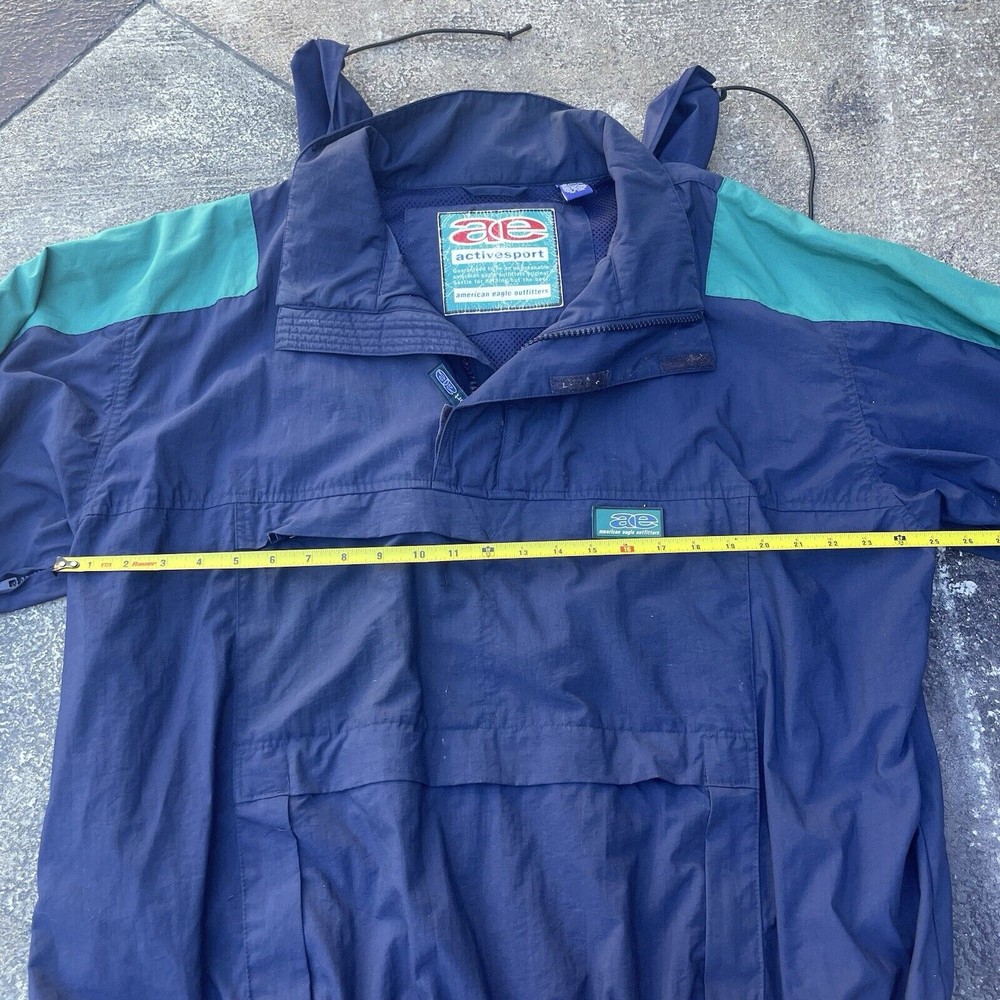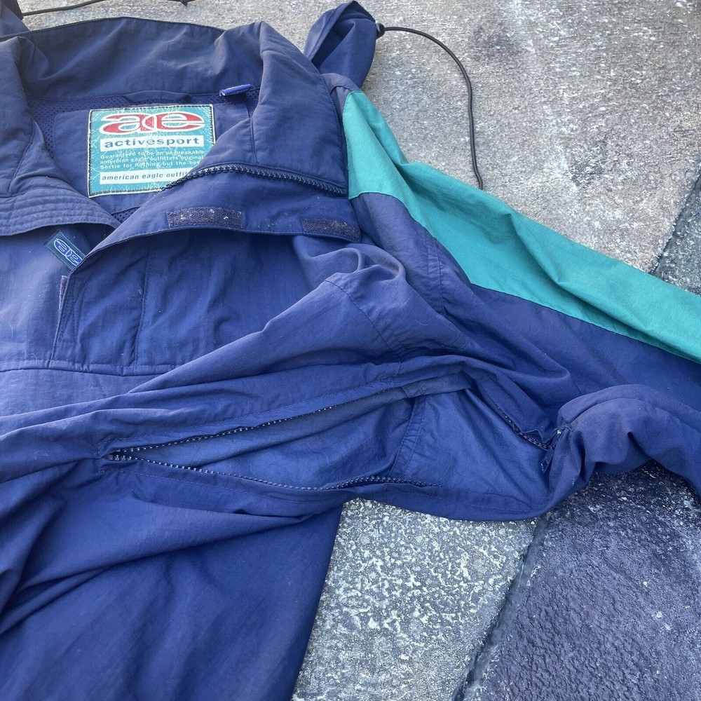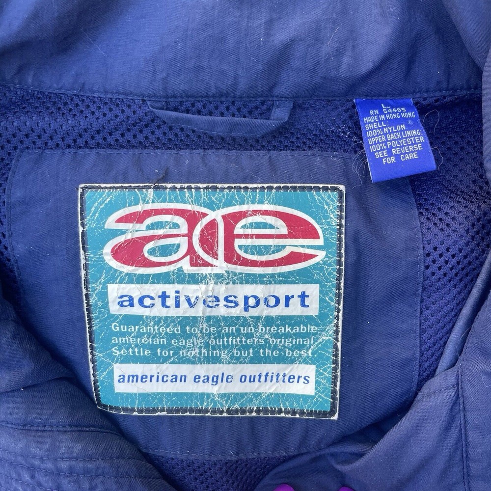 <![CDATA[<div>This vintage American Eagle Outfitters jacket is a limited edition piece that features a hood, full zip closure, and an elastic waist for added comfort. The jacket is made from a soft shell, wind-resistant nylon blend fabric and is lined with nylon for extra warmth. It comes in a mid-length bomber style with a solid blue color and is perfect for any season, whether it's winter, summer, fall, or spring. The jacket has multiple pockets for storage, including a kangaroo pocket and a zippered pocket with the American Eagle logo. It is suitable for various occasions, such as travel, parties, casual wear, workwear, and business attire. The jacket is also suitable for various activities, including gym & training, walking, golf, soccer, skiing, hiking, and skateboarding. This jacket is a perfect addition to any wardrobe and is sure to make a statement wherever you go.