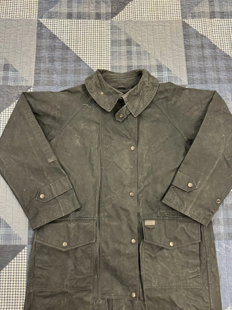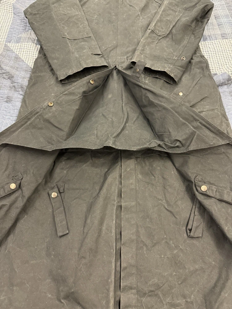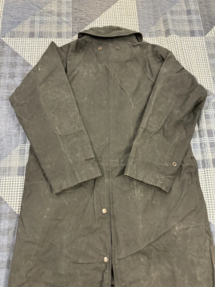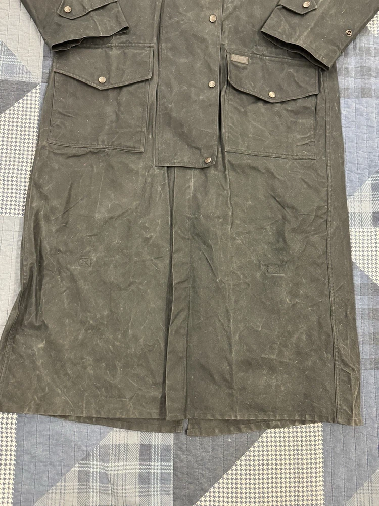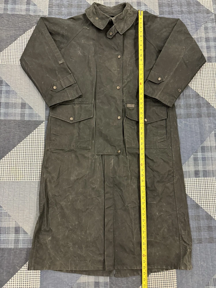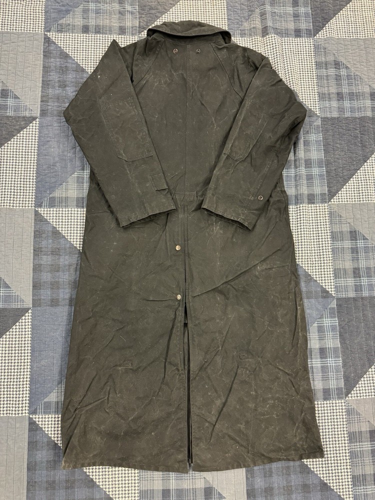This vintage Australian Outback Collection Drover Oil Coat Duster from the 90s is a stylish and functional piece for men in size M. Made from oilskin cotton canvas with a black color and a long trench coat length, the coat features a snap closure and a leather collar. It is designed with weather-resistant properties such as waterproof and windproof features, making it suitable for all seasons. The coat also includes practical elements like pockets and a bodywarmer, providing both style and utility for casual occasions.