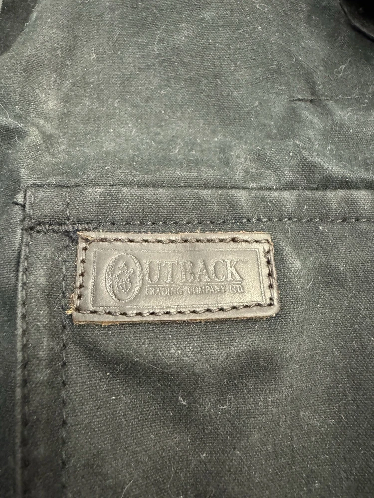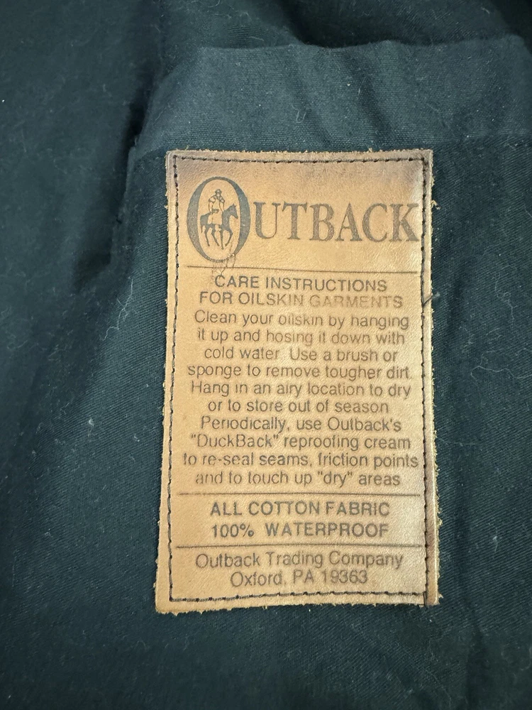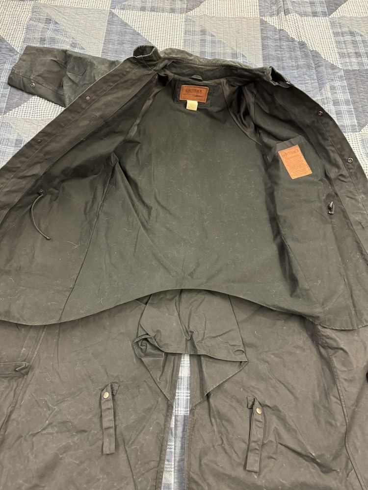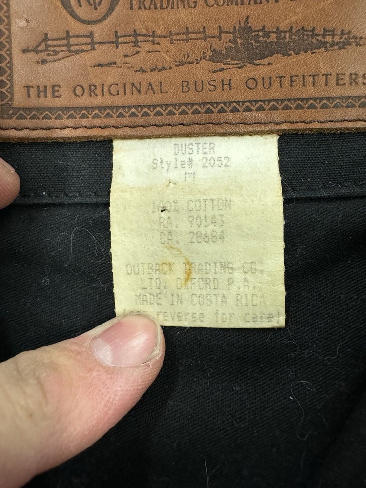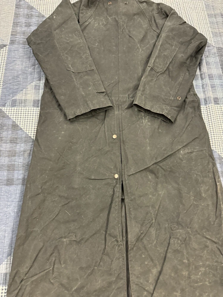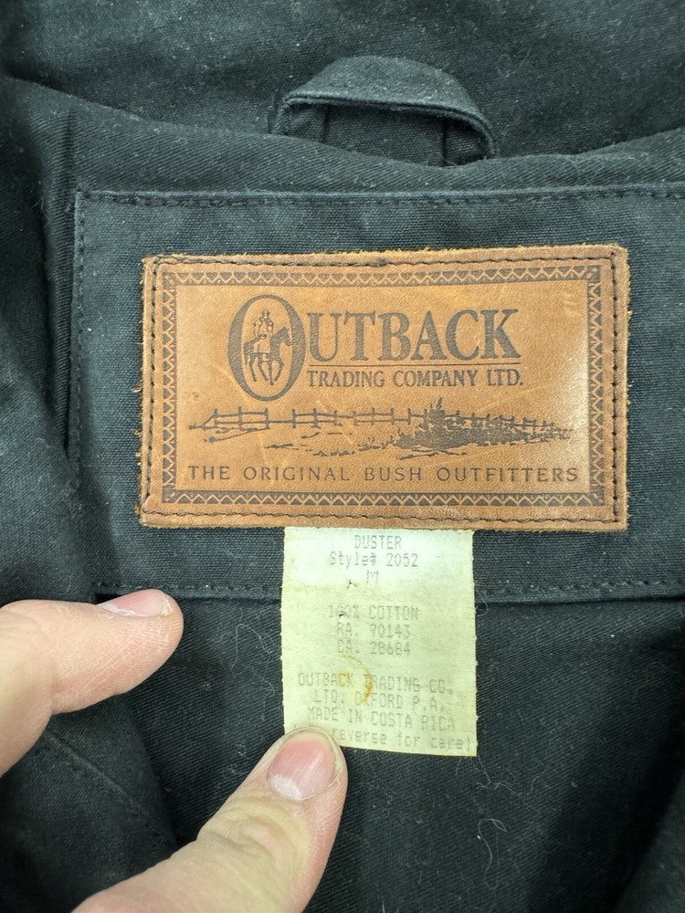 This vintage Australian Outback Collection Drover Oil Coat Duster from the 90s is a stylish and functional piece for men in size M. Made from oilskin cotton canvas with a black color and a long trench coat length, the coat features a snap closure and a leather collar. It is designed with weather-resistant properties such as waterproof and windproof features, making it suitable for all seasons. The coat also includes practical elements like pockets and a bodywarmer, providing both style and utility for casual occasions.