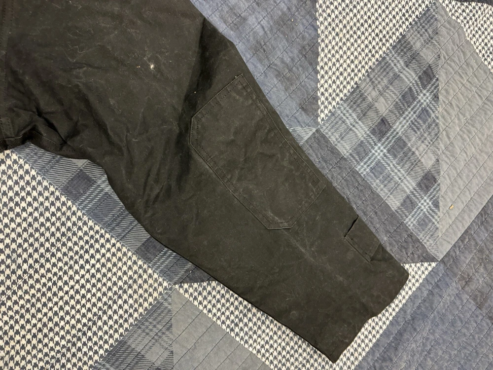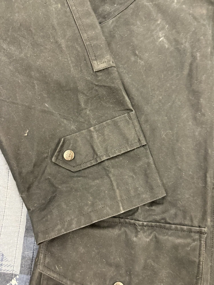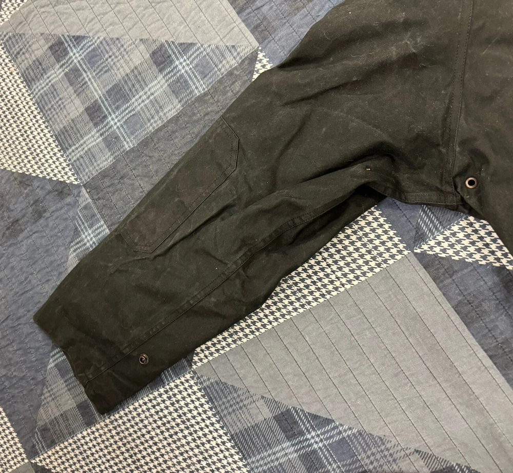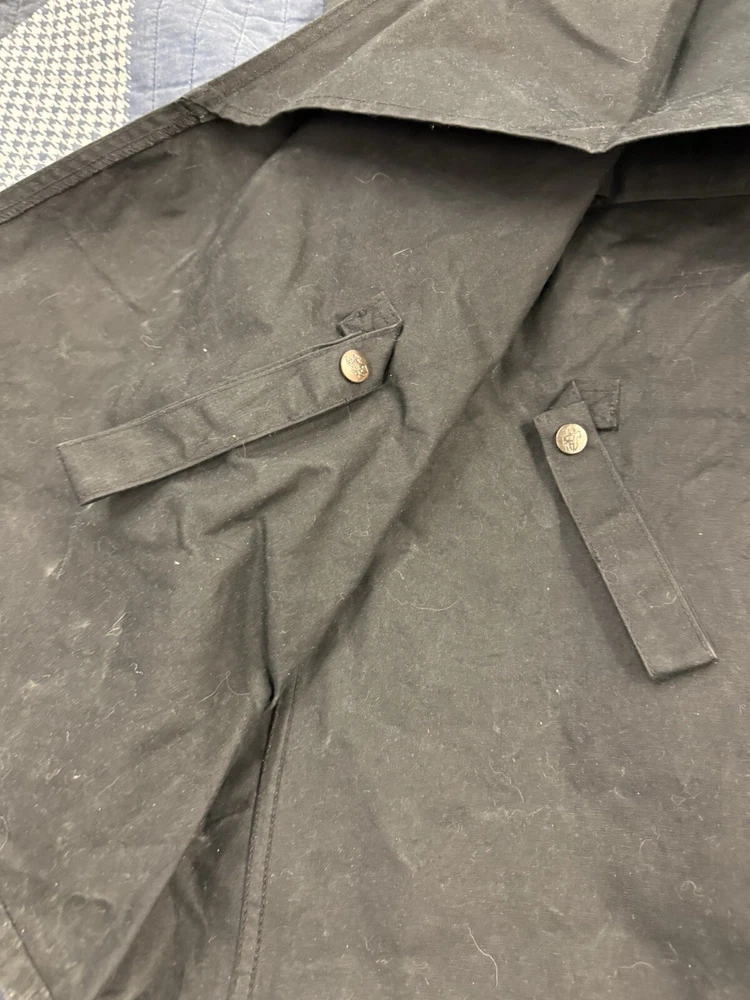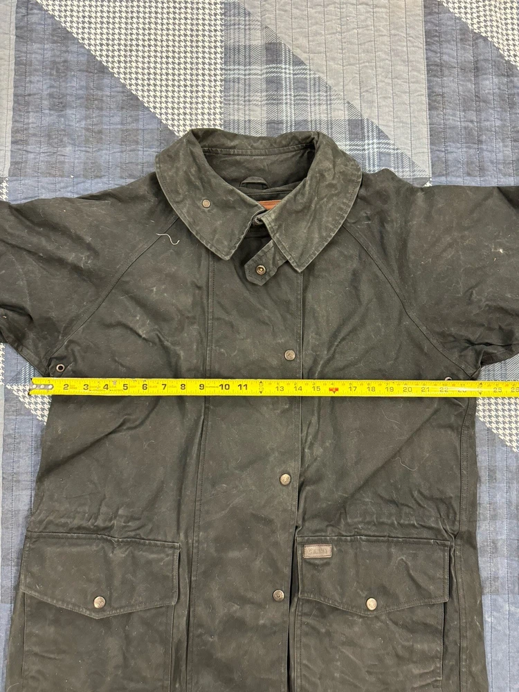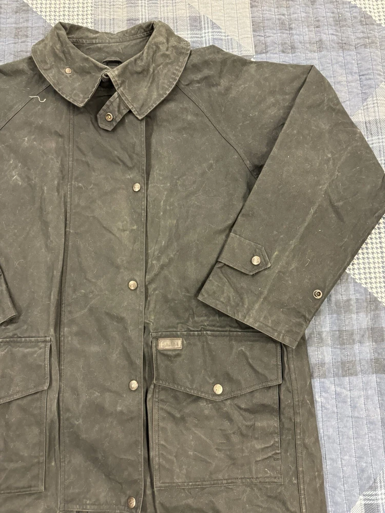 This vintage Australian Outback Collection Drover Oil Coat Duster from the 90s is a stylish and functional piece for men in size M. Made from oilskin cotton canvas with a black color and a long trench coat length, the coat features a snap closure and a leather collar. It is designed with weather-resistant properties such as waterproof and windproof features, making it suitable for all seasons. The coat also includes practical elements like pockets and a bodywarmer, providing both style and utility for casual occasions.