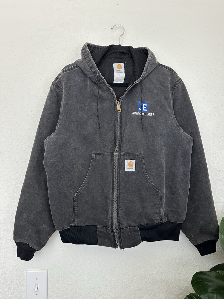 Good used condition See flaws on photos Very nice fade Charcoal black Company embroidered Tags are faded but it fits like medium Measures (24.5x26)