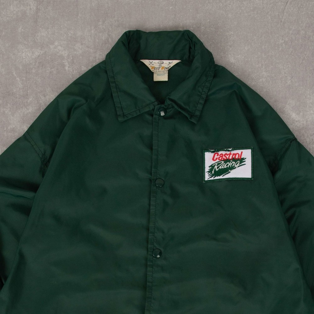 Men's Vintage 1990s Castrol Racing Coach Jacket + Damage: Minor Nicks To Back + Tag: West Wind + Made In USA + Outer Material: Nylon / Lining Material: Nylon + Colour: Green + Size Label States: Medium + Recommended Size: Medium + Measurements (Inches): Pit To Pit = 24, Body Length = 28 Please note that all vintage items have been previously worn, and may show some signs of previous wear. However, any significant damage will be photographed and/or stated in the items listing. Please note that damage to the inside may not always be photographed or listed.