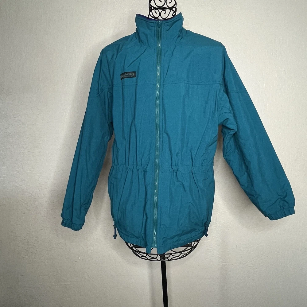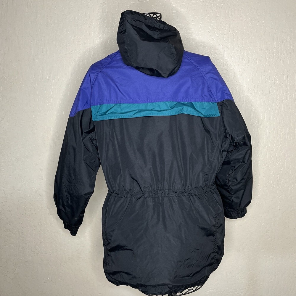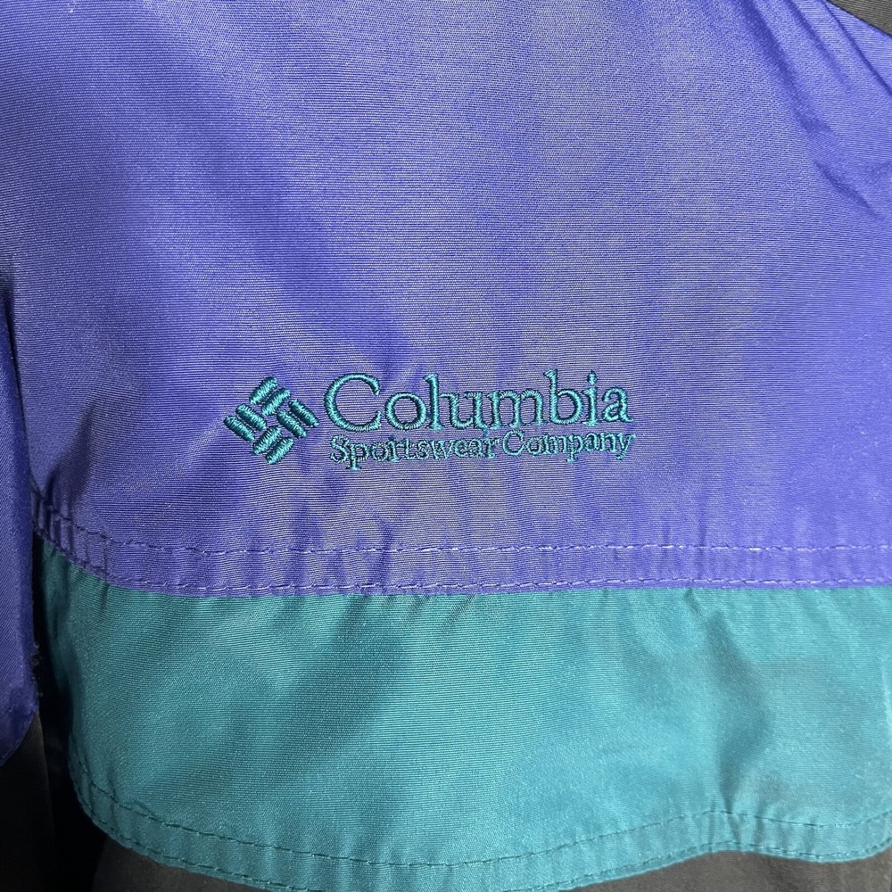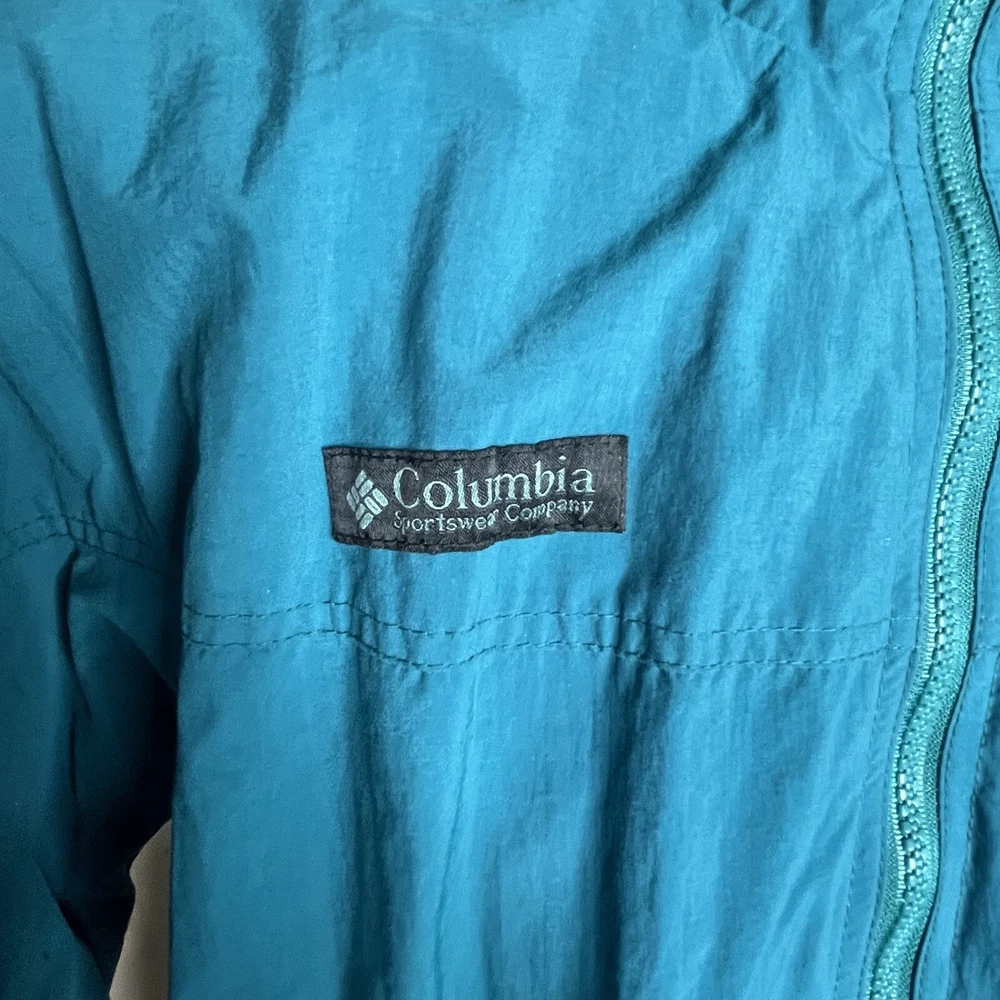 This vintage 90s Columbia jacket is a must-have for any outdoor enthusiast. With its green lined hooded design, it is perfect for travel, snowboarding, skiing, and casual wear. The jacket features a full zip and snap closure, along with inner pockets and zipped pockets for added convenience. Made from a combination of nylon and polyester, this mid-length jacket is both wind and water-resistant, making it perfect for all seasons. The removable hood and lining add versatility to the jacket, while the elastic waist and collared design provide a comfortable fit. This jacket is a true retro snow coat and is perfect for anyone looking for a vintage 90s Columbia experience. No flaws noted and approximate measurements are: Armpit to armpit 23” Waist 38” Hips 46” Shoulder to hem 29”