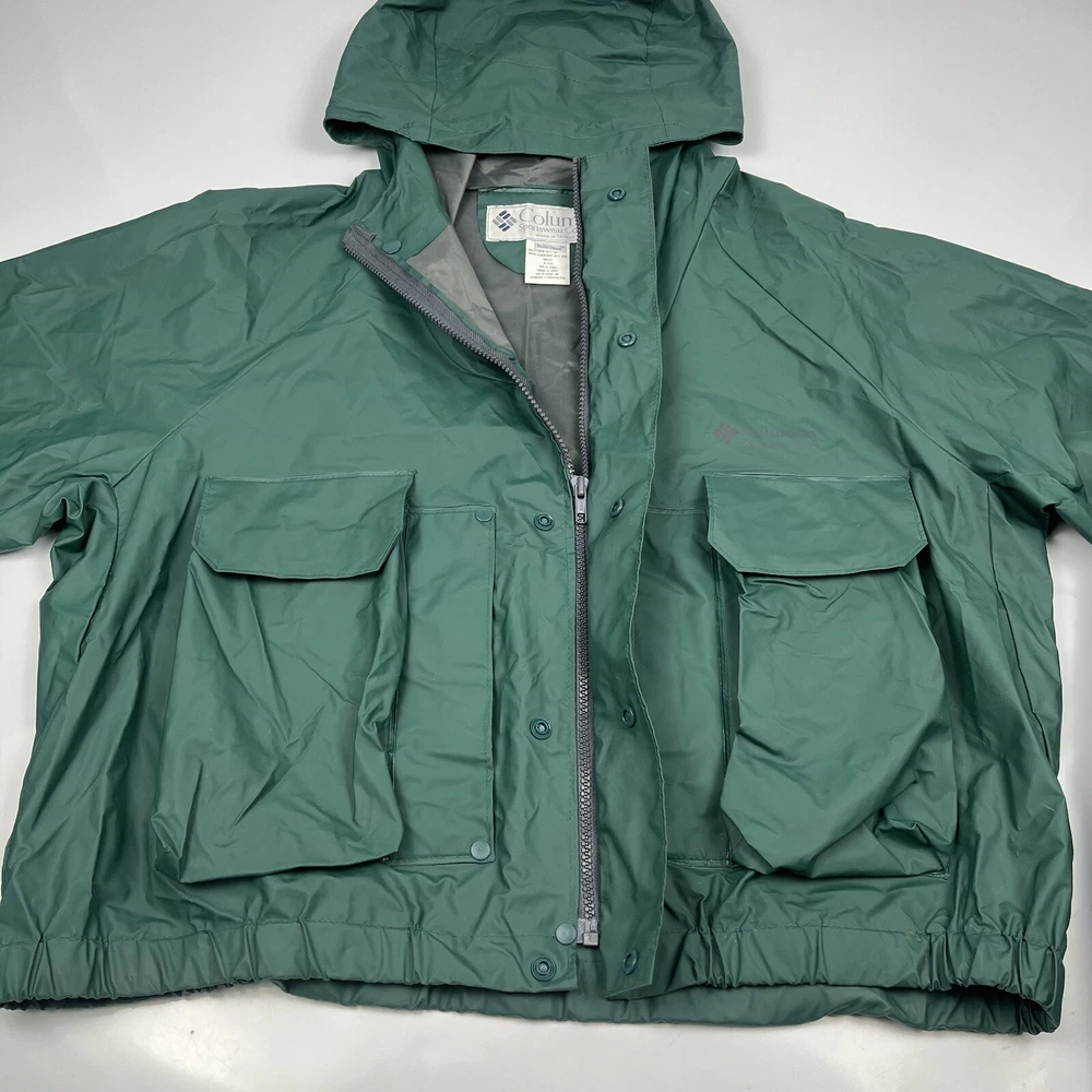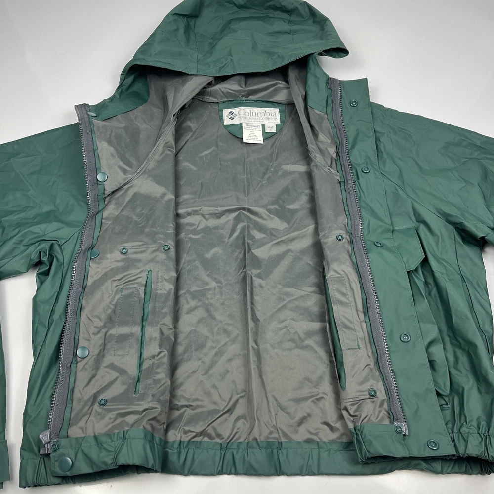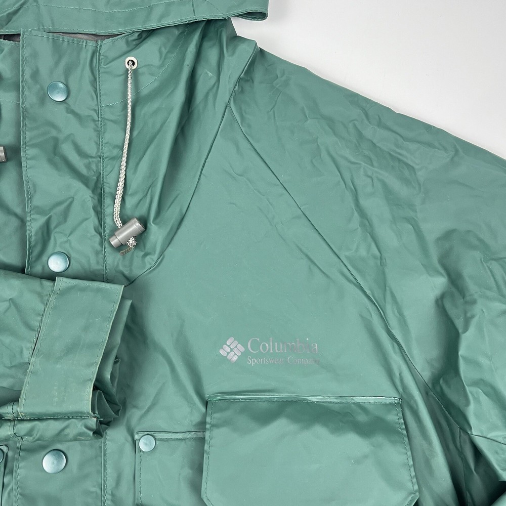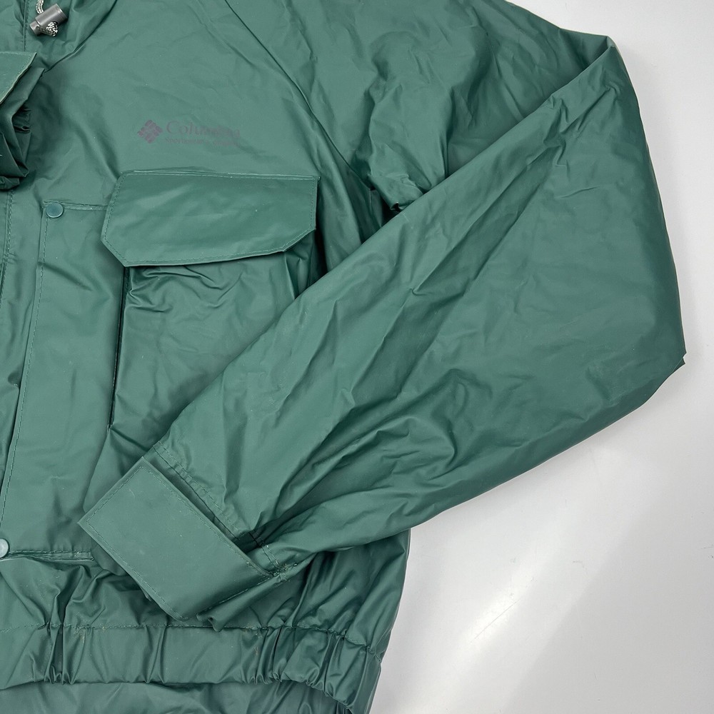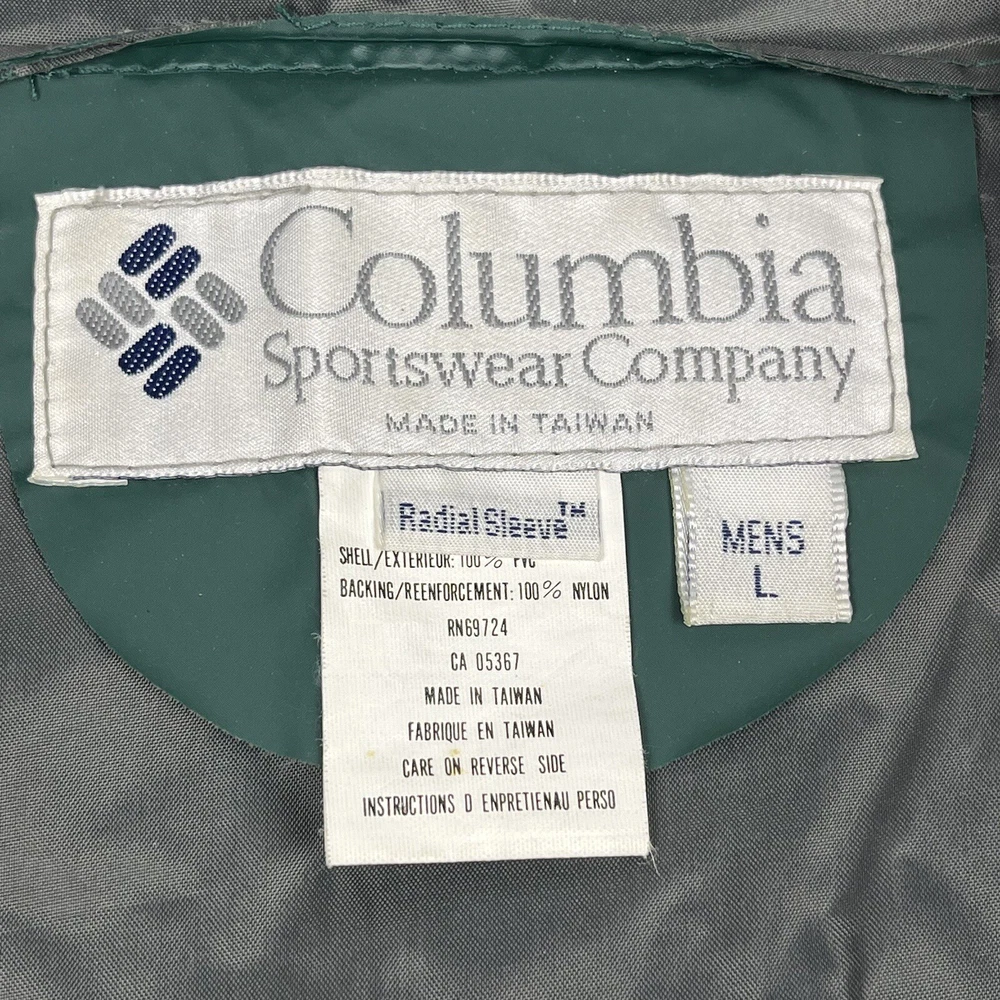 This vintage 90s Columbia jacket is a must-have for any outdoor enthusiast. Made with PVC outer shell material and a nylon lining, this jacket is both water-resistant and wind-resistant, making it the perfect choice for any weather condition. The jacket features a full zip, snap, drawstring closure, and a hood for added protection. It also has multiple pockets for convenience and style. The jacket is a mid-length raincoat that is lightweight, quick-drying, and breathable, making it suitable for all seasons. The green color and Columbia logo add a classic touch to this 90s-inspired jacket. The jacket is a size L and has a regular fit. It is perfect for any occasion, whether it is for travel, casual, or workwear. This jacket is suitable for various outdoor activities, such as hiking, camping, skiing, fishing, and climbing. Its performance and activity features make it a perfect choice for anyone who loves outdoor sports. The jacket is a perfect representation of the 90s style and outdoor sports theme. It is a must-buy for anyone who loves vintage clothing and outdoor activities. FLAWS - A Few Small Marks Around Jacket. See Picture 16, 17 & 24 for closer look.