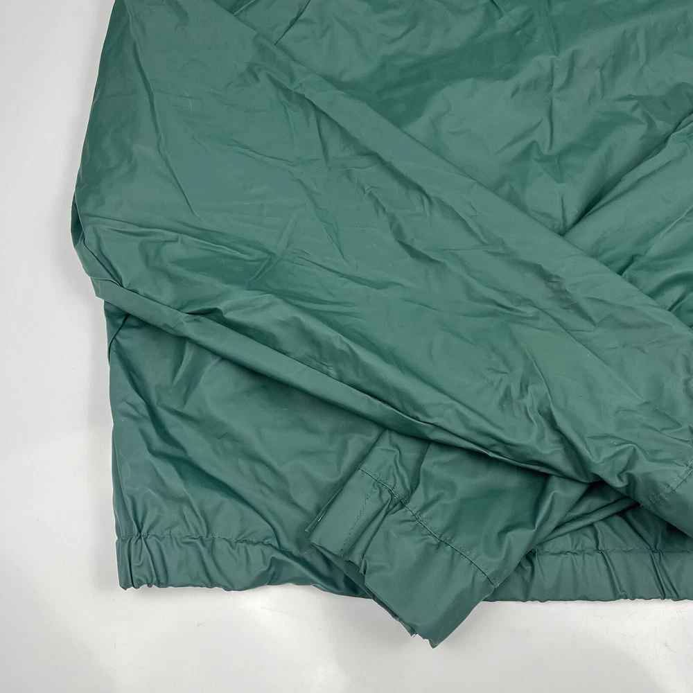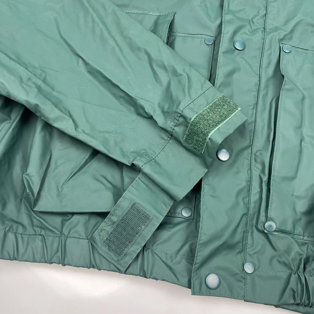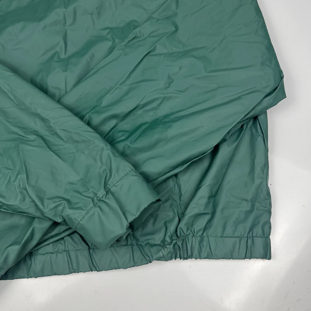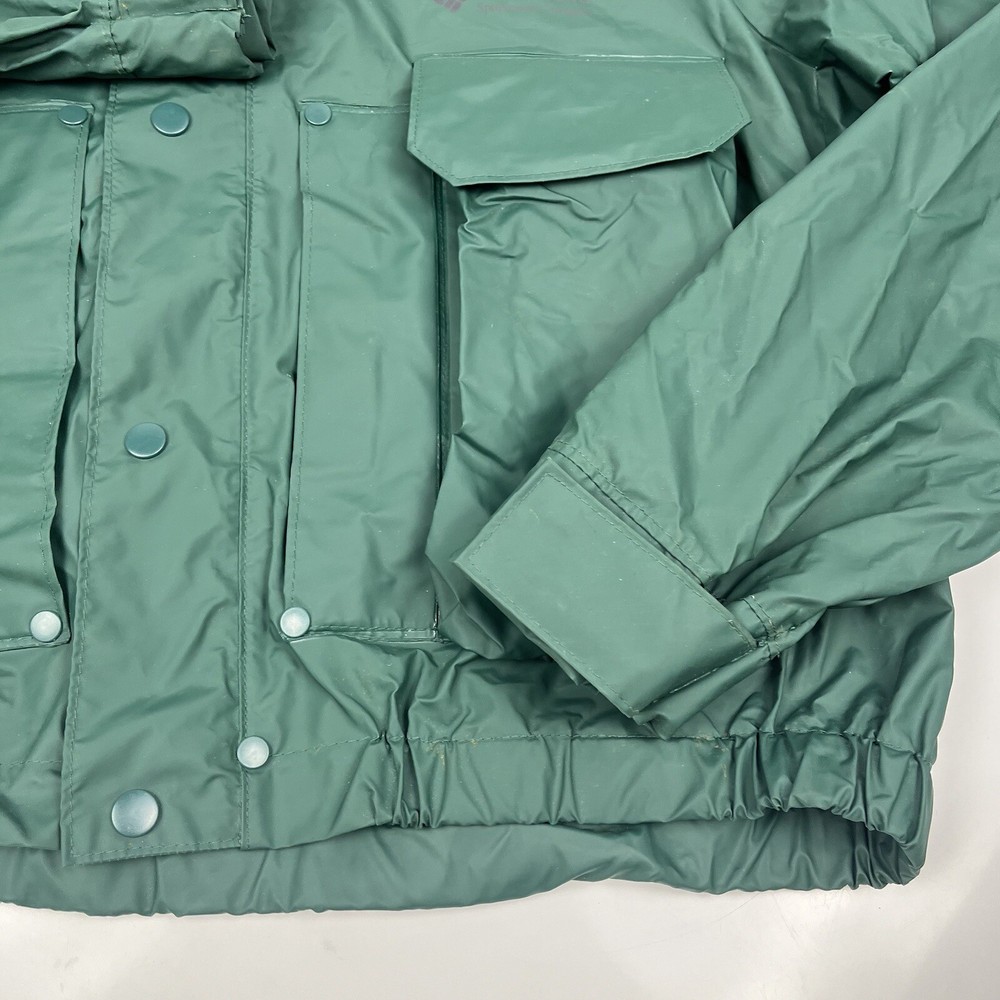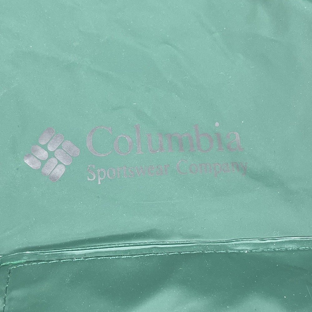 This vintage 90s Columbia jacket is a must-have for any outdoor enthusiast. Made with PVC outer shell material and a nylon lining, this jacket is both water-resistant and wind-resistant, making it the perfect choice for any weather condition. The jacket features a full zip, snap, drawstring closure, and a hood for added protection. It also has multiple pockets for convenience and style. The jacket is a mid-length raincoat that is lightweight, quick-drying, and breathable, making it suitable for all seasons. The green color and Columbia logo add a classic touch to this 90s-inspired jacket. The jacket is a size L and has a regular fit. It is perfect for any occasion, whether it is for travel, casual, or workwear. This jacket is suitable for various outdoor activities, such as hiking, camping, skiing, fishing, and climbing. Its performance and activity features make it a perfect choice for anyone who loves outdoor sports. The jacket is a perfect representation of the 90s style and outdoor sports theme. It is a must-buy for anyone who loves vintage clothing and outdoor activities. FLAWS - A Few Small Marks Around Jacket. See Picture 16, 17 & 24 for closer look.