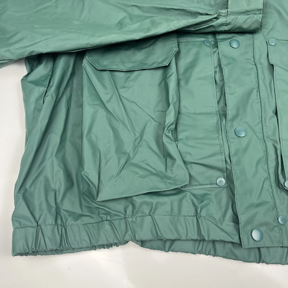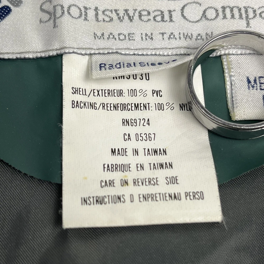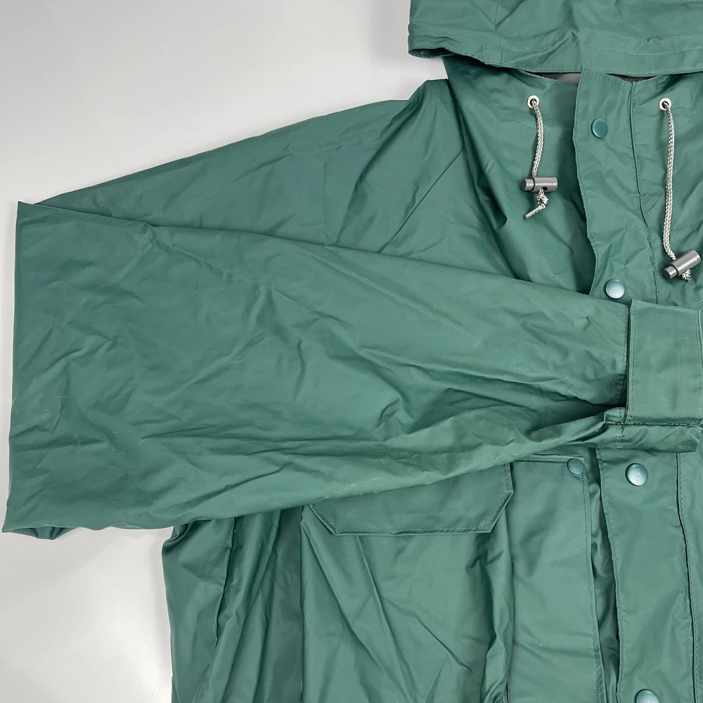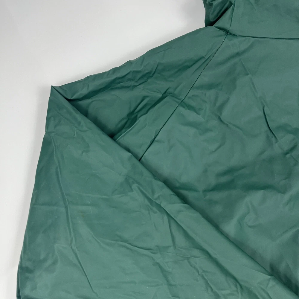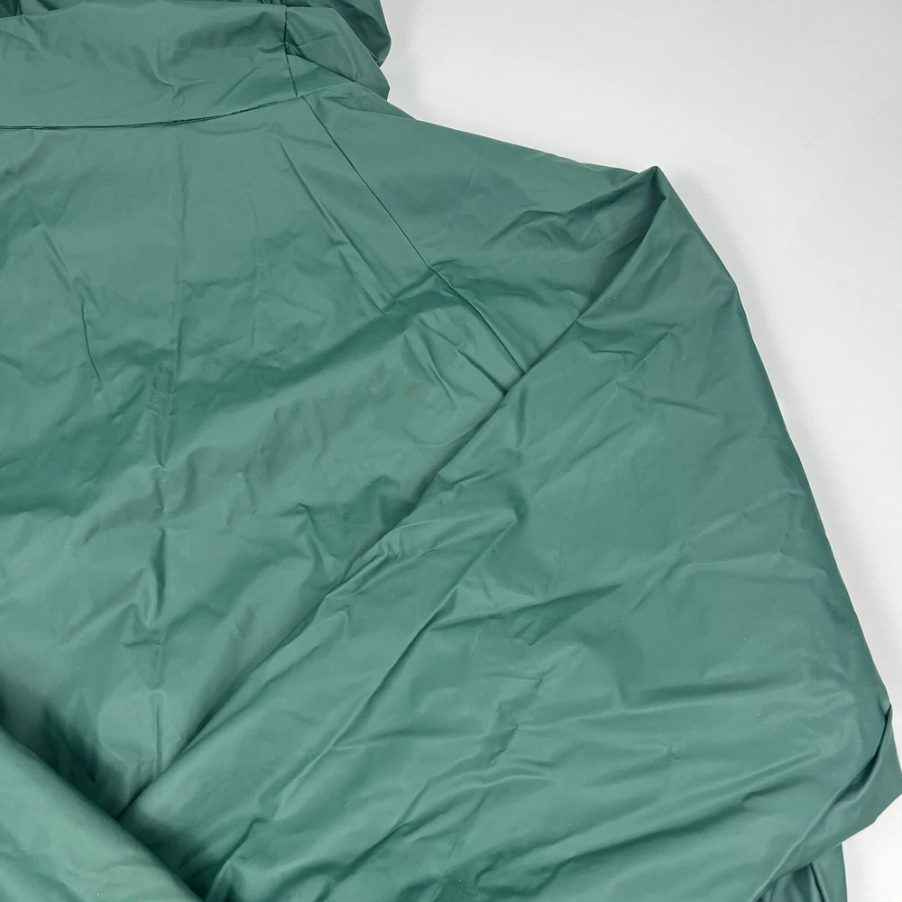 This vintage 90s Columbia jacket is a must-have for any outdoor enthusiast. Made with PVC outer shell material and a nylon lining, this jacket is both water-resistant and wind-resistant, making it the perfect choice for any weather condition. The jacket features a full zip, snap, drawstring closure, and a hood for added protection. It also has multiple pockets for convenience and style. The jacket is a mid-length raincoat that is lightweight, quick-drying, and breathable, making it suitable for all seasons. The green color and Columbia logo add a classic touch to this 90s-inspired jacket. The jacket is a size L and has a regular fit. It is perfect for any occasion, whether it is for travel, casual, or workwear. This jacket is suitable for various outdoor activities, such as hiking, camping, skiing, fishing, and climbing. Its performance and activity features make it a perfect choice for anyone who loves outdoor sports. The jacket is a perfect representation of the 90s style and outdoor sports theme. It is a must-buy for anyone who loves vintage clothing and outdoor activities. FLAWS - A Few Small Marks Around Jacket. See Picture 16, 17 & 24 for closer look.