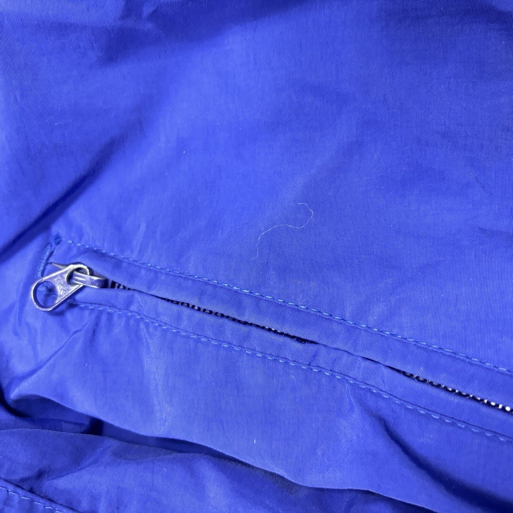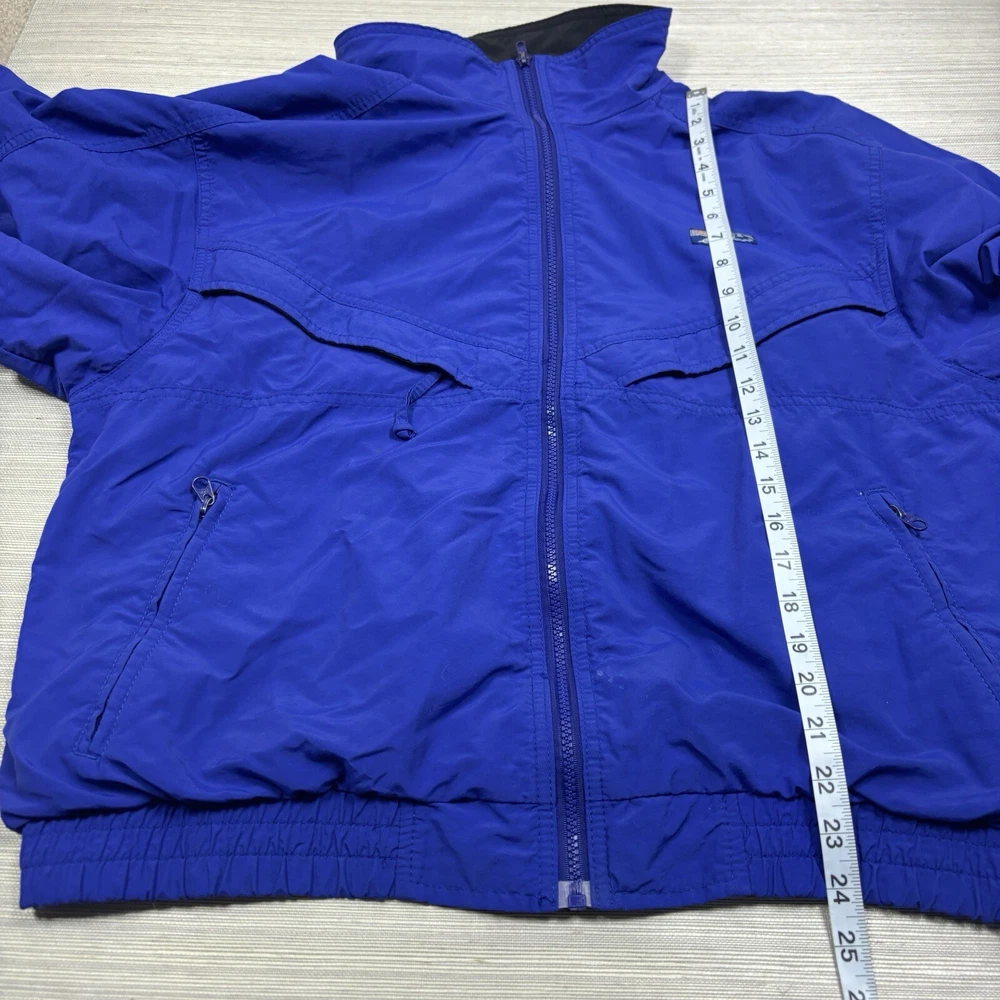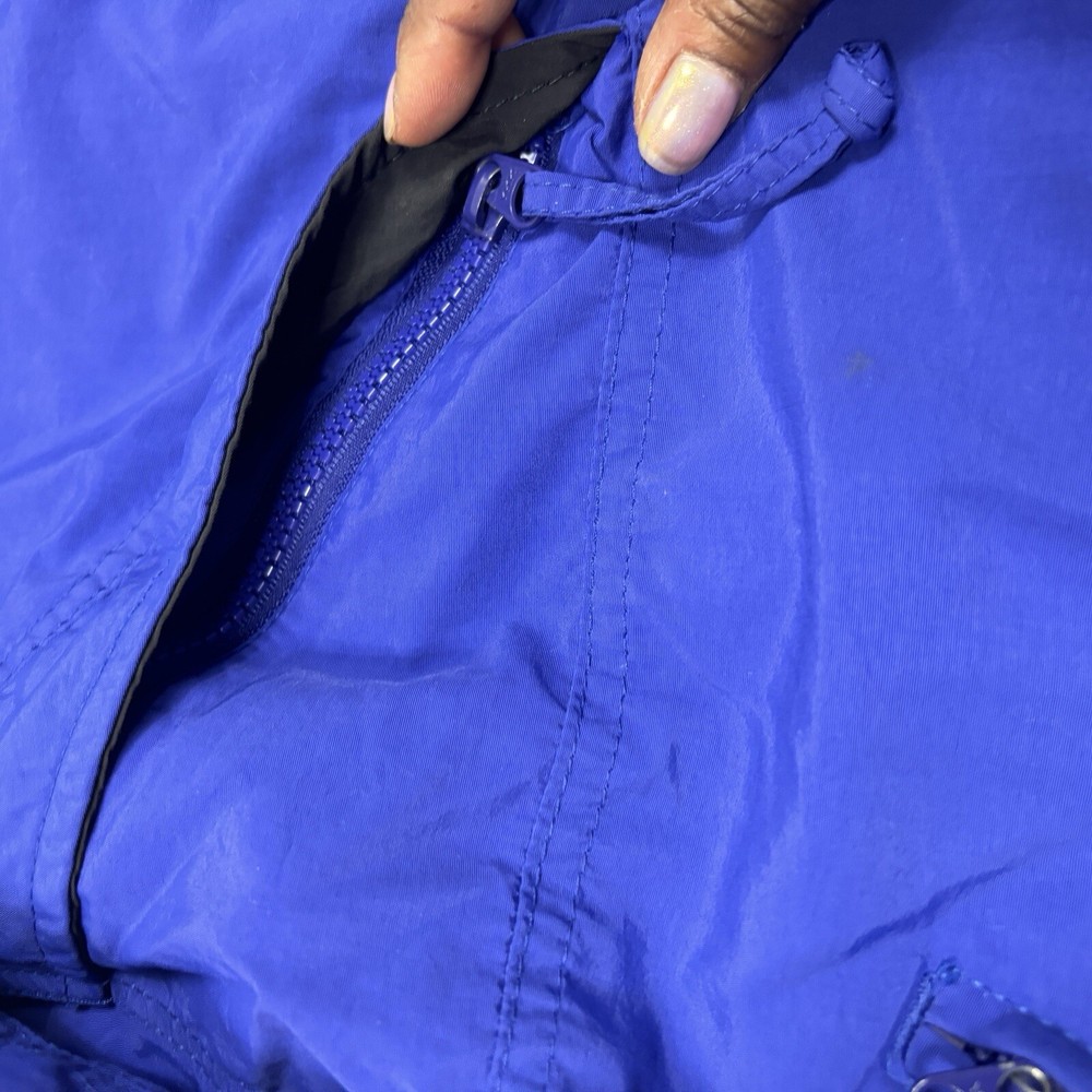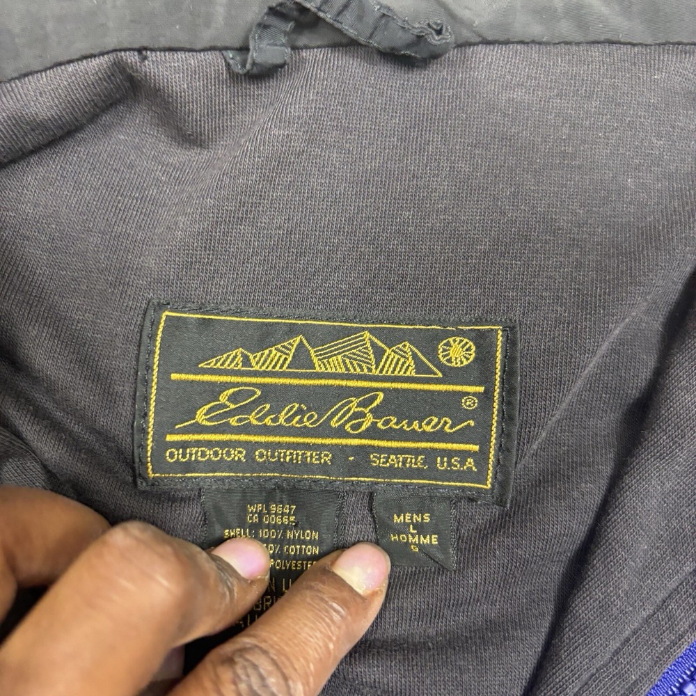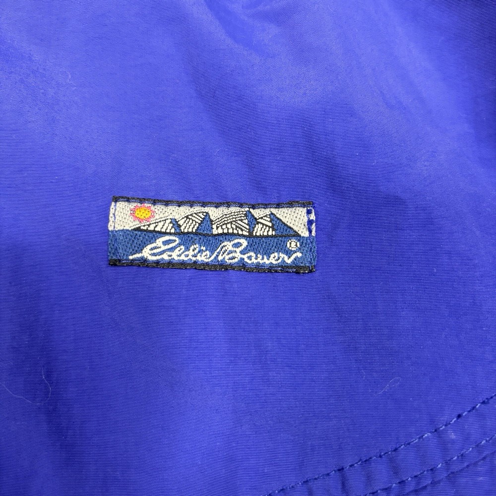 This vintage Eddie Bauer windbreaker is perfect for any outdoor activity. Made from softshell nylon fabric, it is both waterproof and wind-resistant, making it suitable for all seasons. The full zip closure and stand-up collar provide extra protection against the elements, while the zipped pockets allow for convenient storage of your belongings. This mid-length windbreaker features a relaxed fit and is available in size L. The blue solid pattern and 90s outdoor theme make it a stylish addition to your wardrobe. Garment care is easy with machine-washable polyester lining and quick-drying features. Handmade in the United States, this jacket is perfect for walking, cycling, hiking, running, and jogging. Preowned in great conditionSee pics for measurements Color is brighter in the pic. The real color is a true blue( not royal) with purple undertones. Message for additional pics if needed! ****the inside hem of the sleeves are coming apart, sewing it would be an easy fix. SEE ADDITIONAL PICTURES ******