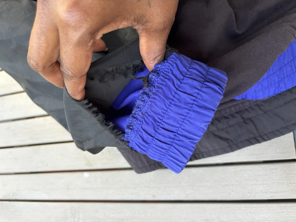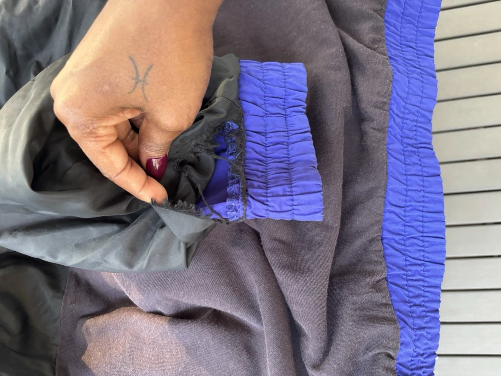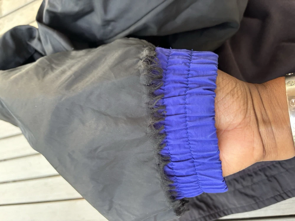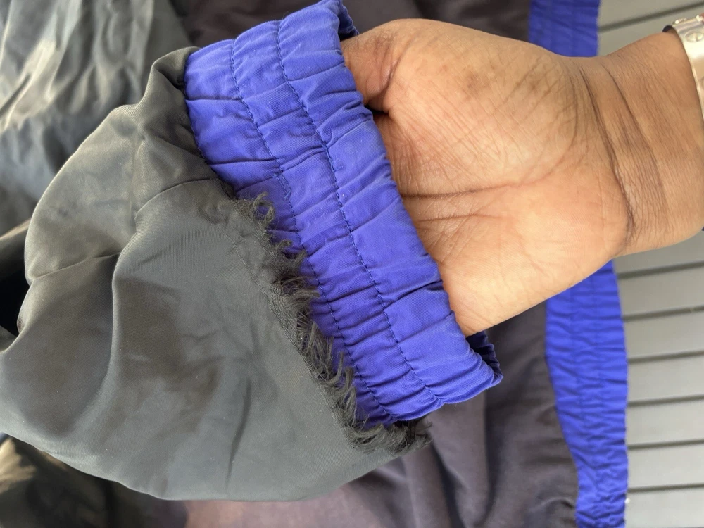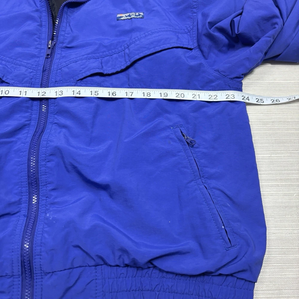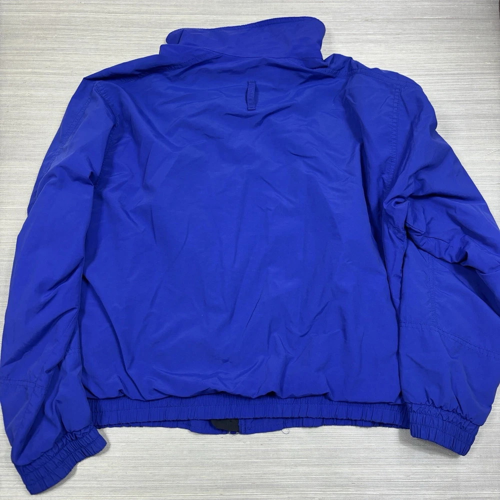 This vintage Eddie Bauer windbreaker is perfect for any outdoor activity. Made from softshell nylon fabric, it is both waterproof and wind-resistant, making it suitable for all seasons. The full zip closure and stand-up collar provide extra protection against the elements, while the zipped pockets allow for convenient storage of your belongings. This mid-length windbreaker features a relaxed fit and is available in size L. The blue solid pattern and 90s outdoor theme make it a stylish addition to your wardrobe. Garment care is easy with machine-washable polyester lining and quick-drying features. Handmade in the United States, this jacket is perfect for walking, cycling, hiking, running, and jogging. Preowned in great conditionSee pics for measurements Color is brighter in the pic. The real color is a true blue( not royal) with purple undertones. Message for additional pics if needed! ****the inside hem of the sleeves are coming apart, sewing it would be an easy fix. SEE ADDITIONAL PICTURES ******