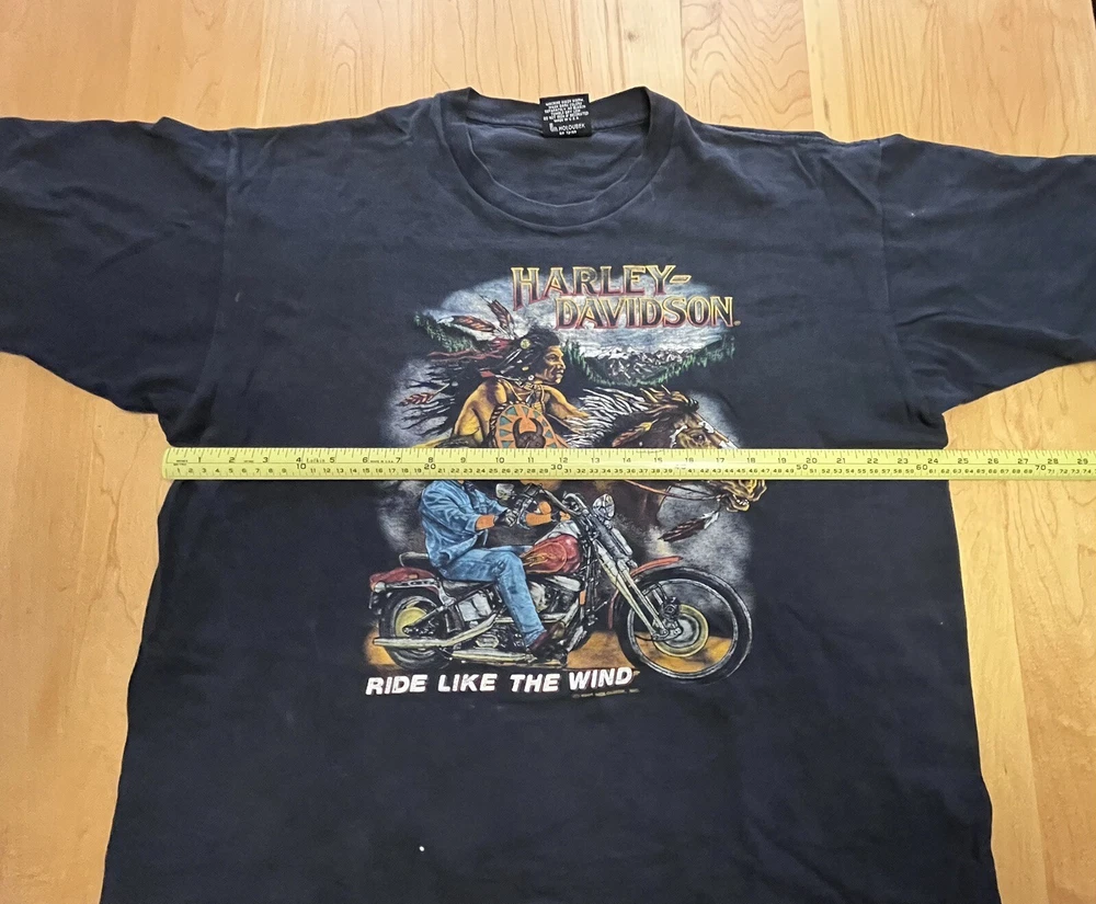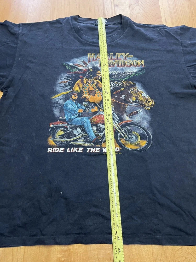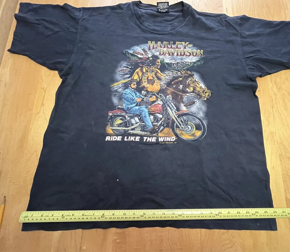 This vintage Harley-Davidson biker T-shirt is a must-have for any motorcycle enthusiast. The shirt features a bold graphic print with the words "Ride Like The Wind" and a classic Harley-Davidson logo. The shirt is made from high-quality cotton material and is designed with short sleeves and a crew neck. Made in the USA BY HOLOUBEK. This T-shirt is perfect for any casual occasion and can be worn all year round. The shirt is available in size XL and features a regular fit. Its black color and animal print pattern make it an eye-catching piece that can be paired with jeans or shorts. This vintage T-shirt is a unique find and is sure to become a favorite in any biker's wardrobe. Be sure to check out all my vintage clothing Listings!! May have some fading and loose threads and small stains associated with a vintage preowned shirt from this era. Be sure to measure your favorite shirt and compare to make sure it’s the perfect fit. Measurements are in the pictures . Comes from a smoke free home. Shipped fast with usps first class mail. Please ask questions and inspect pictures as there are no returns.