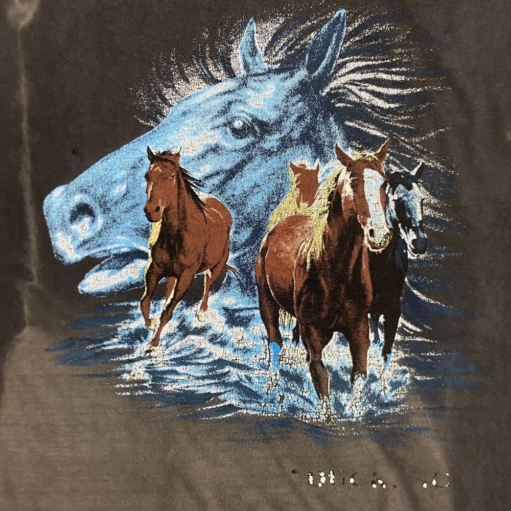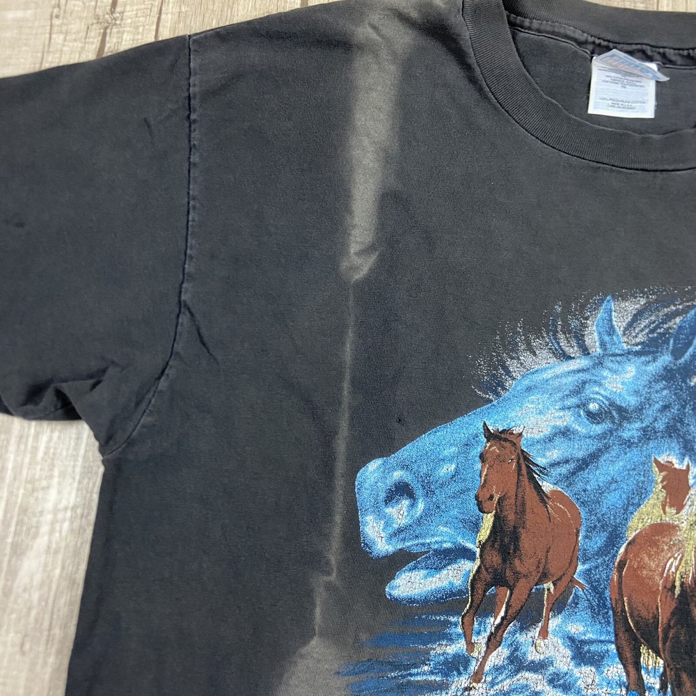 Item : Vintage 90s Horse Nature Graphic Faded Black T-Shirt Size XL Condition : Has some cracking on the graphic, some really nice sun fading all over the shirt, a couple holes and some over all wear but still in good preloved condition Measurements : Length : 29.25in. Width : 22.5in. *Item is previously owned and may have light stains, wash wear, fading, image cracking and/or tag wear.* *Vintage sizes vary from true sizes. See measurements for a good fit.* *Any variation in coloring is due to lighting during photography.* Follow us on Instagram @viceversa_stl