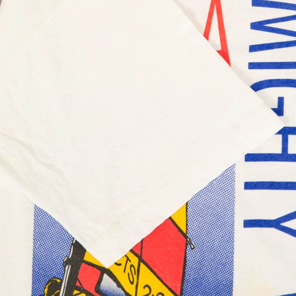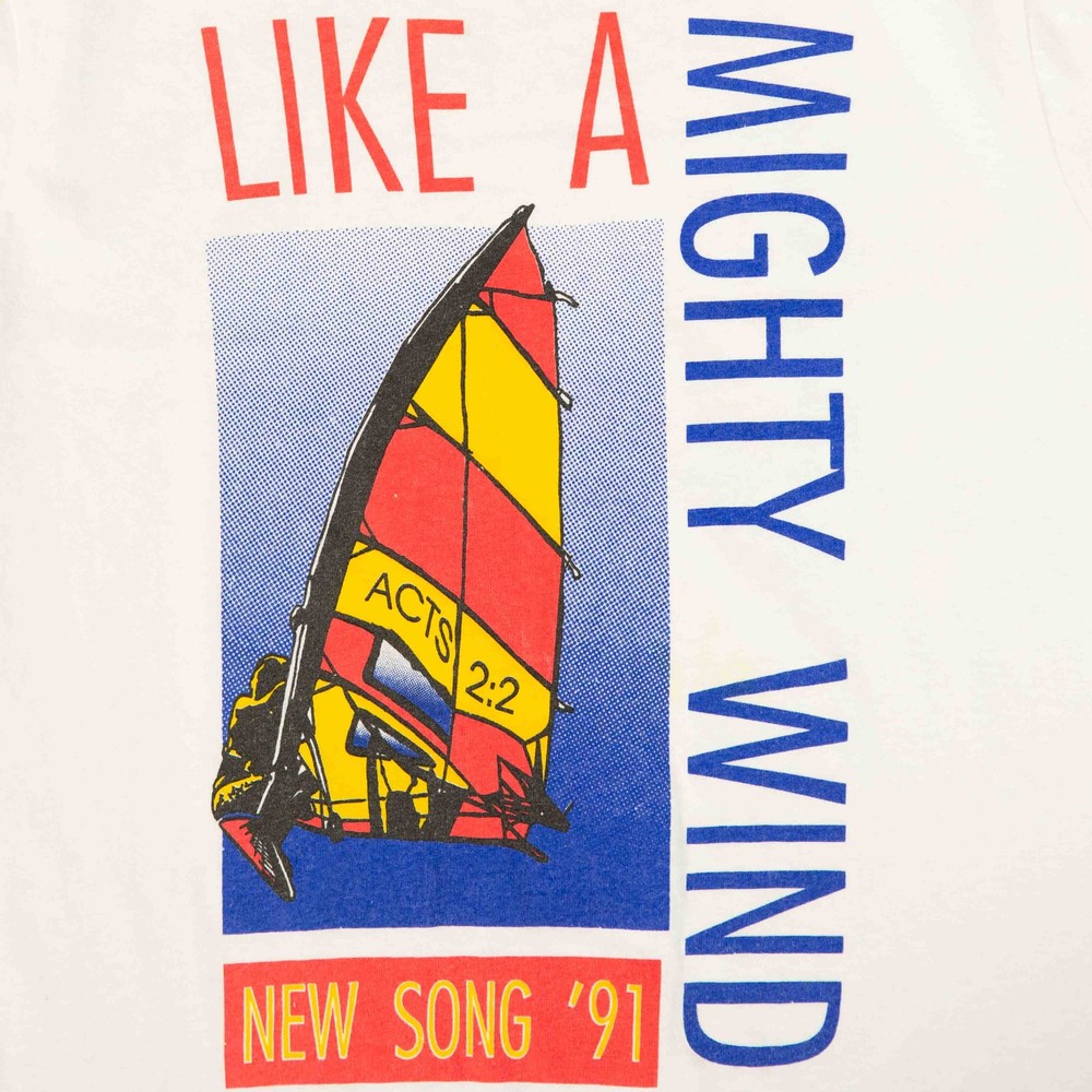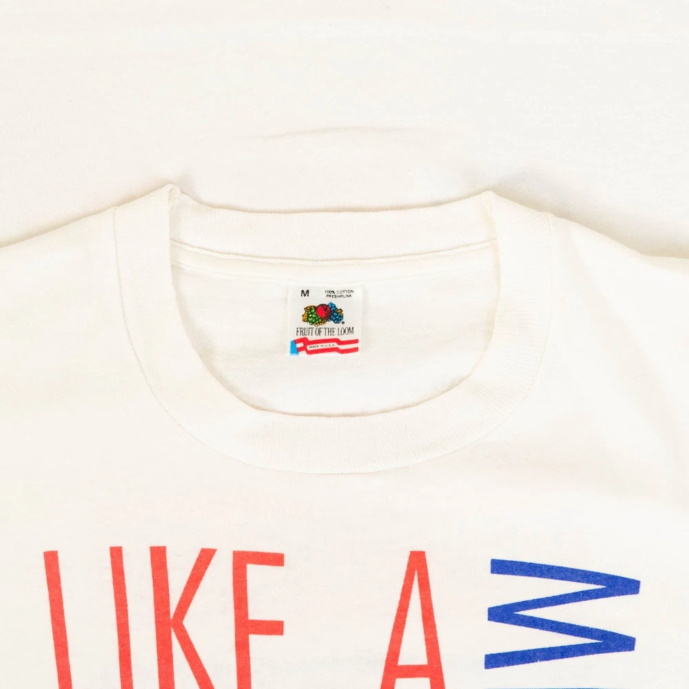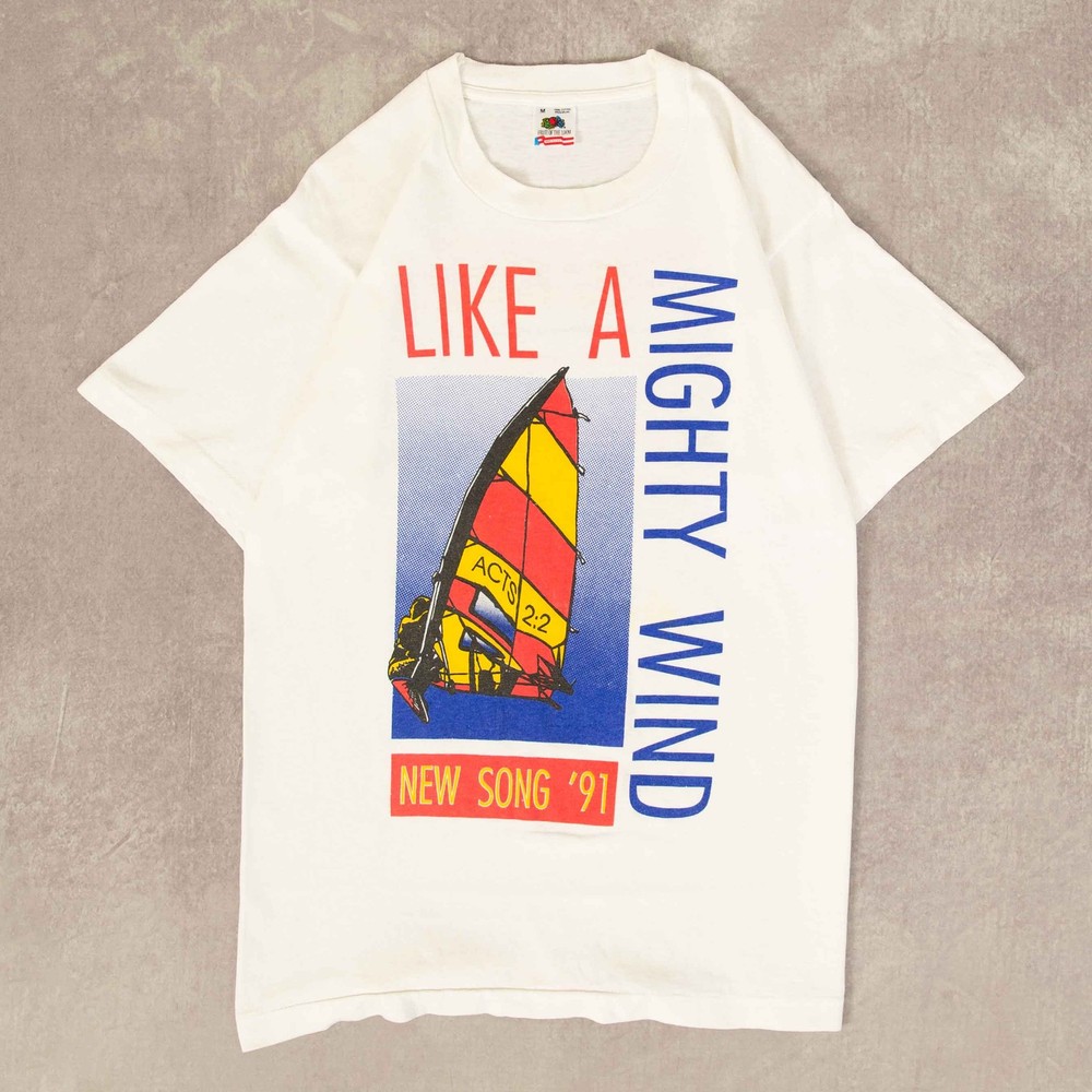 Women's Vintage 1991 Like A Mighty Wind Single Stitch T-Shirt + Material: Cotton Blend + Colour: White + Size Label States: Medium + Recommended Size: Medium + Measurements (Inches): Pit To Pit = 18, Body Length = 27 Please note that all vintage items have been previously worn, and may show some signs of previous wear. However, any significant damage will be photographed and/or stated in the items listing. Please note that damage to the inside may not always be photographed or listed.