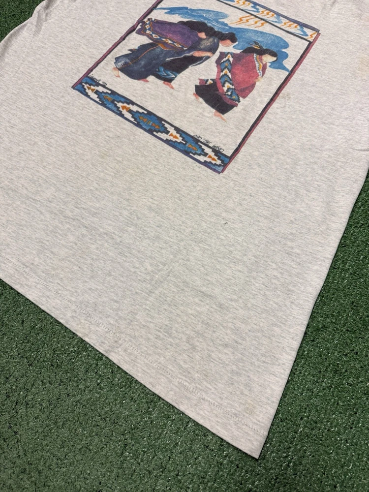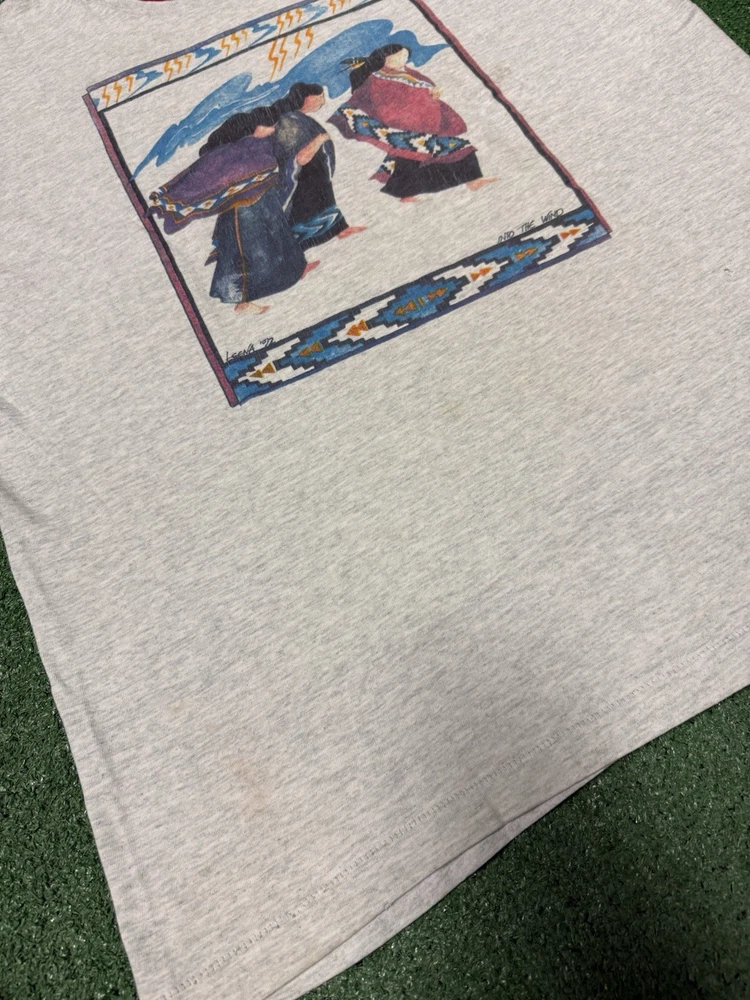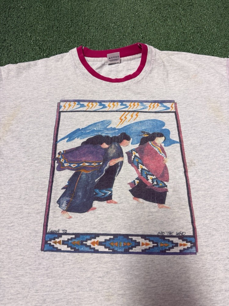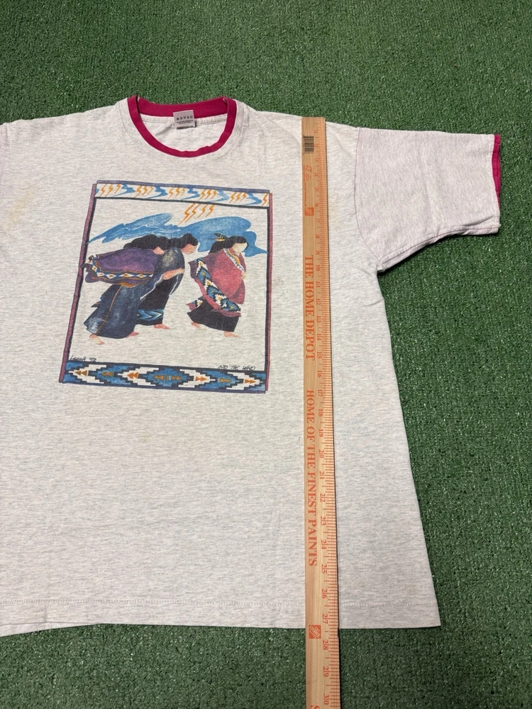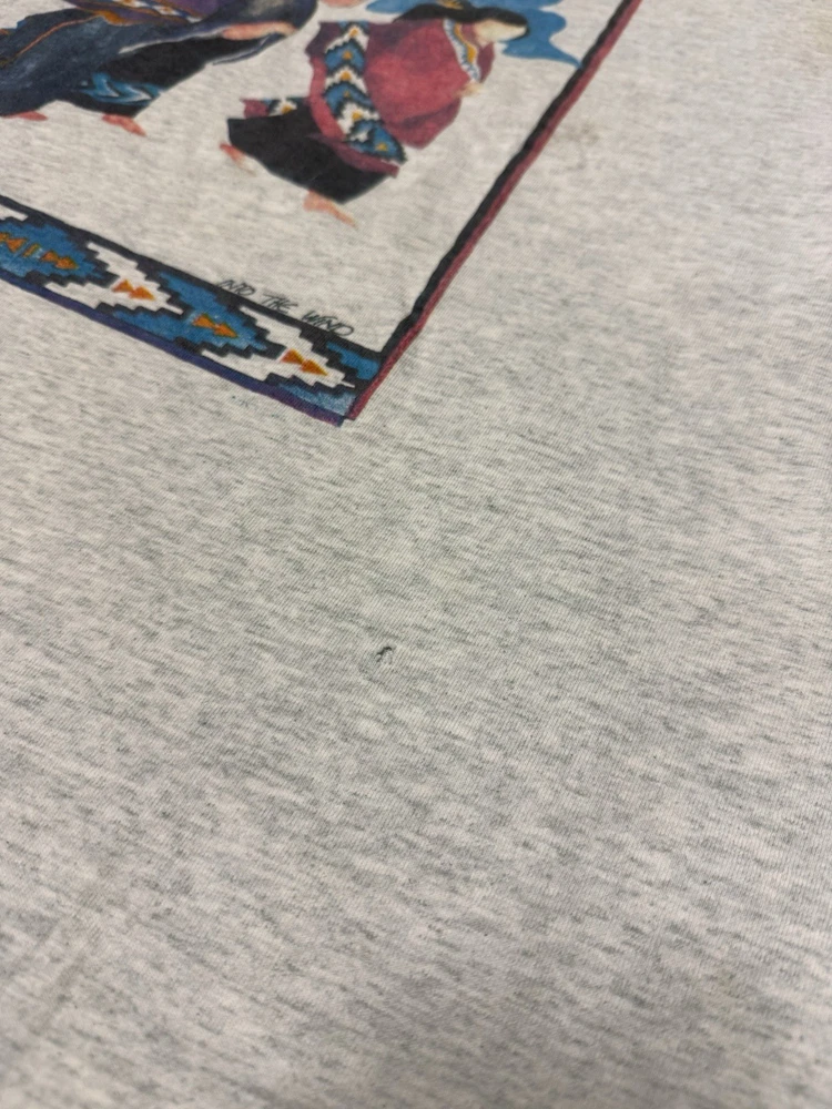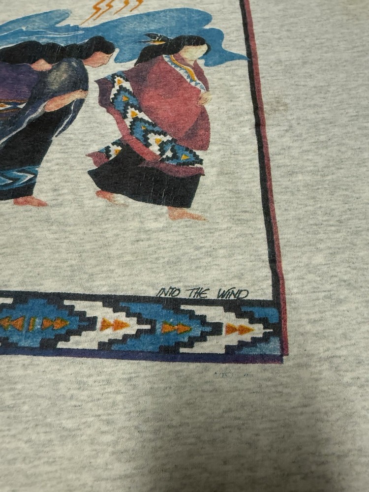 - [ ] This Vintage piece shows minor signs of wear. Minor stains throughout and some fabric bleeding As shown in pictures. This piece has been washed and is sourced secondhand Embrace the essence of vintage flair with this 90s Native American “Into The Wind” Art Shirt. The shirt, bearing the iconic Astro Boy character, is a perfect blend of nature-inspired theme and classic comic appeal. Offered in a versatile gray hue, this T-shirt is made from soft, breathable cotton ensuring comfort for all-day wear. This regular fit, size XL tee from Fruit of the Loom features a solid pattern that exudes a timeless vibe. Designed with a crew neck and short sleeves, it's ideal for every season. Proudly made in the United States, the shirt is easy to care for and preshrunk for a consistent look wash after wash.