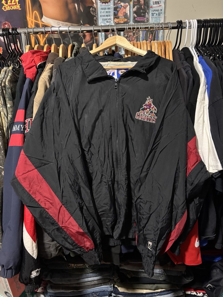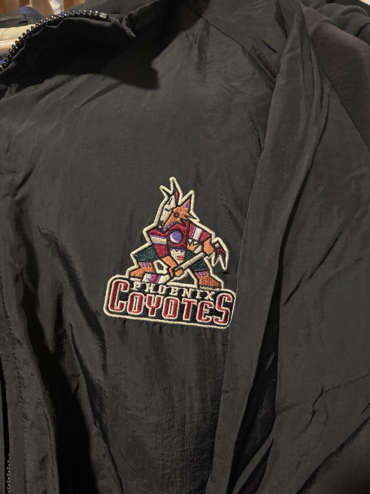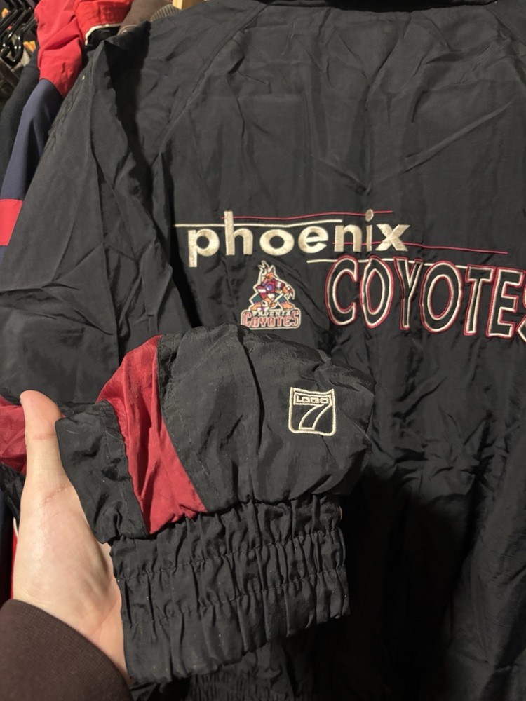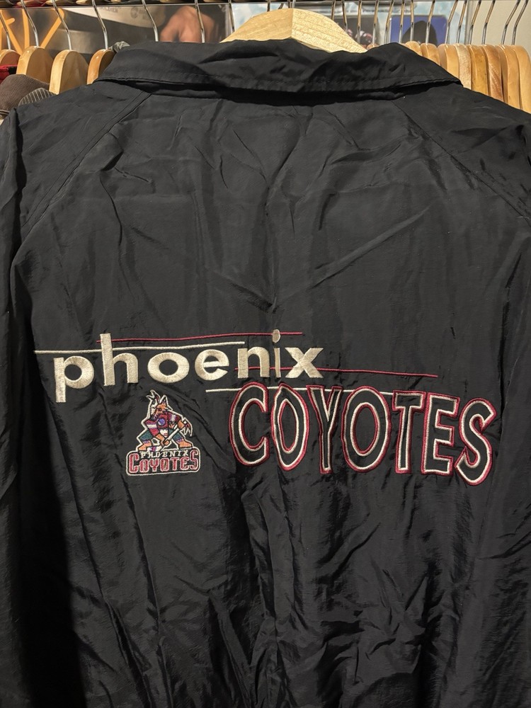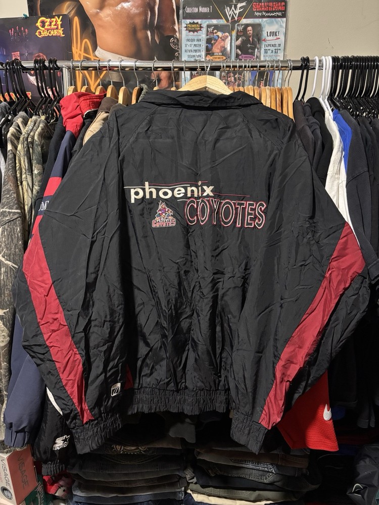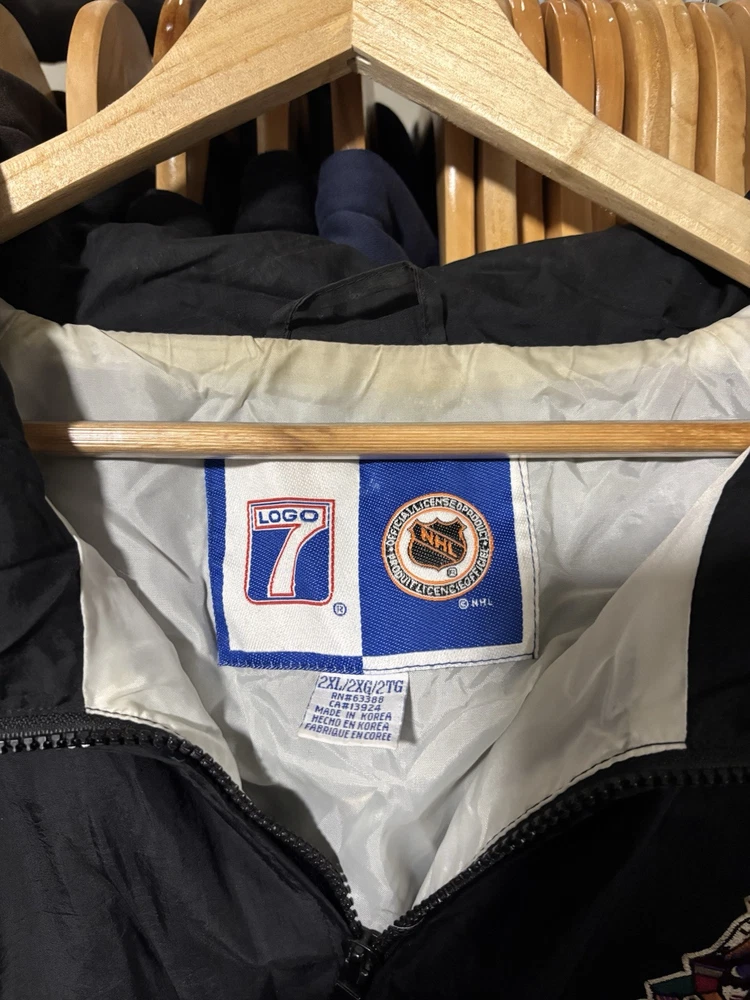 This vintage 90s Phoenix Coyotes Logo 7 NHL Hockey Windbreaker is a black, oversized jacket made of nylon. It features pleated accents, embroidered logos, and a full zipper closure. The wind-resistant jacket is lightweight and lined with nylon, making it suitable for all seasons. With a classic 90s design, this limited edition piece is perfect for casual occasions or showing support for the Coyotes. 27 inch chest 29 inch length Condition as shown Certified seller on depop under Chicago_Exclusives ! Message if any questions or offers :)