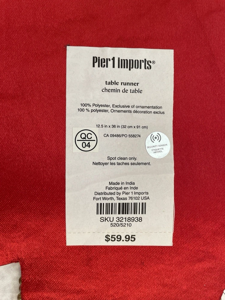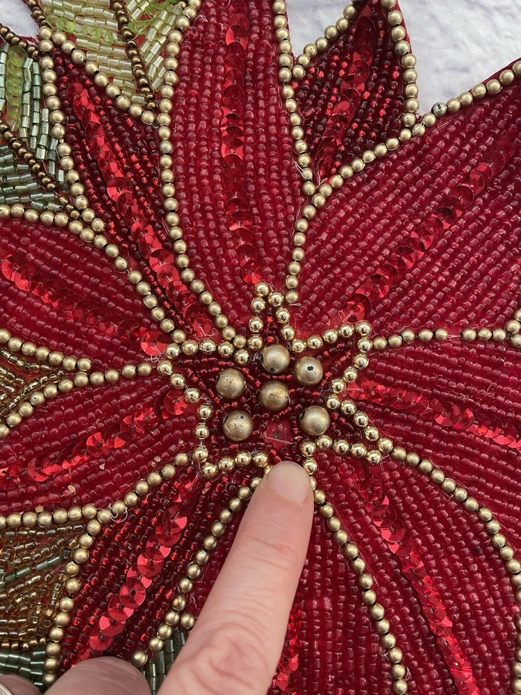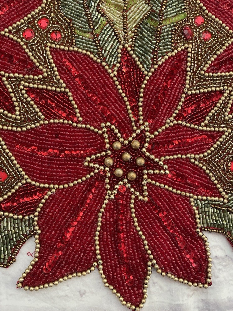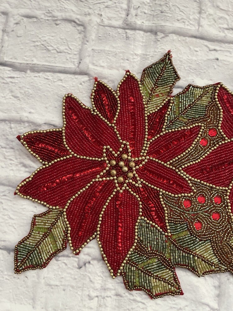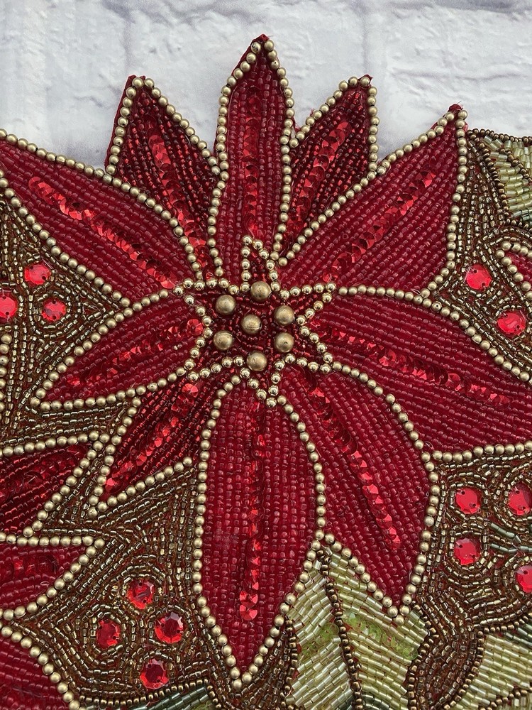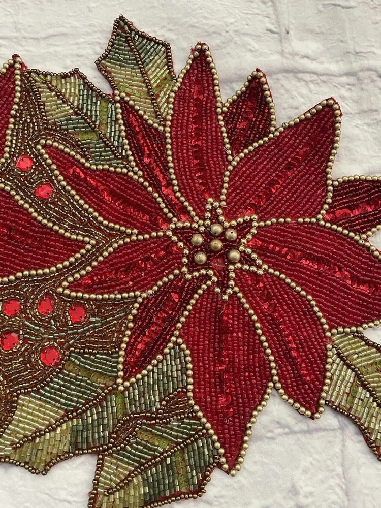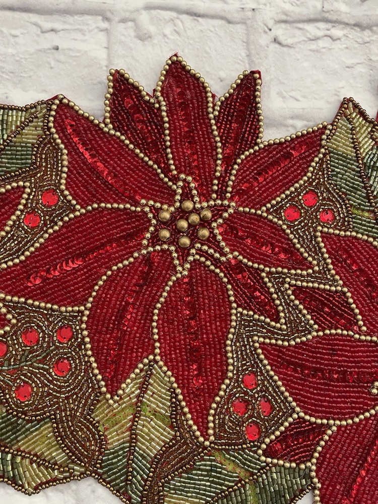 Vintage 90s Pier 1 Beaded Christmas Floral Table Runner Centerpiece 12.5”x36” One bead missing please see pictures Minor stains on the pack of the runner...