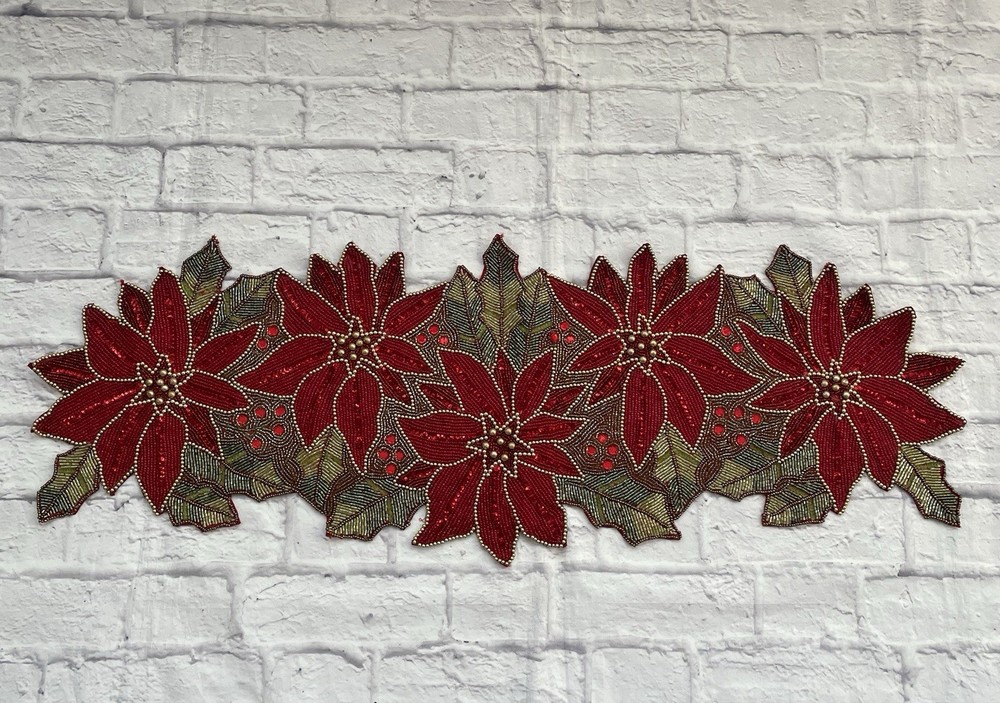 Vintage 90s Pier 1 Beaded Christmas Floral Table Runner Centerpiece 12.5”x36” One bead missing please see pictures Minor stains on the pack of the runner