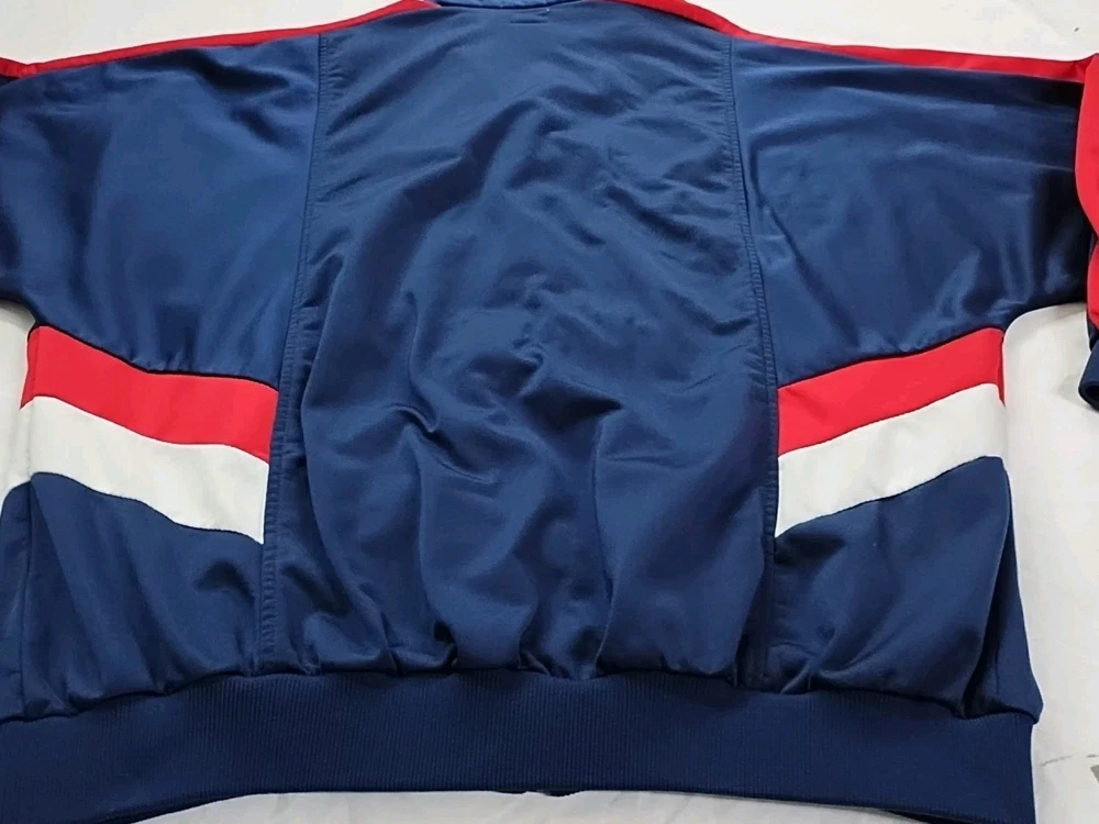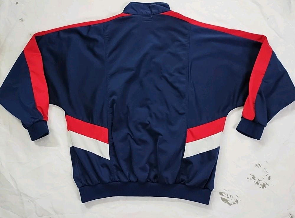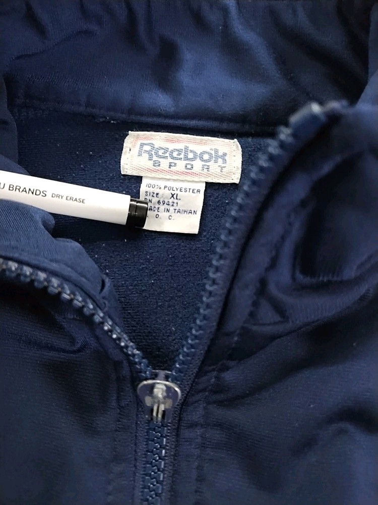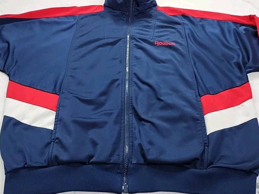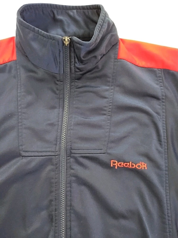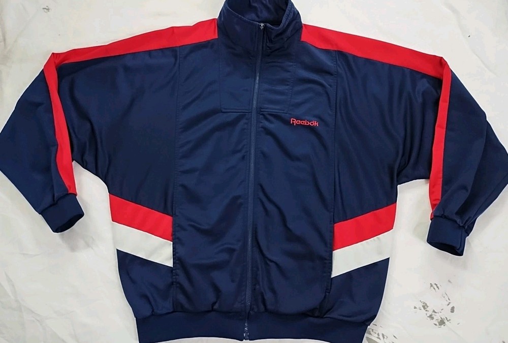 Vintage 90s Reebok Windbreaker Track Suit Jacket in Men's Size XL. This colorful track suit features a mock neck, zip closure, embroidered logo accents, and colorblock pattern. Made of softshell fabric with a lining, it is wind-resistant and suitable for all seasons. The set includes track pants and a jacket with tapered legs and long sleeves. Perfect for activewear, the track suit is designed for various sports activities and casual wear.