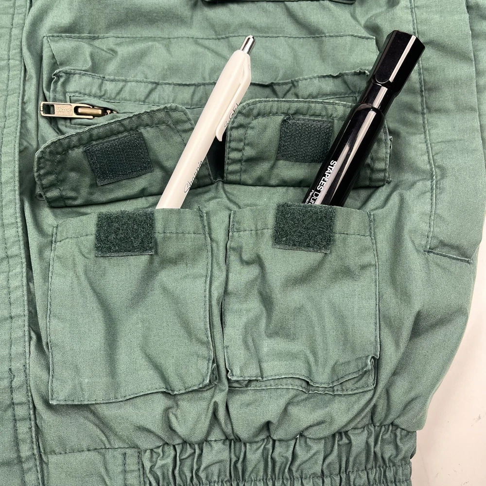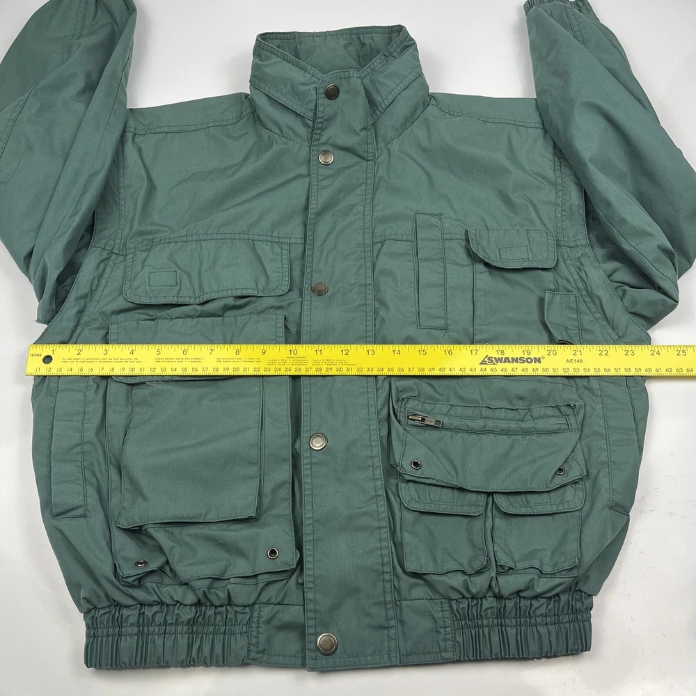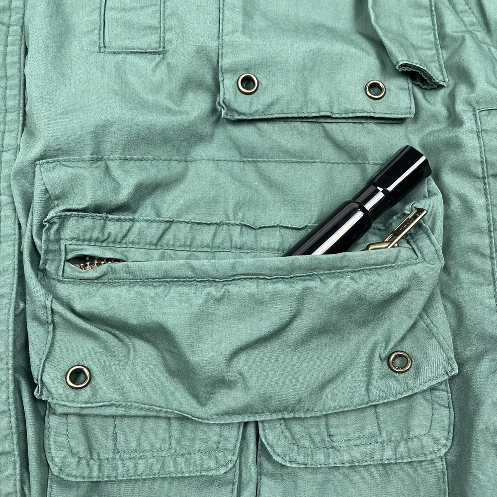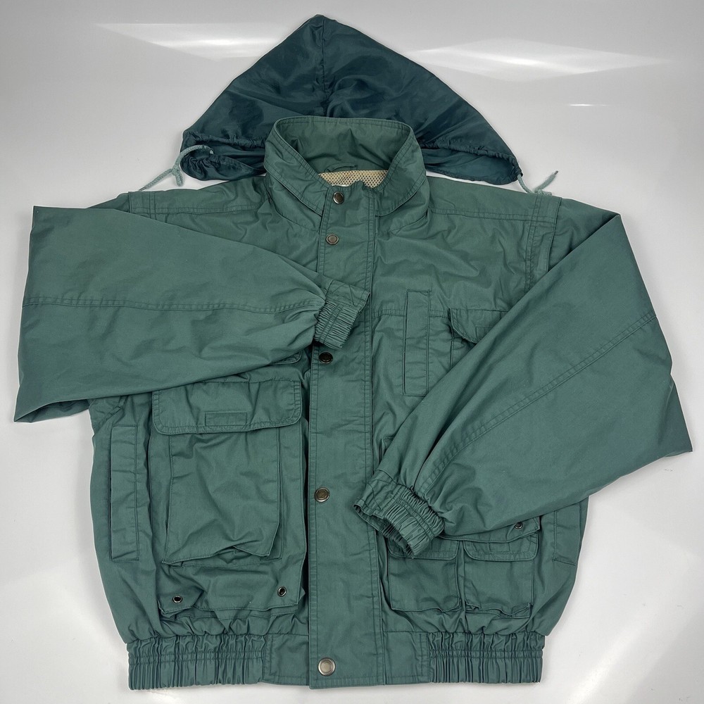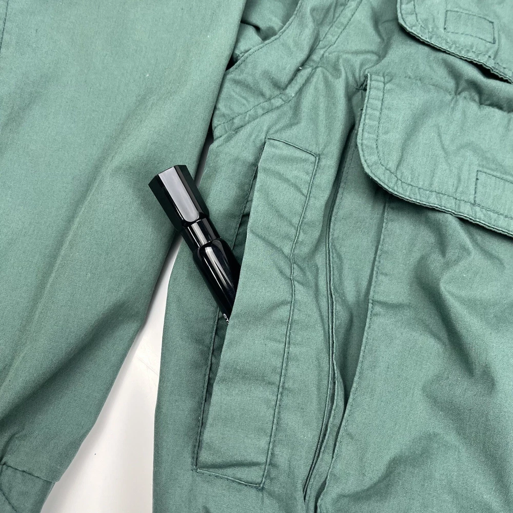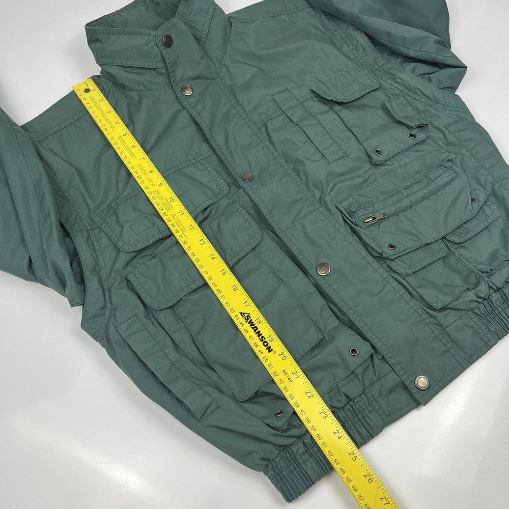 This limited edition Robert Edwards jacket is a must-have for any fashion-forward individual. The mid-length military style jacket features a collapsing hood and removable sleeves, making it perfect for any season. The wind-resistant jacket is made from polyester and is lined with nylon for added comfort. It comes in a beautiful green color and features 11 Different Style Sockets for storing small items while on the go. Some pockets are Zipped and some are hook & Loop closures. This jacket is perfect for a variety of occasions, including travel, hunting, hiking, and casual outings. The jacket is a size L, with a chest size of 48 inches, Length of 25 inches and a regular fit. The jacket is machine washable and has a solid pattern with a hipster, army, hippie, punk, dad, grunge, outdoor, classic, 90s, gothic, and retro theme. Invest in this stylish jacket and make a statement wherever you go.