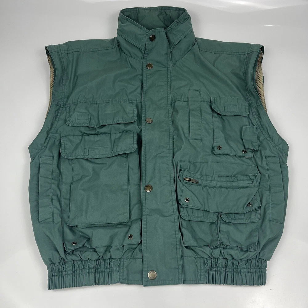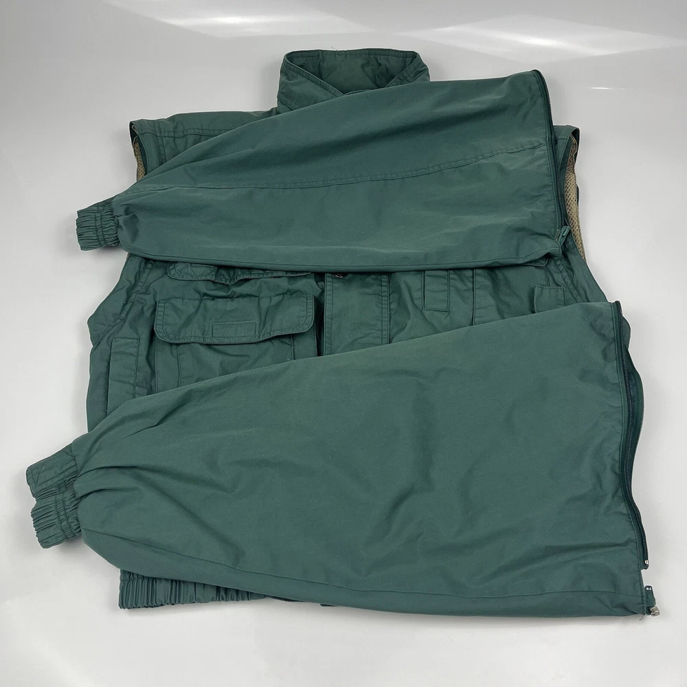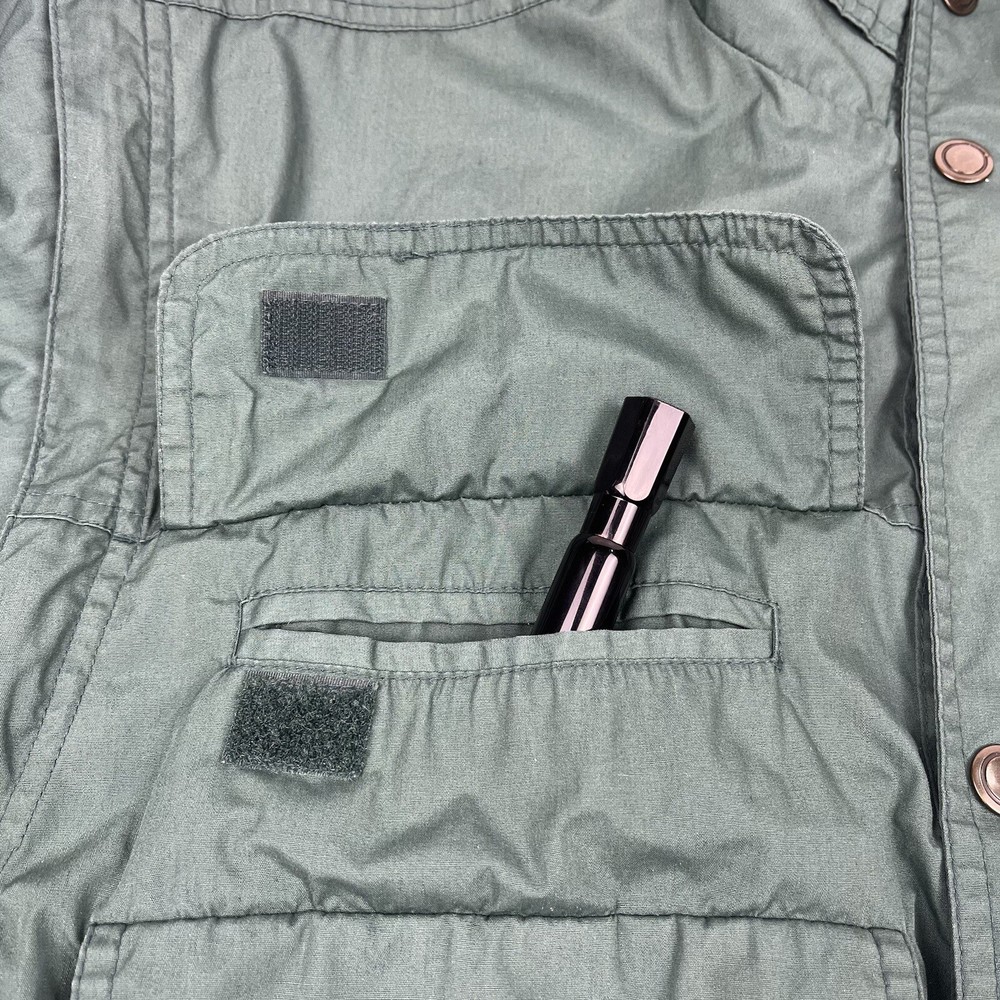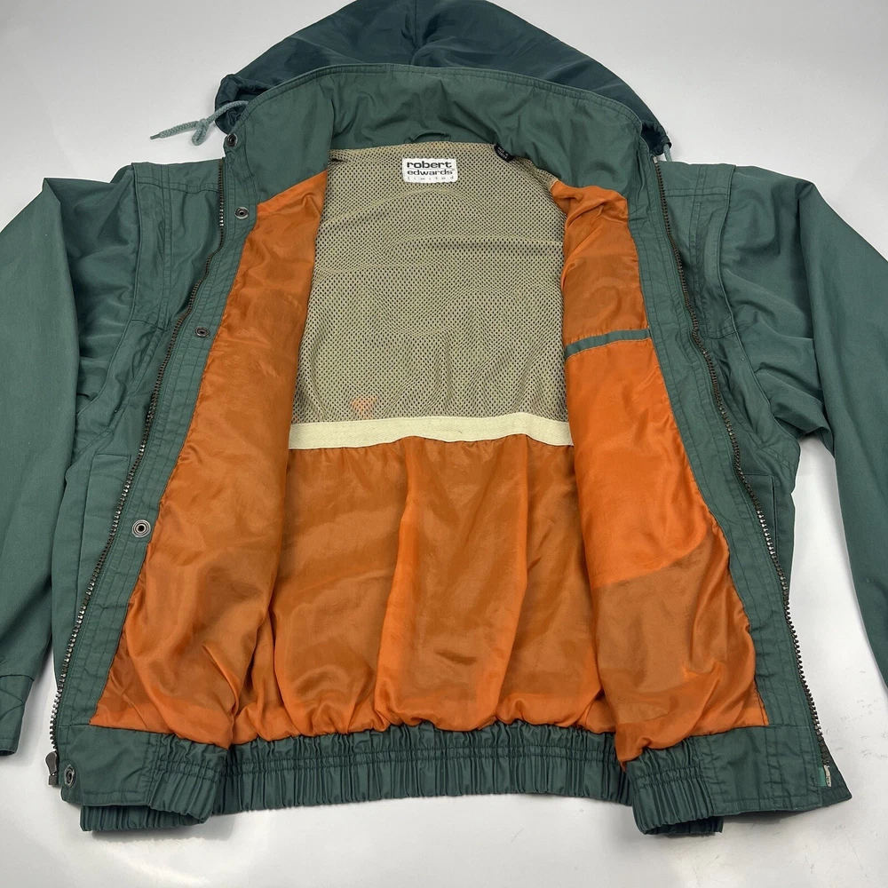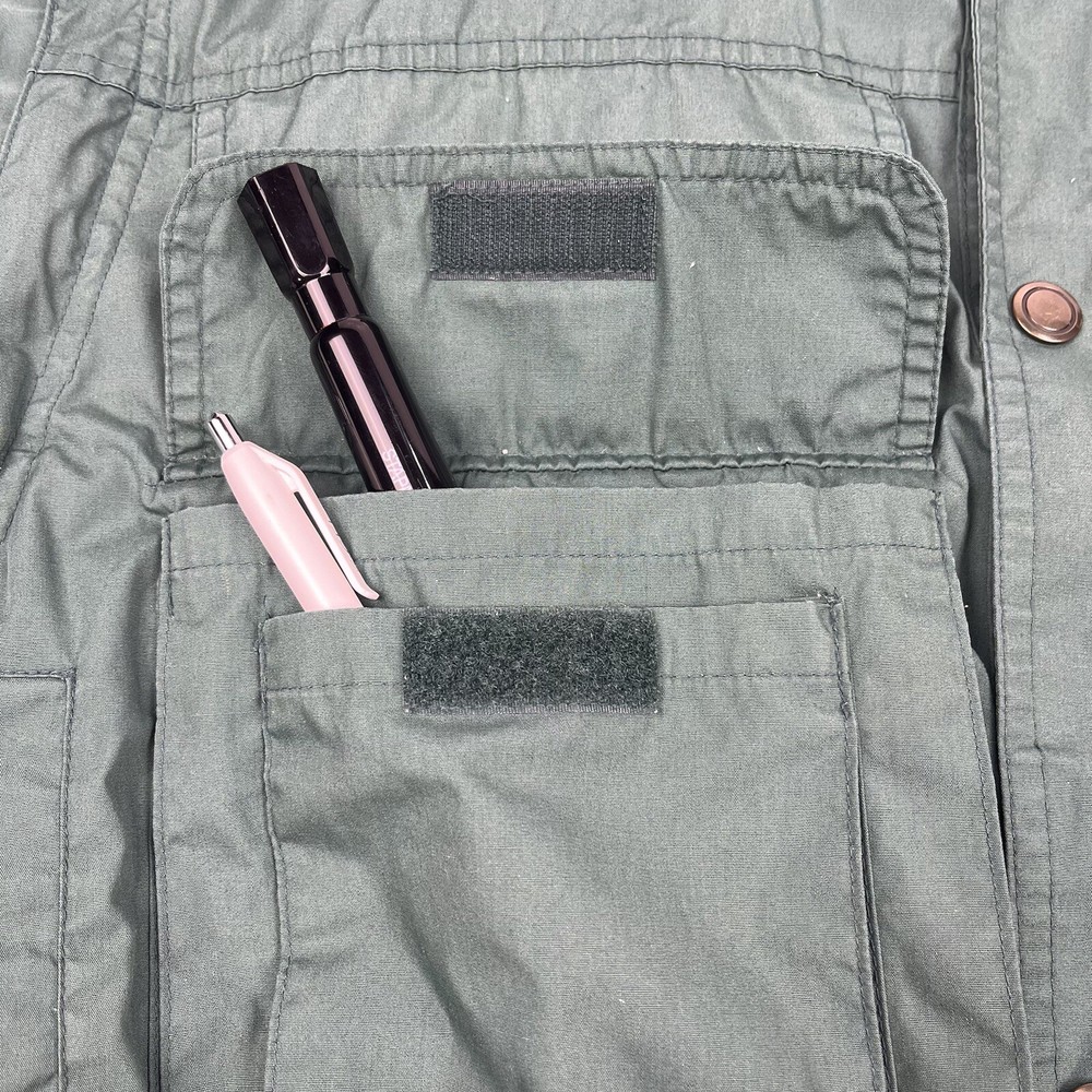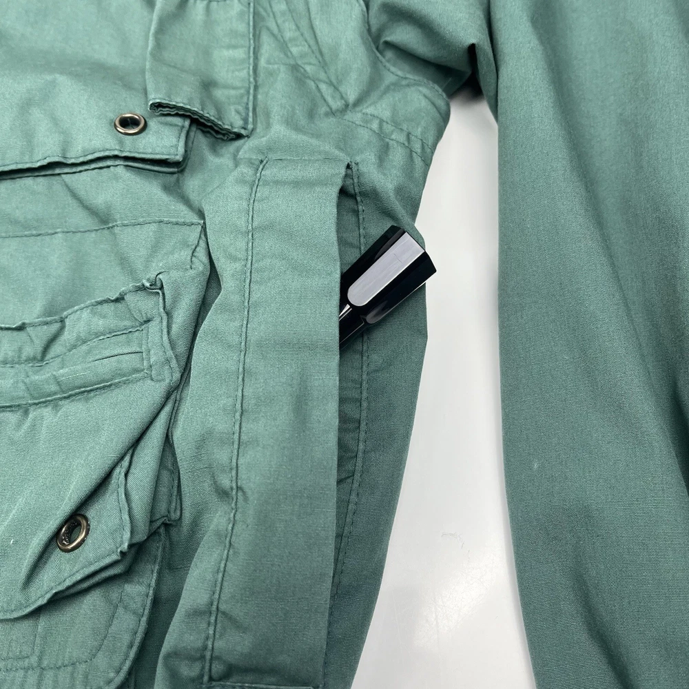 This limited edition Robert Edwards jacket is a must-have for any fashion-forward individual. The mid-length military style jacket features a collapsing hood and removable sleeves, making it perfect for any season. The wind-resistant jacket is made from polyester and is lined with nylon for added comfort. It comes in a beautiful green color and features 11 Different Style Sockets for storing small items while on the go. Some pockets are Zipped and some are hook & Loop closures. This jacket is perfect for a variety of occasions, including travel, hunting, hiking, and casual outings. The jacket is a size L, with a chest size of 48 inches, Length of 25 inches and a regular fit. The jacket is machine washable and has a solid pattern with a hipster, army, hippie, punk, dad, grunge, outdoor, classic, 90s, gothic, and retro theme. Invest in this stylish jacket and make a statement wherever you go.