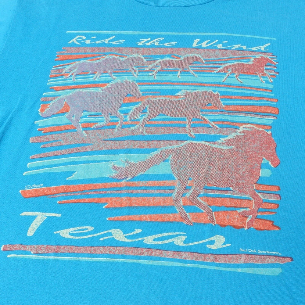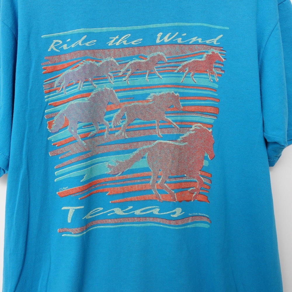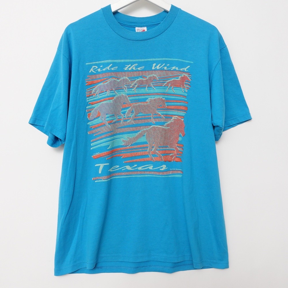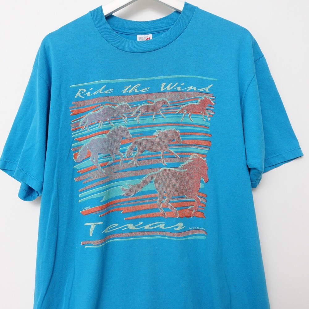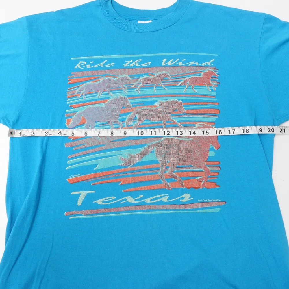 This vintage 90s JERZEES T-shirt features a unique "Texas Ride The Wind Horses" graphic print in teal on a solid blue cotton blend knit fabric. The shirt has a crew neckline, short sleeves, and a regular fit in size Medium. The design showcases a retro USA and Texas theme, making it a nostalgic piece for collectors or those who appreciate 90s fashion. Made in the United States, this T-shirt offers a classic look with a touch of Americana flair. Condition VERY GOOD except a small nick see last two photos for close up and pointer location photos Size LARGE tag BUT MORE OF A MEDIUM FIT see measurements for chest and length in photos for your best fit. Thank you.