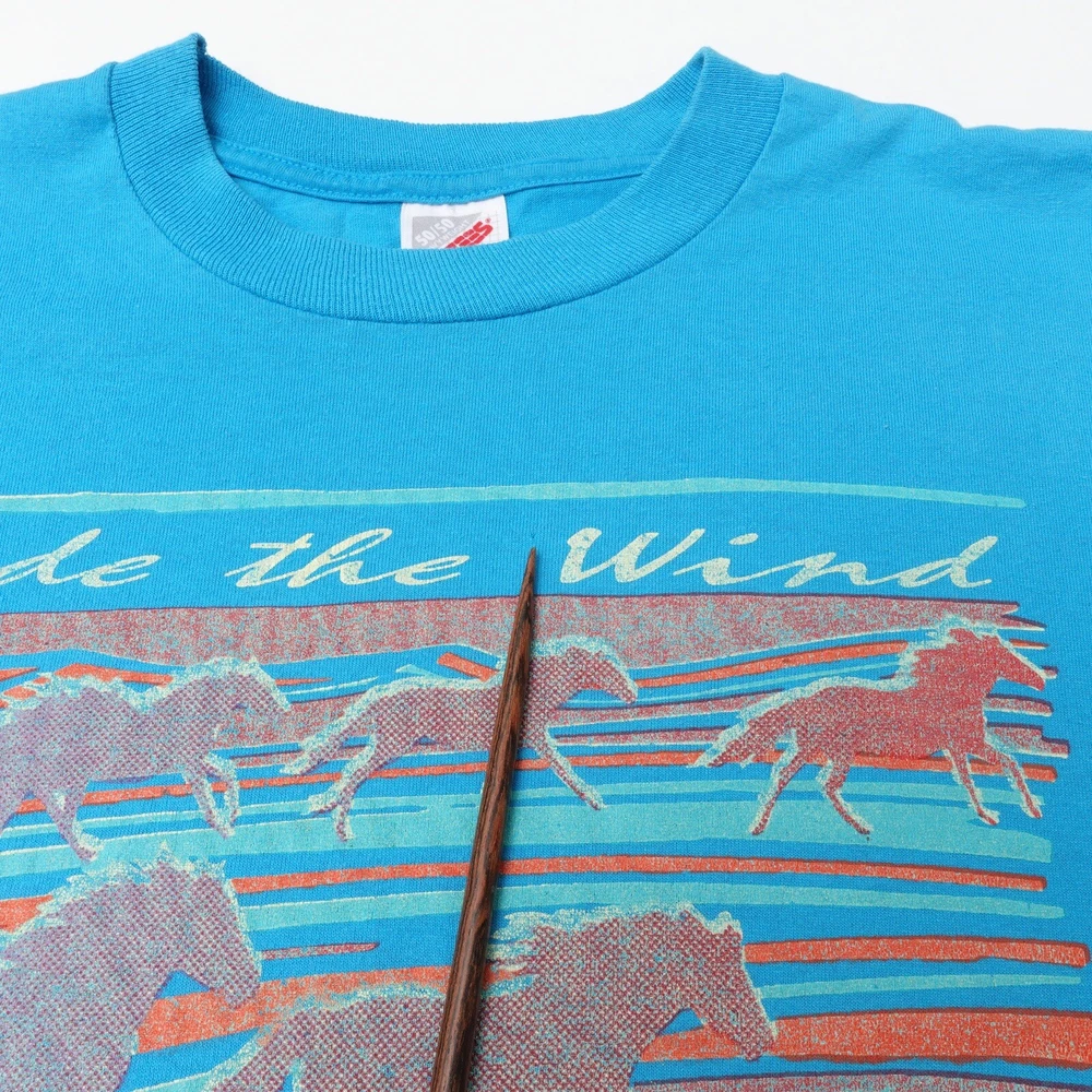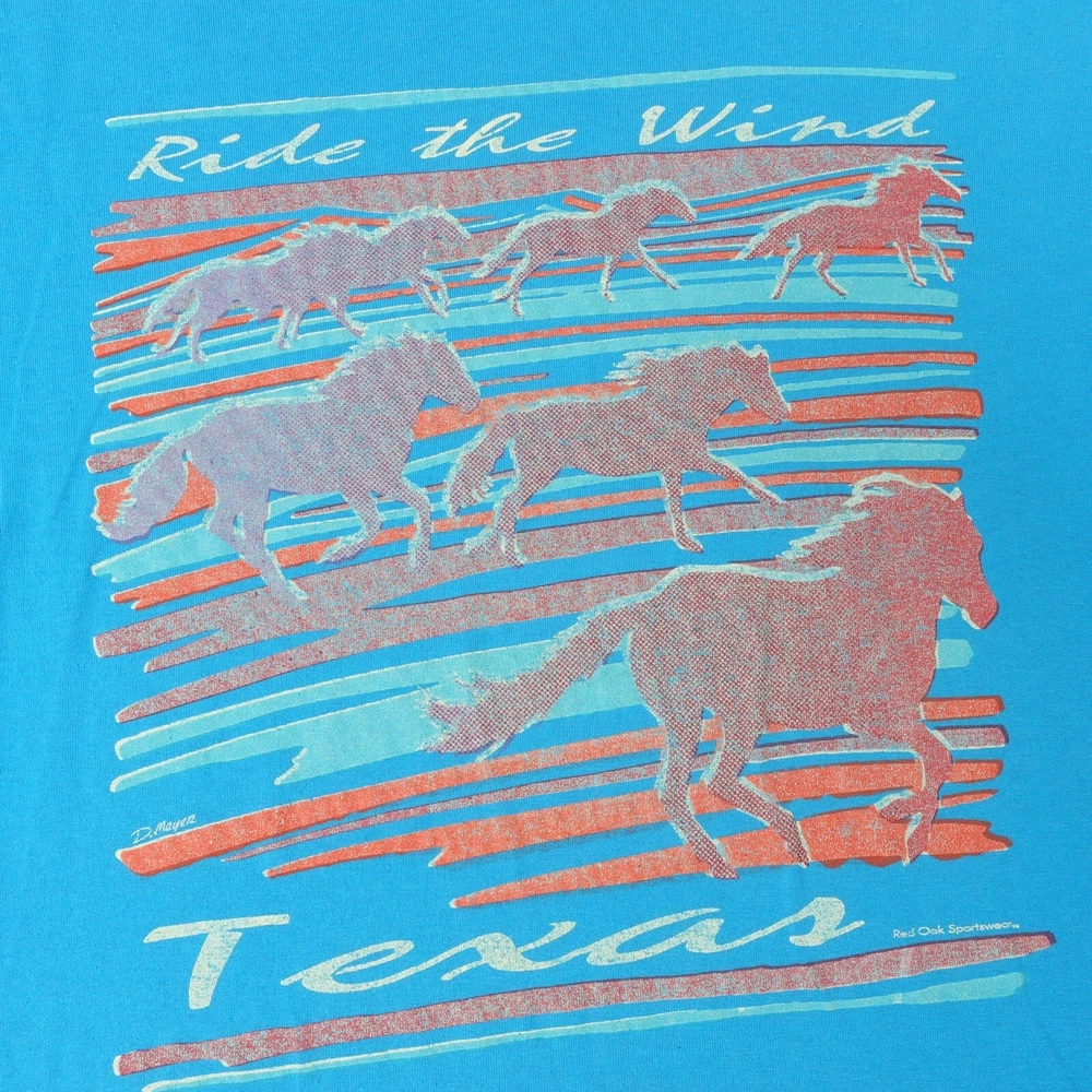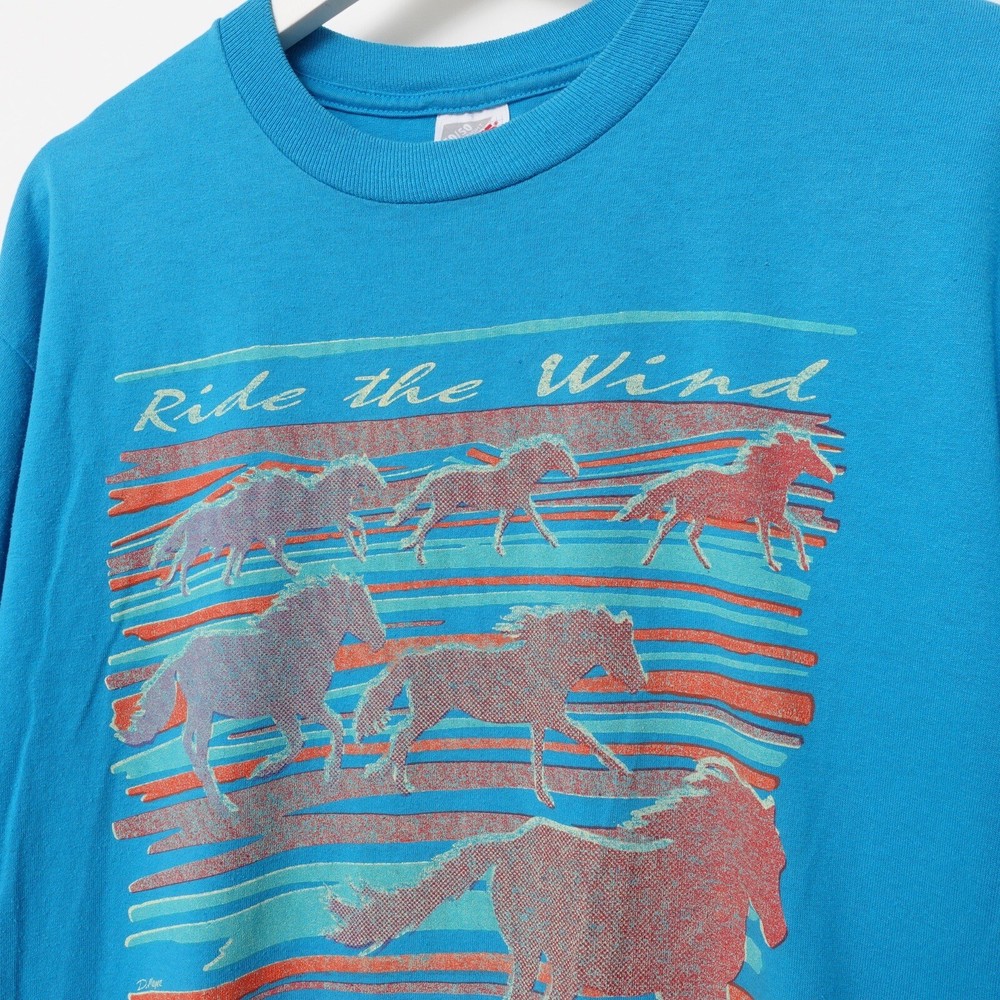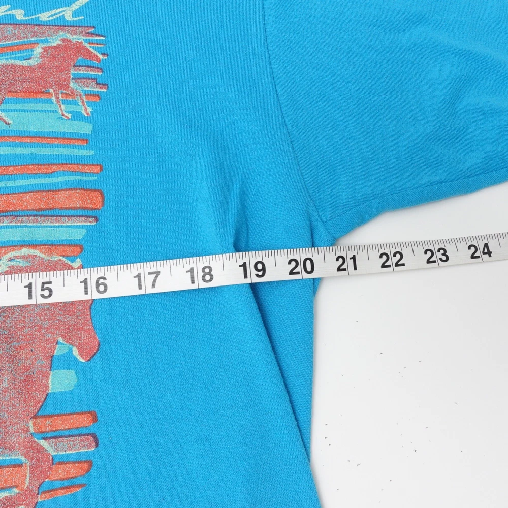 This vintage 90s JERZEES T-shirt features a unique "Texas Ride The Wind Horses" graphic print in teal on a solid blue cotton blend knit fabric. The shirt has a crew neckline, short sleeves, and a regular fit in size Medium. The design showcases a retro USA and Texas theme, making it a nostalgic piece for collectors or those who appreciate 90s fashion. Made in the United States, this T-shirt offers a classic look with a touch of Americana flair. Condition VERY GOOD except a small nick see last two photos for close up and pointer location photos Size LARGE tag BUT MORE OF A MEDIUM FIT see measurements for chest and length in photos for your best fit. Thank you.