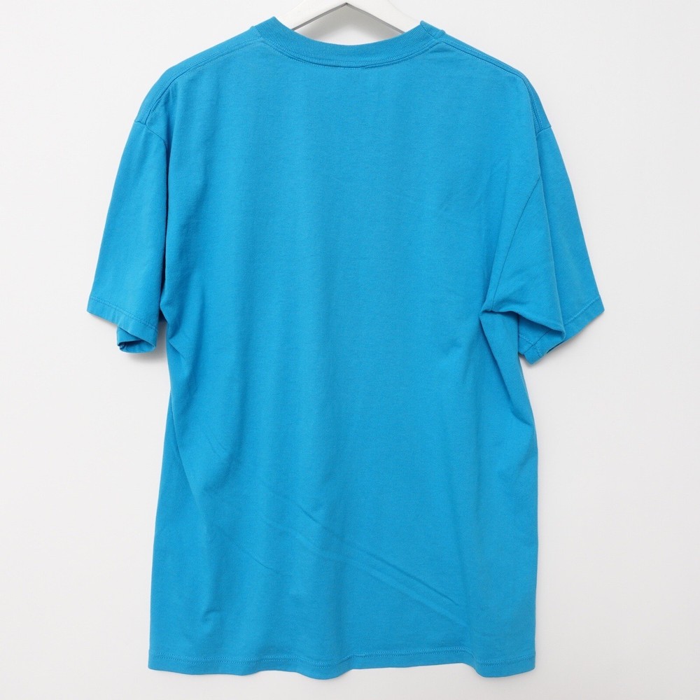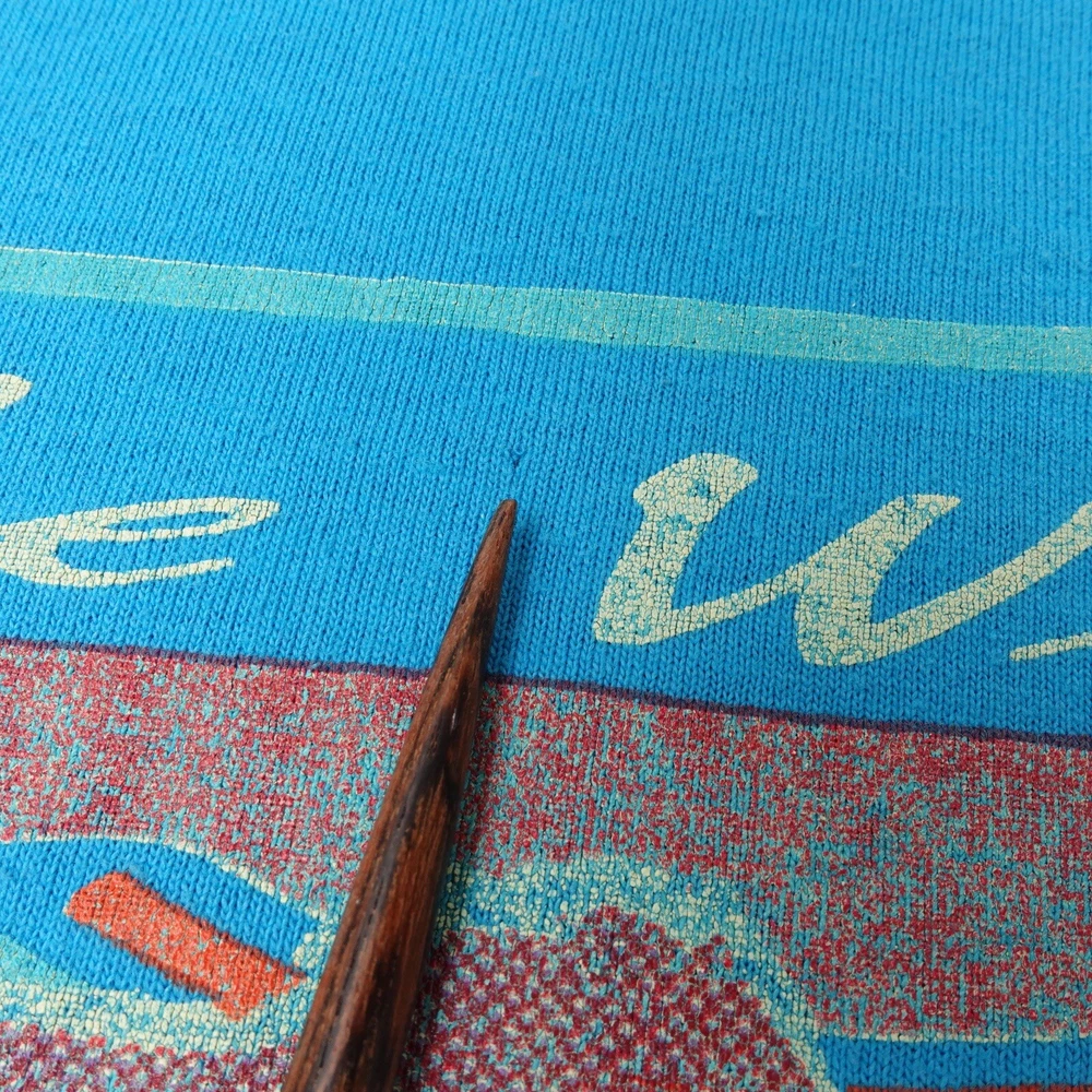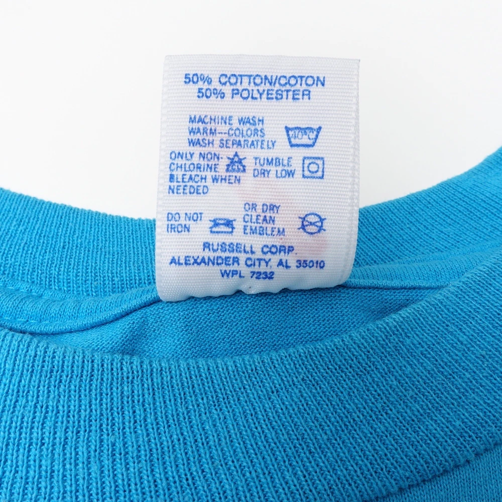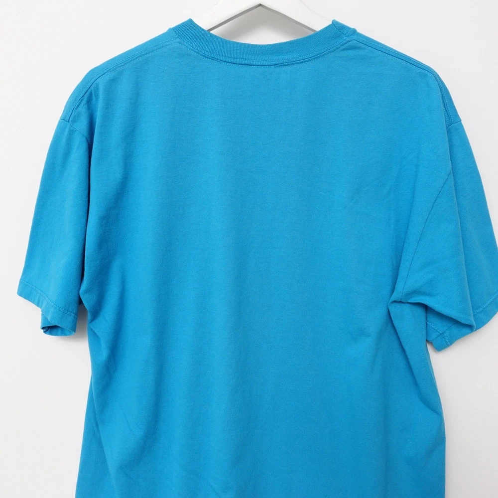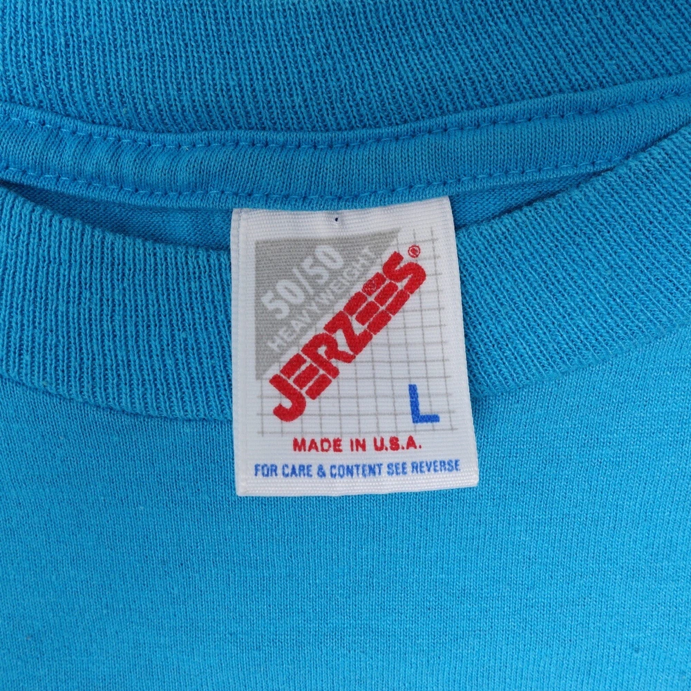 This vintage 90s JERZEES T-shirt features a unique "Texas Ride The Wind Horses" graphic print in teal on a solid blue cotton blend knit fabric. The shirt has a crew neckline, short sleeves, and a regular fit in size Medium. The design showcases a retro USA and Texas theme, making it a nostalgic piece for collectors or those who appreciate 90s fashion. Made in the United States, this T-shirt offers a classic look with a touch of Americana flair. Condition VERY GOOD except a small nick see last two photos for close up and pointer location photos Size LARGE tag BUT MORE OF A MEDIUM FIT see measurements for chest and length in photos for your best fit. Thank you.