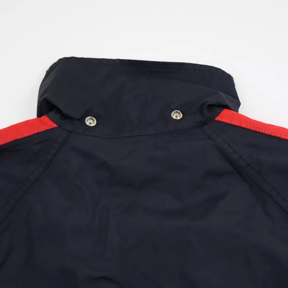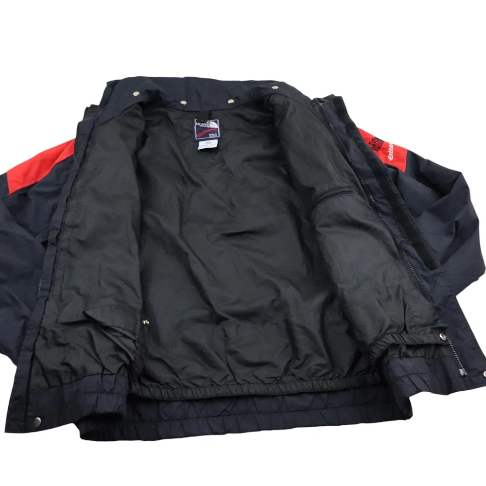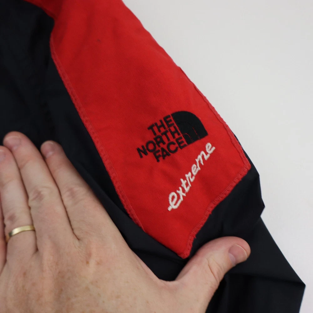 Iconic Retro North face extreme gore-tex windbreaker jacket made in the USA in mens size medium. This is a really cool streetwear style jacket made from gore-tex in a very stylish black and red colorway. The jacket looks like it could be new or barely worn, but please note the hood is missing. This would be a great jacket to layer underneath during the winter that makes the perfect spring rain shell. Comes professionally washed, ready to wear and ships within 24 hours. Perfect for hiking, mountaineering, skiing, skateboarding, snow sports, running, climbing, athletics, casual wear, to class, back to school, date night, or out with friends. Measurements: Tagged medium may run more like a small, please confirm fit below Pit to pit 22 inches Top to bottom 26 inches Shoulder to shoulder 20 inches Sleeve length 25 inches Model is 5' 7" 145 pounds and the jacket fits perfect on the model. Excellent mint condition with no rips, holes or stains. Please note the hood is missing. Please check out my store and continue shopping!