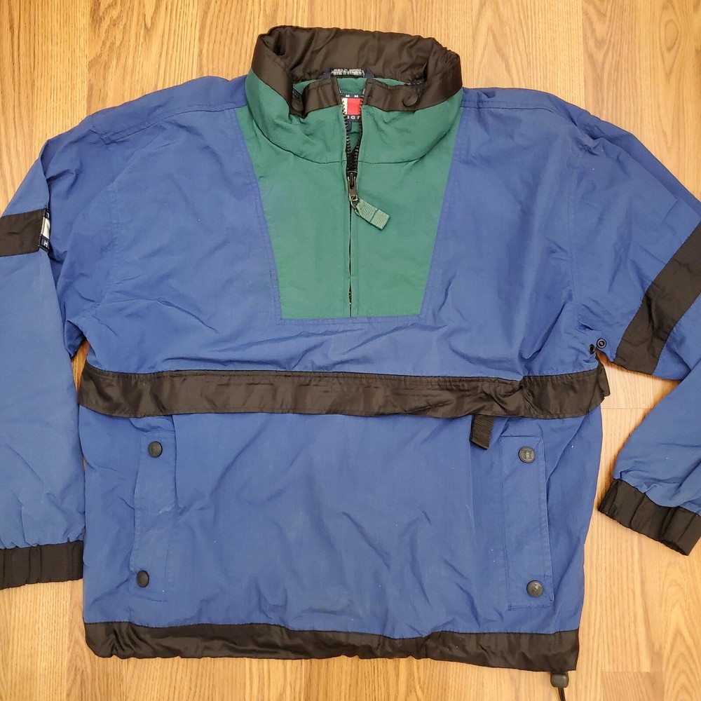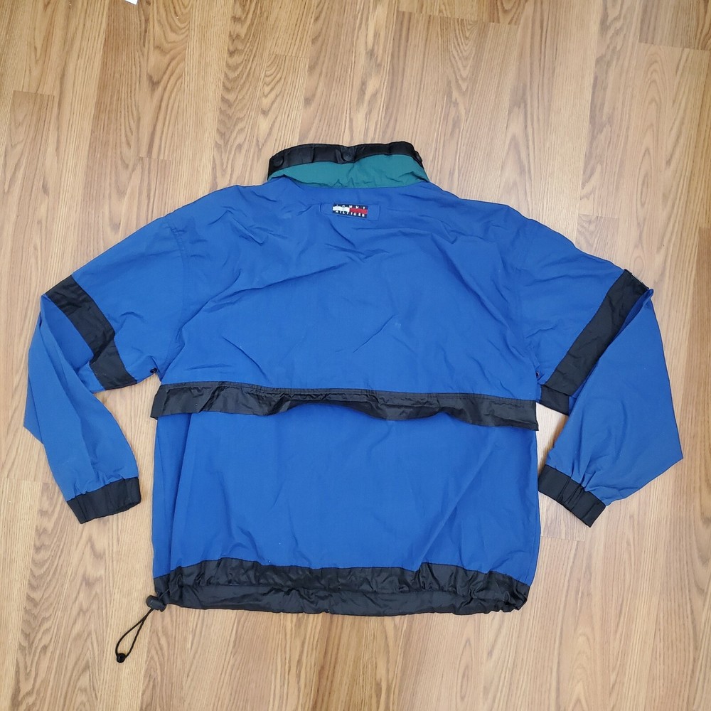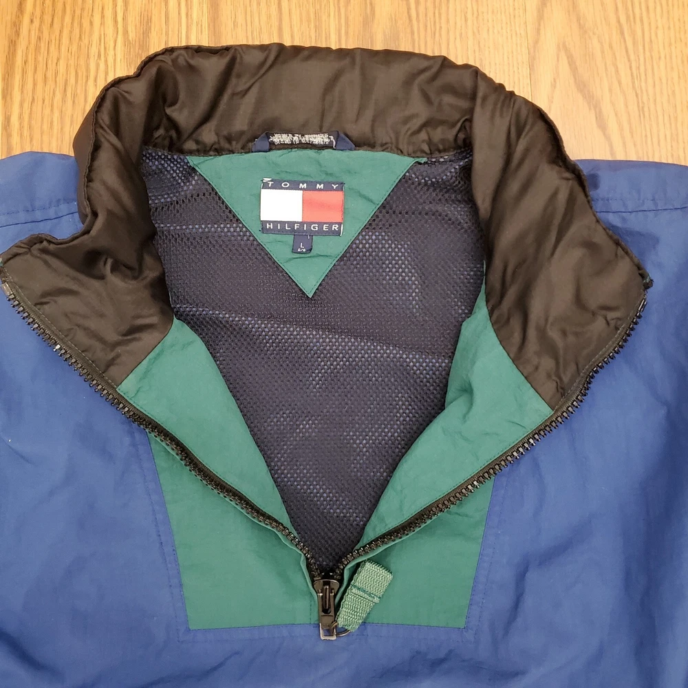 Vintage 90s Tommy Hilfiger Blue/ Green 1/4 zip Hooded Rain/ Wind Jacket Large. The hood buttons so you can put it away. It also had an adjustable drawstring at the bottom of jacket. Condition is "Pre-owned". Shipped with USPS Priority Mail.