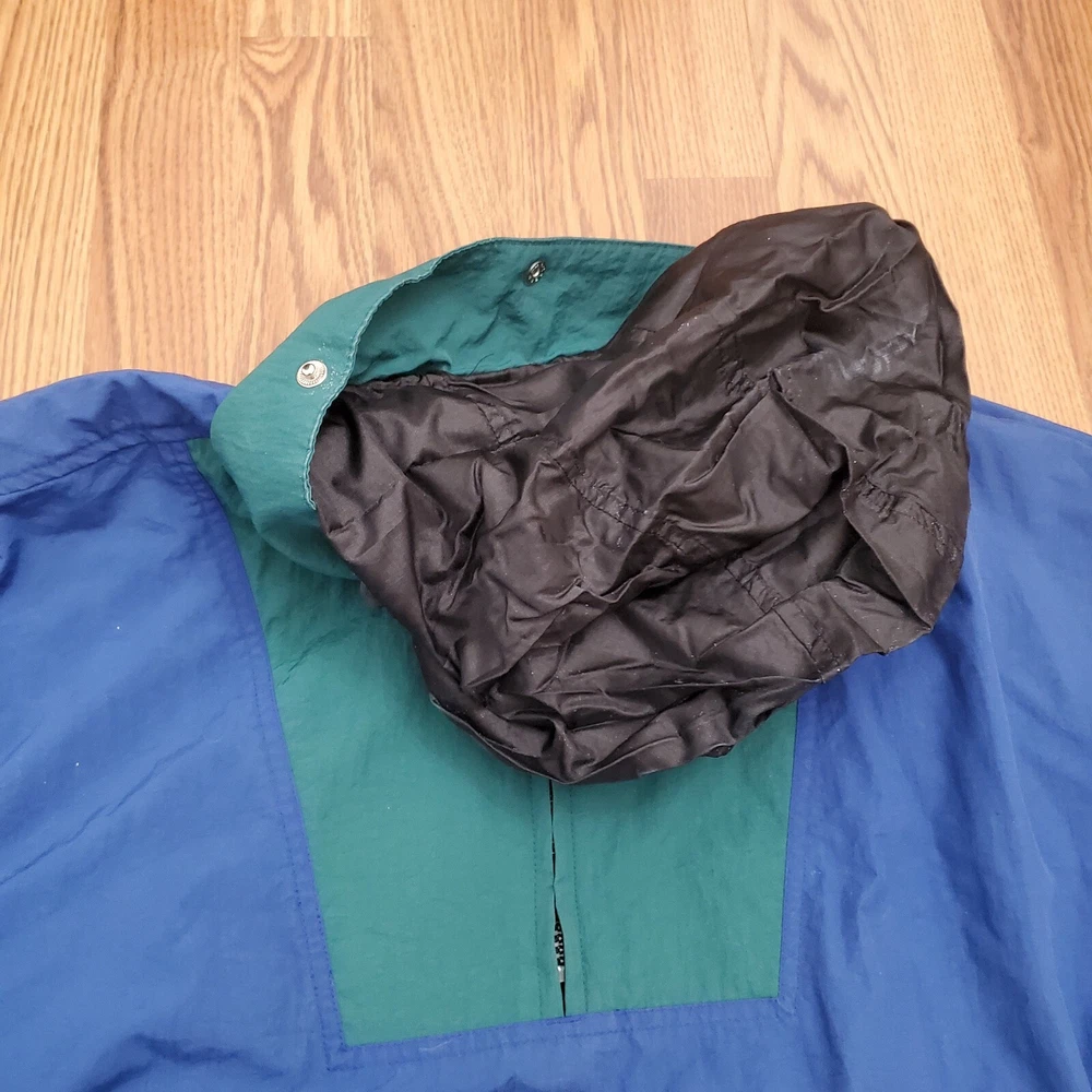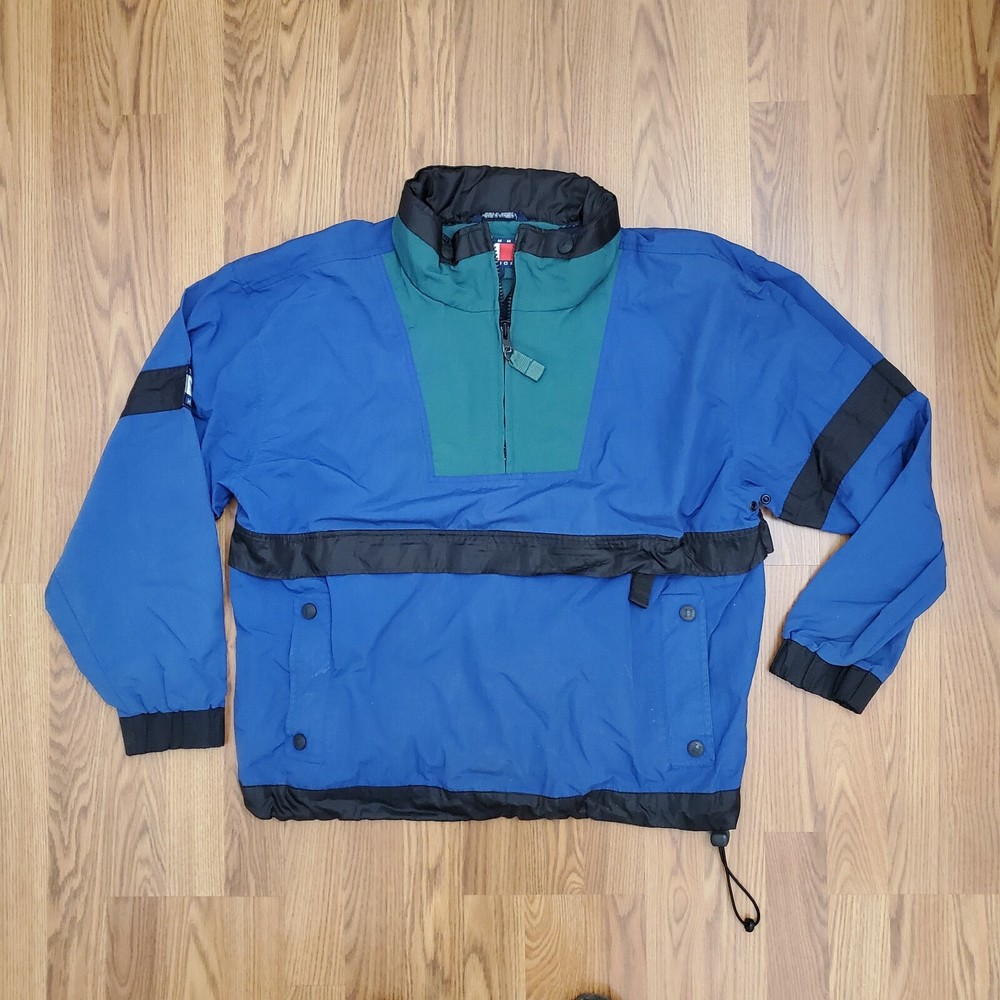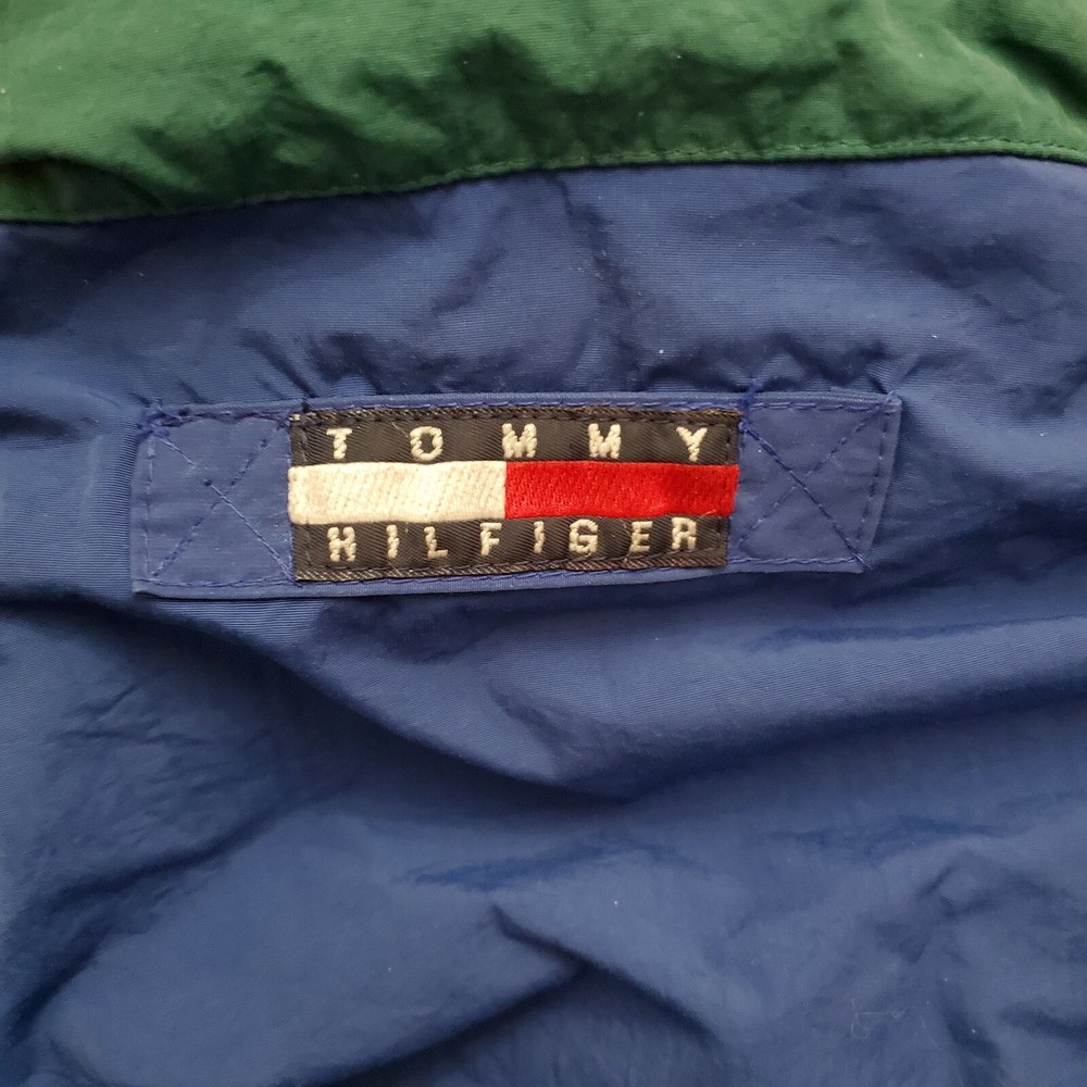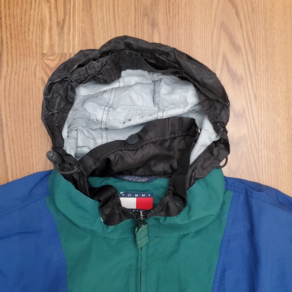 Vintage 90s Tommy Hilfiger Blue/ Green 1/4 zip Hooded Rain/ Wind Jacket Large. The hood buttons so you can put it away. It also had an adjustable drawstring at the bottom of jacket. Condition is "Pre-owned". Shipped with USPS Priority Mail.