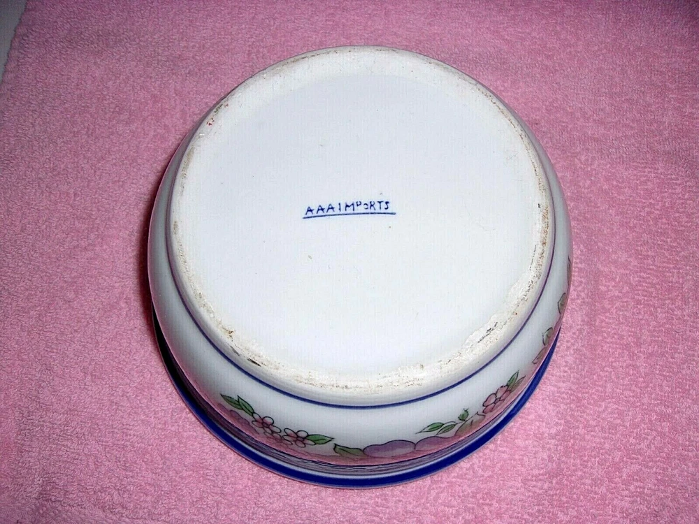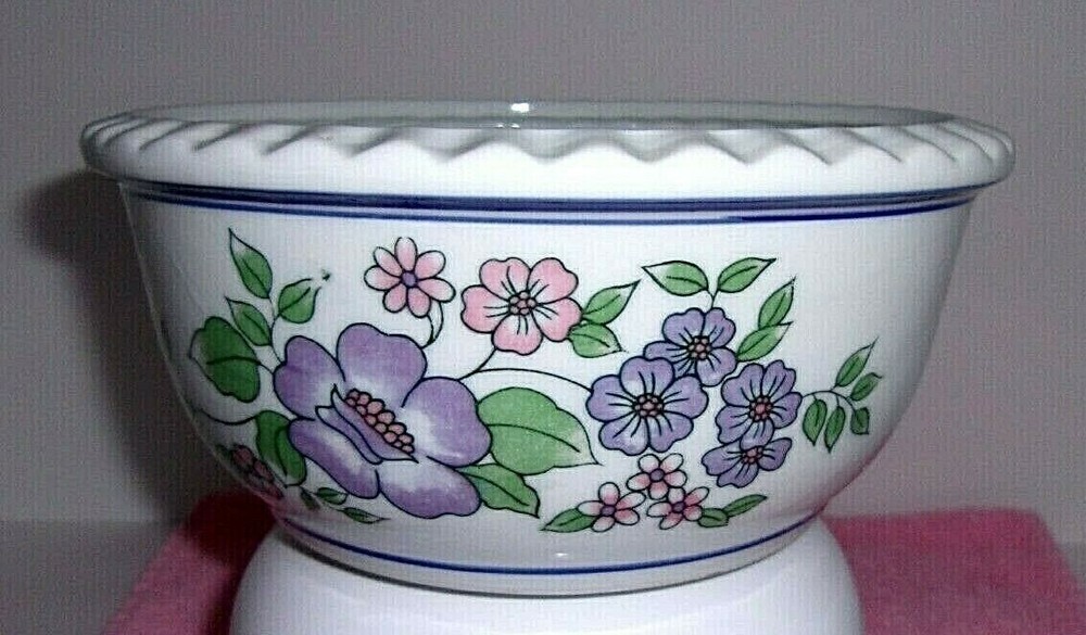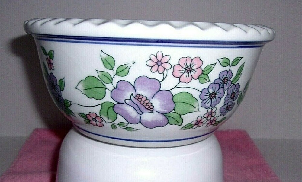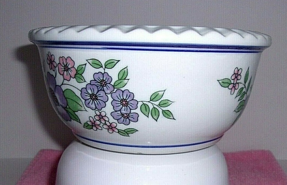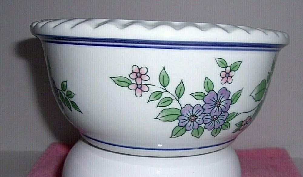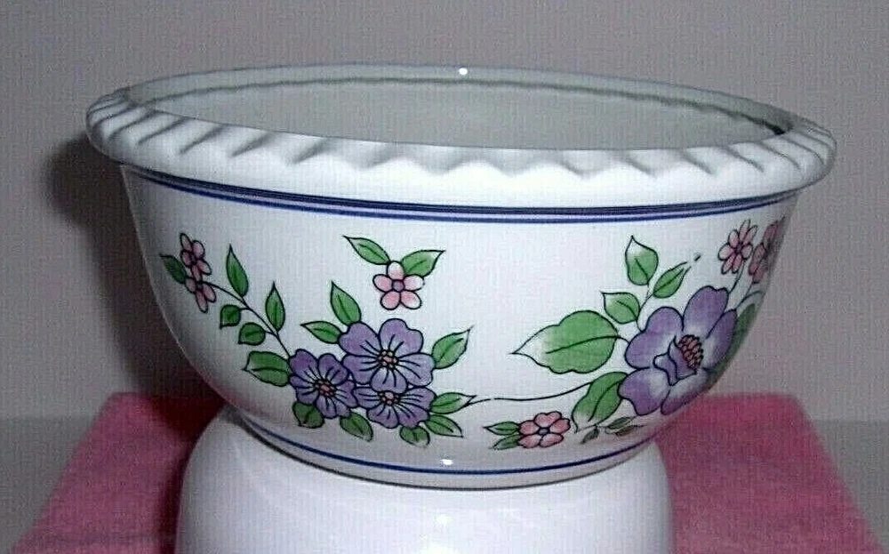 THIS IS A BEAUTIFUL CERAMIC PLANTER BOWL / DISH GARDEN WITH A FLUTED EDGE. THE HAND PAINTED DESIGN FEATURES PURPLE AND PINK FLOWERS WITH GREEN LEAVES WINDING AROUND THE BOWL AND FRAMED BY BLUE STRIPES. THIS PRETTY CERAMIC PIECE IS PERFECT AS A PLANTER BOWL, DISH GARDEN / BULB STARTER OR A TABLE CENTERPIECE. THIS IS A VINTAGE PIECE, POSSIBLY FROM THE 1970s. CONDITION IS EXCELLENT - NO CHIPS, CRACKS OR CRAZING. SIZE IS APPROX. 8 1/4" W x 4" H BUYER PAYS SHIPPING. PAYMENT ONLY THROUGH EBAY.