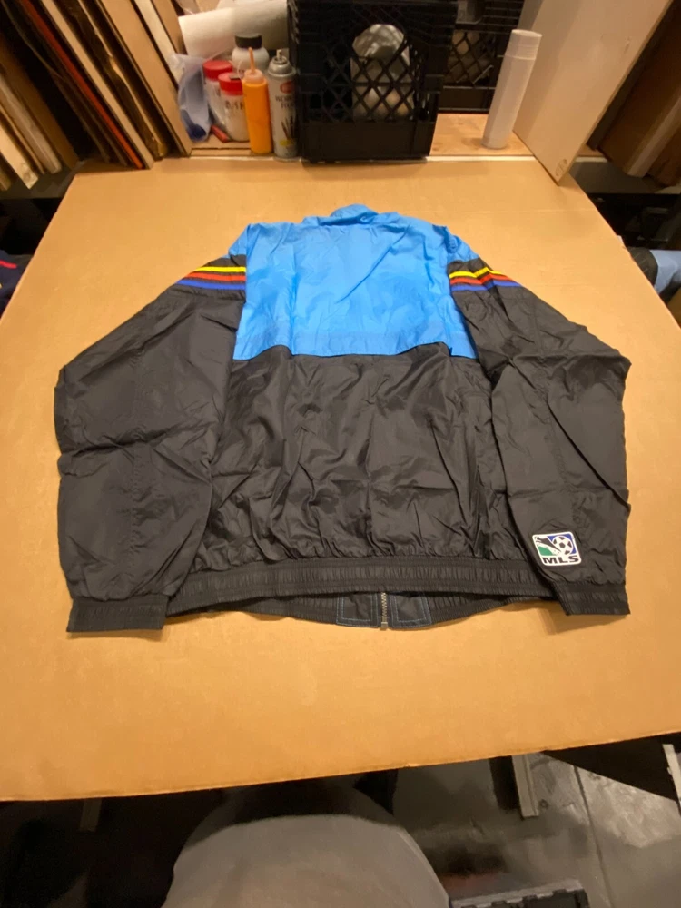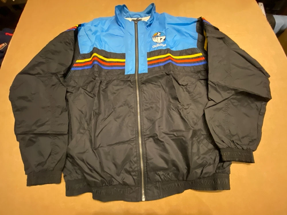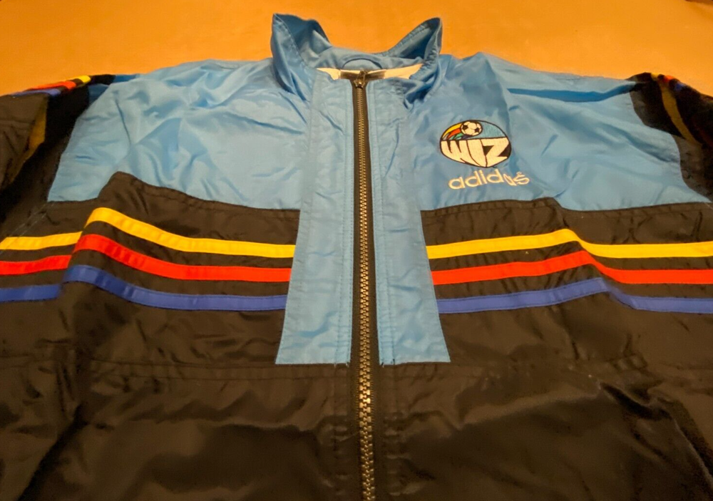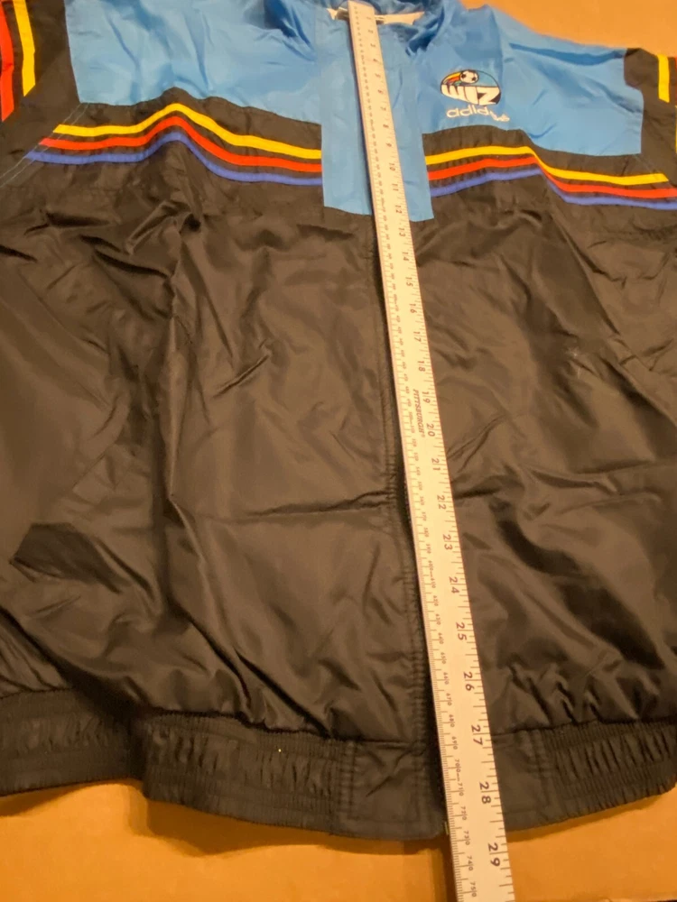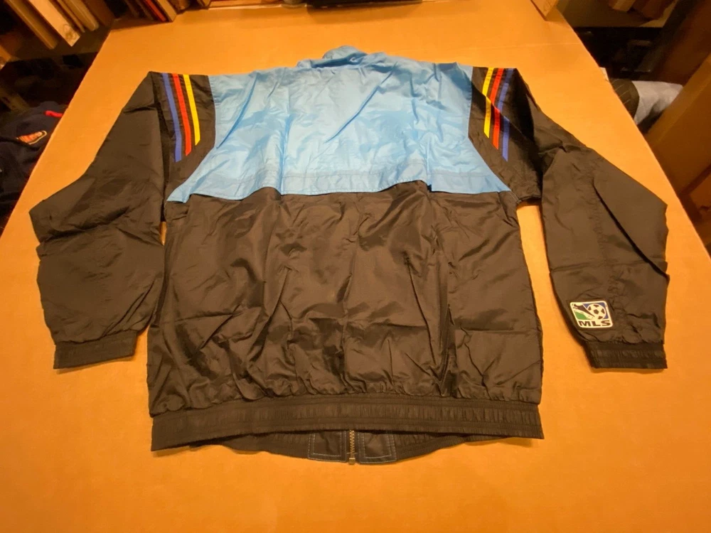 This vintage ADIDAS Kansas City Wiz raincoat is a must-have for any soccer fan. Designed for the 1996 MLS Cup, this coat features the iconic team colors of black and red, and is made from high-quality materials to ensure durability and comfort. The coat is officially licensed by adidas and is perfect for men who love soccer and want to show their support for the Kansas City Wiz. With a capacity of 24, this bench coat/windbreaker/raincoat is perfect for fans of all ages. It is a great addition to any soccer fan's collection and is a perfect way to show off your team spirit. So, whether you're going to the game or just want to show off your love for the Kansas City Wiz, this vintage ADIDAS raincoat is the perfect choice.