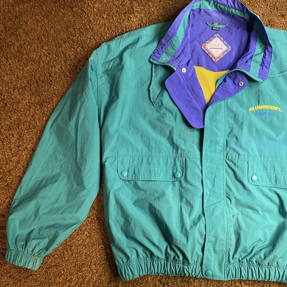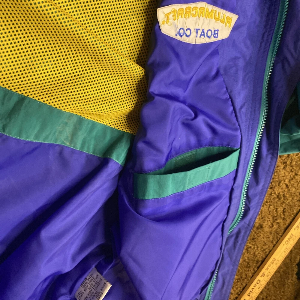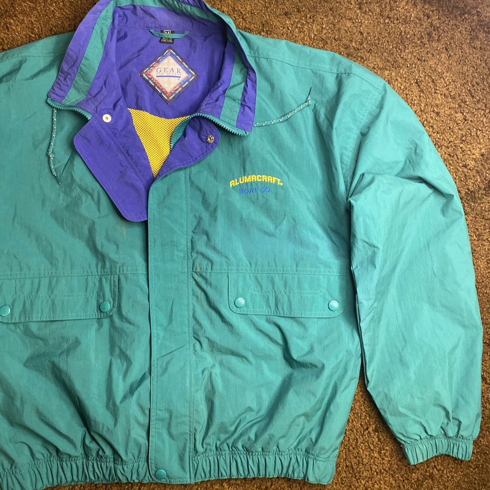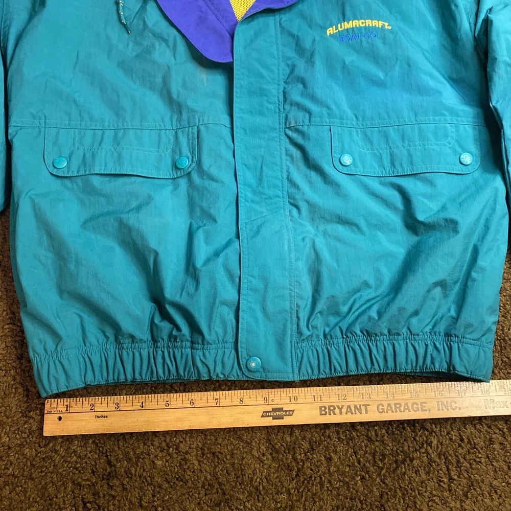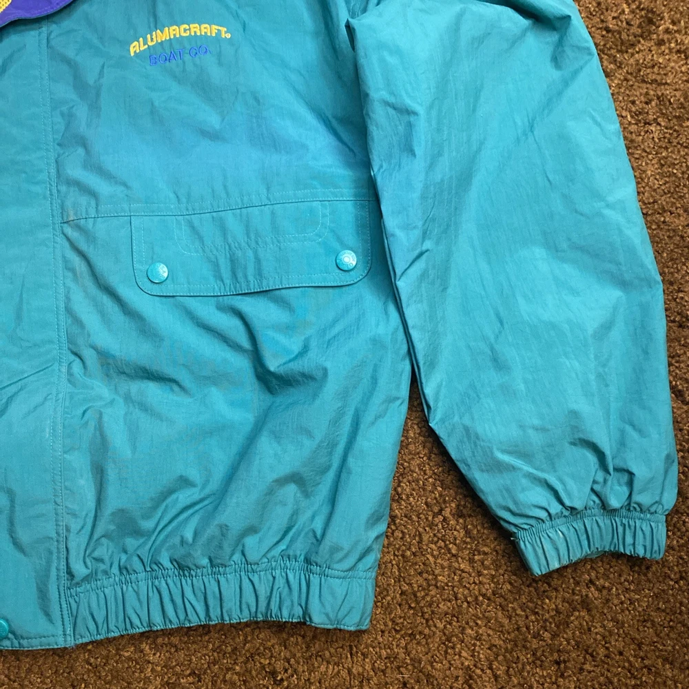 This vintage ALUMACRAFT Boat Co jacket is a must-have for any nautical or aluminum boating or fishing enthusiast. Made of a durable nylon canvas fabric, this midweight raincoat is perfect for all seasons and is water and wind-resistant. The jacket features a full zip closure with button and snap accents, an elastic waist for a comfortable fit, and a tie string for added protection. The colorblock pattern in blue, green, and yellow adds a touch of classic 80s and 90s style, while the embroidered graphics and quilted accents provide a unique touch. The jacket is machine washable and is hip-length, making it suitable for casual wear or outdoor activities such as boating, sailing, or fishing. This jacket is a great addition to any wardrobe and is sure to make a statement.