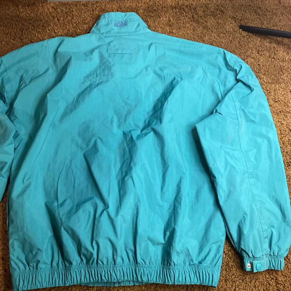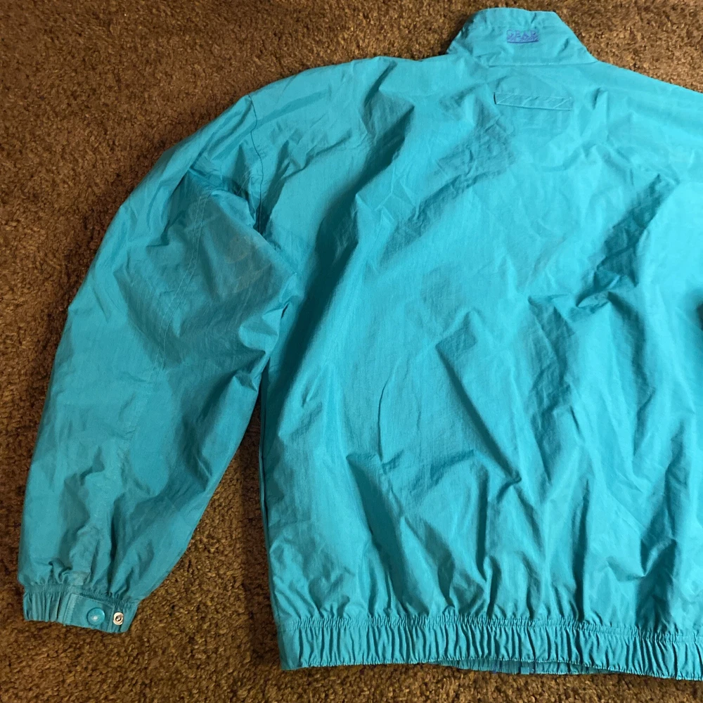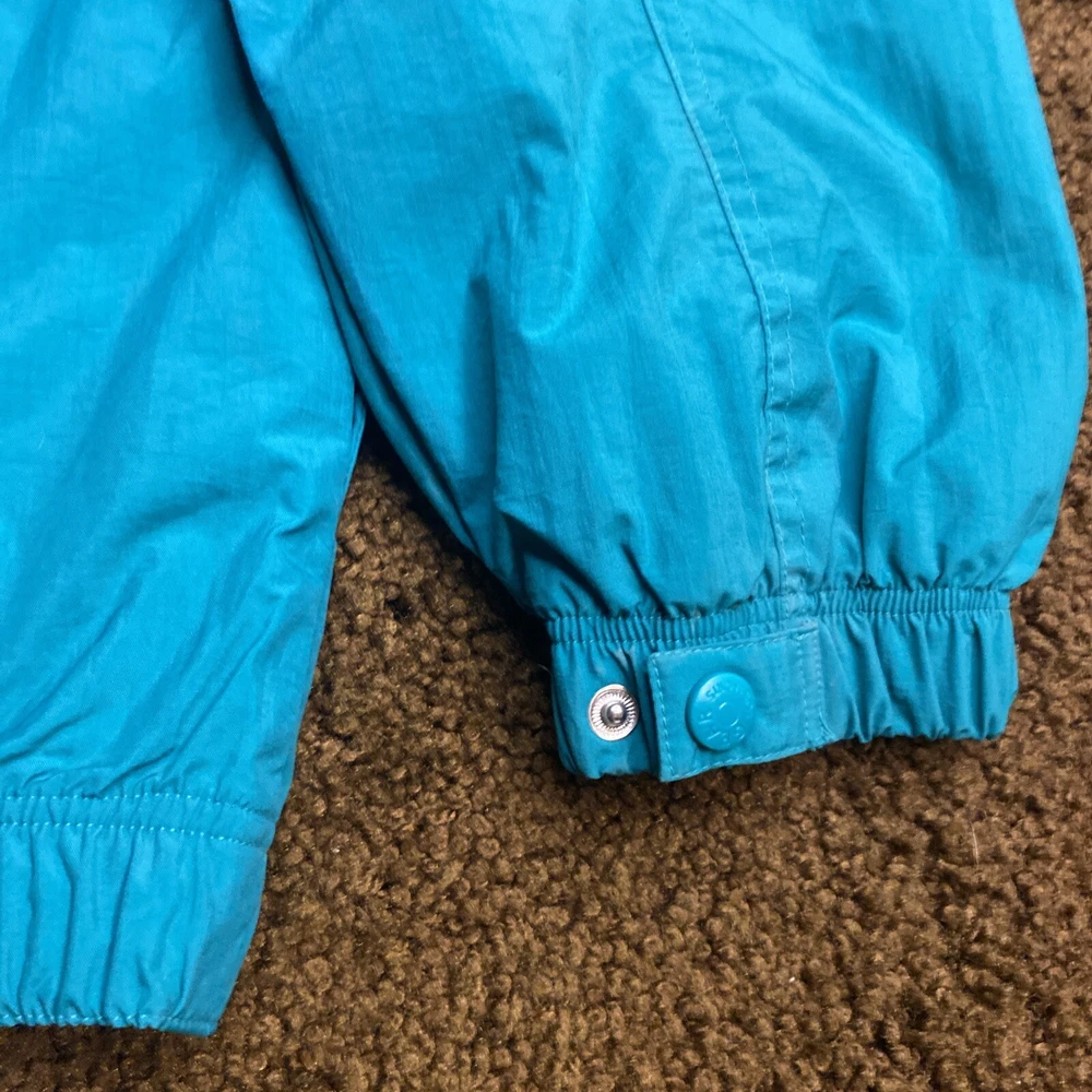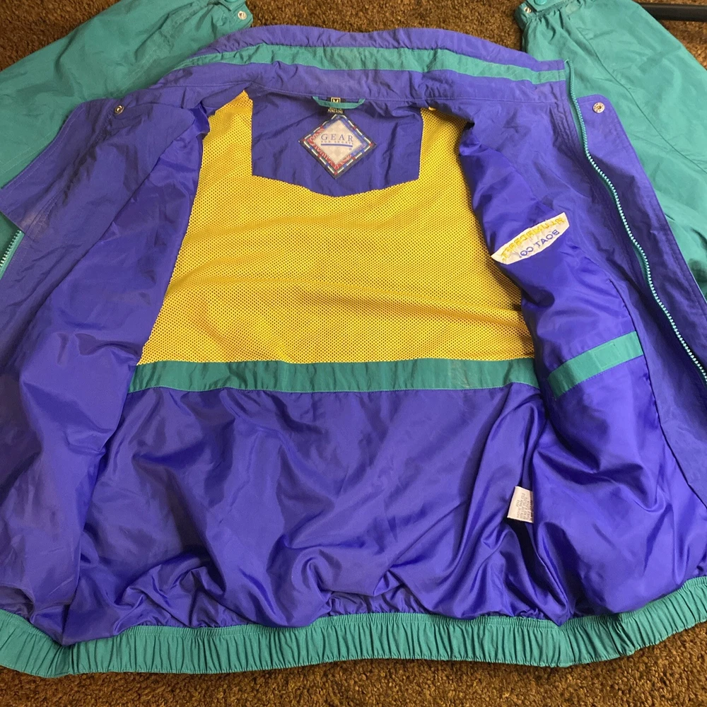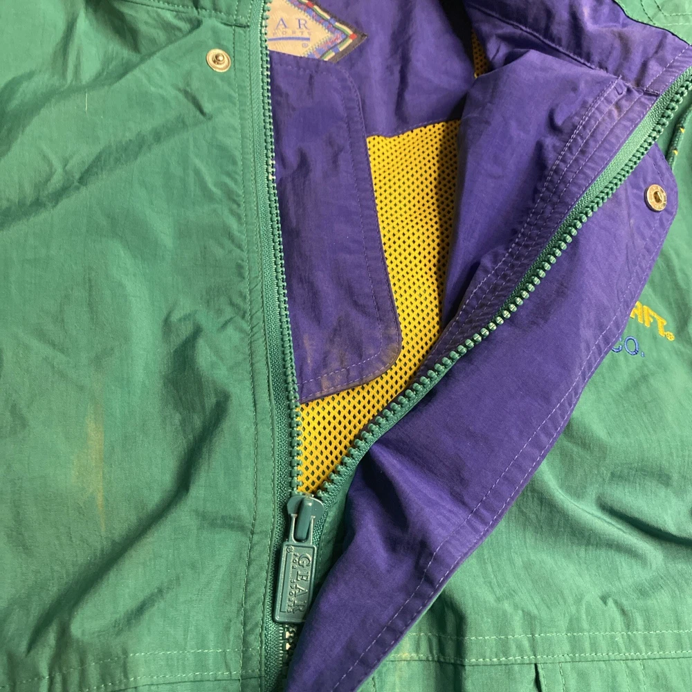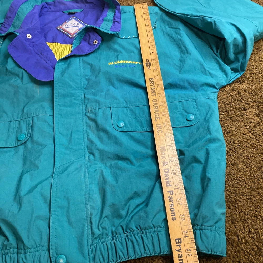 This vintage ALUMACRAFT Boat Co jacket is a must-have for any nautical or aluminum boating or fishing enthusiast. Made of a durable nylon canvas fabric, this midweight raincoat is perfect for all seasons and is water and wind-resistant. The jacket features a full zip closure with button and snap accents, an elastic waist for a comfortable fit, and a tie string for added protection. The colorblock pattern in blue, green, and yellow adds a touch of classic 80s and 90s style, while the embroidered graphics and quilted accents provide a unique touch. The jacket is machine washable and is hip-length, making it suitable for casual wear or outdoor activities such as boating, sailing, or fishing. This jacket is a great addition to any wardrobe and is sure to make a statement.