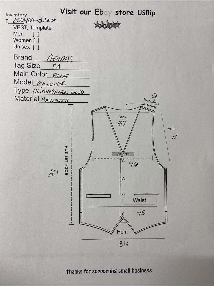 Vintage Adidas Mens Clima/Shell Wind Stopper Pullover Lined Elastic Waist Size M I ship items out EVERY DAY so EXPECT a QUICK delivery! Please feel free to ask any questions you may have I answer most questions instantly! Please compare our measurements on template to your favorite garments to ensure fit. Item is well cared for, gently used. Measured flat in inches see template in pictures for full measurements.