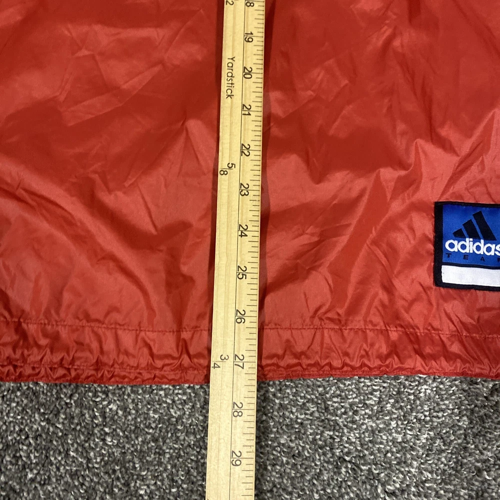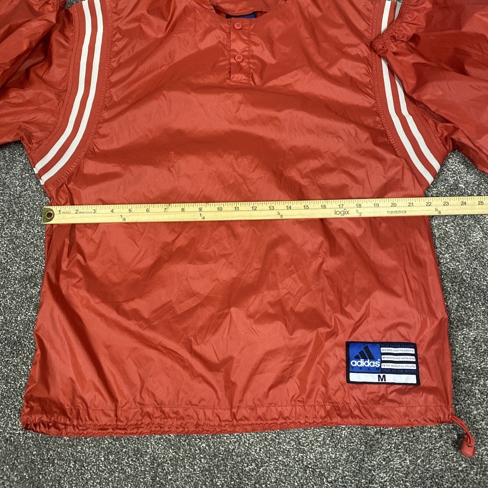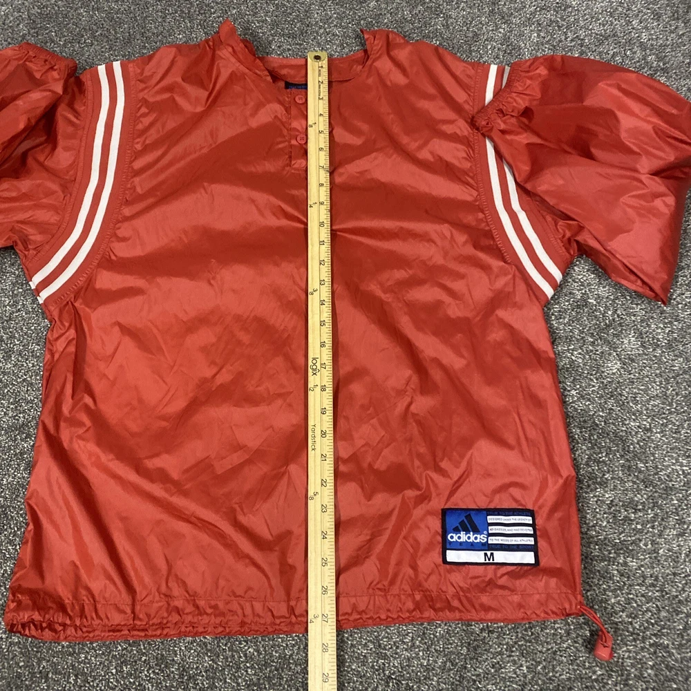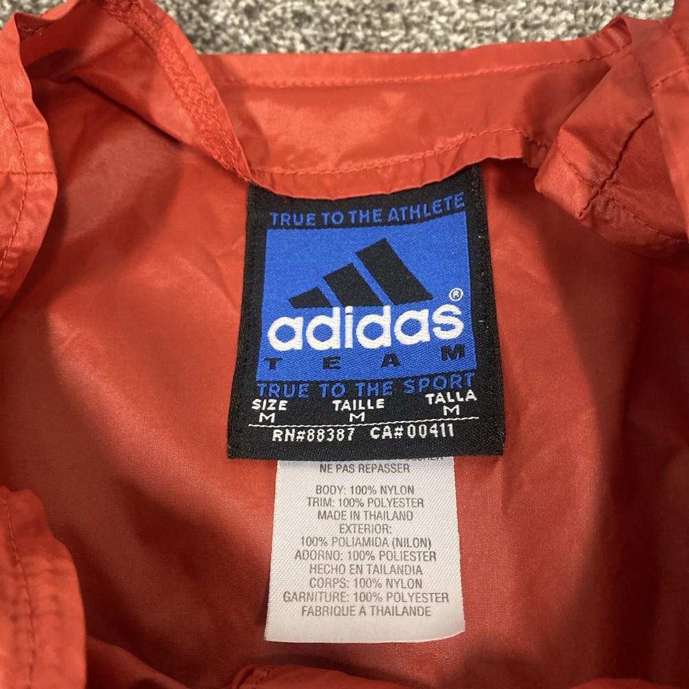 This vintage Adidas Wind Jacket is perfect for outdoor and athletic activities. The red solid-colored jacket is made of nylon and polyester, featuring embroidered logos and a 90s theme. It's a size medium and has a regular fit, suitable for walking, soccer, basketball, running, and jogging. The Adidas Windbreaker has all-season features and is wind-resistant, with insulation material made of polyester. The jacket is not handmade but is a product of Thailand. The Adidas Windbreaker is perfect for casual and travel occasions and is part of the Adidas Windbreaker product line.