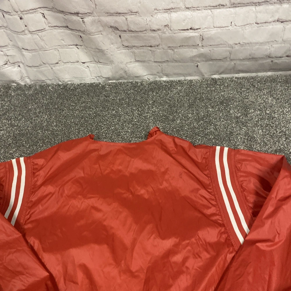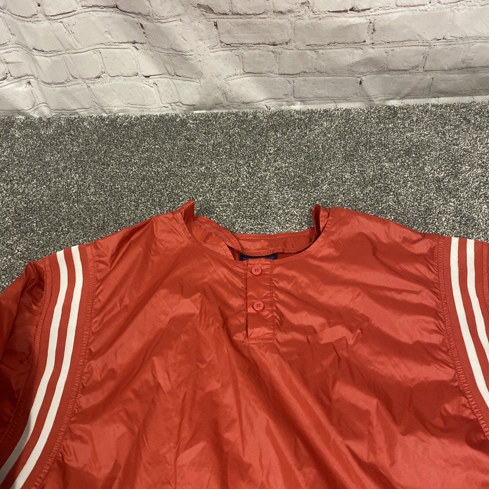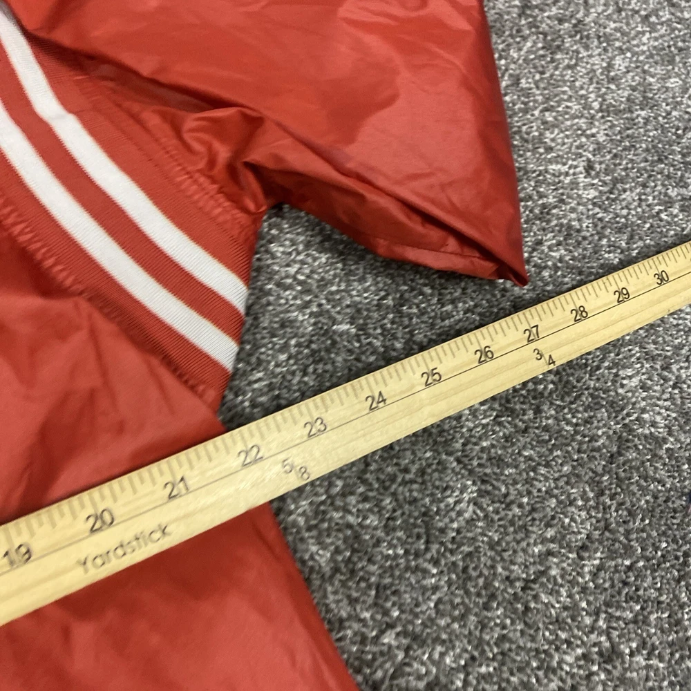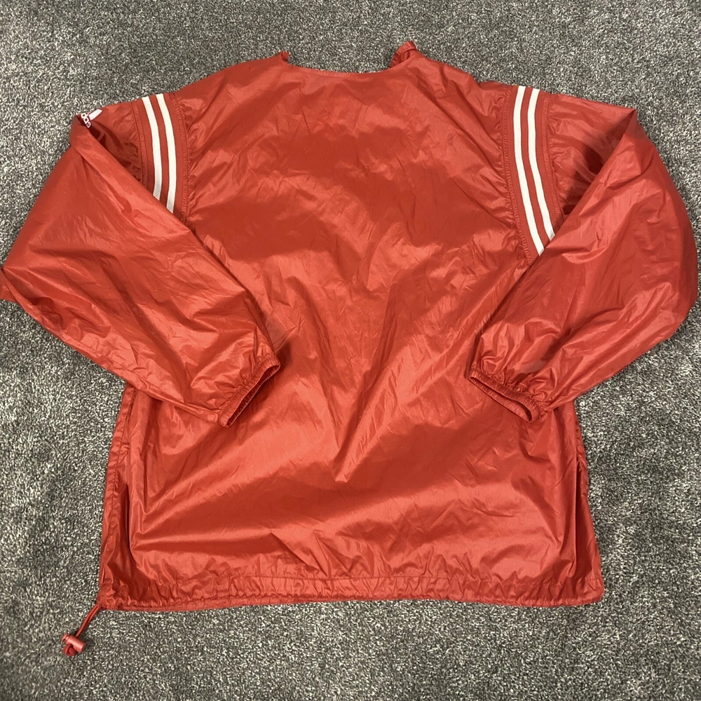 This vintage Adidas Wind Jacket is perfect for outdoor and athletic activities. The red solid-colored jacket is made of nylon and polyester, featuring embroidered logos and a 90s theme. It's a size medium and has a regular fit, suitable for walking, soccer, basketball, running, and jogging. The Adidas Windbreaker has all-season features and is wind-resistant, with insulation material made of polyester. The jacket is not handmade but is a product of Thailand. The Adidas Windbreaker is perfect for casual and travel occasions and is part of the Adidas Windbreaker product line.